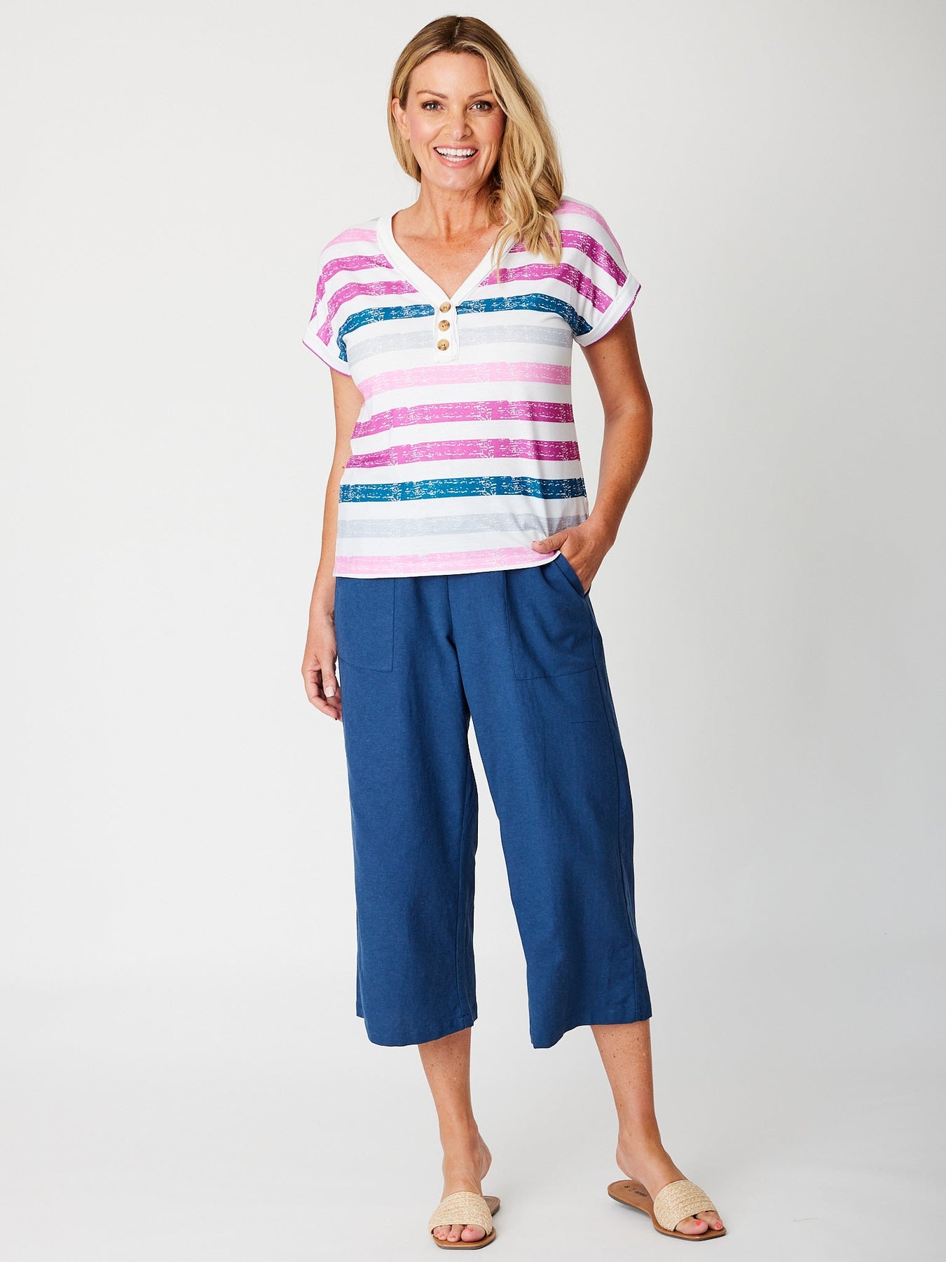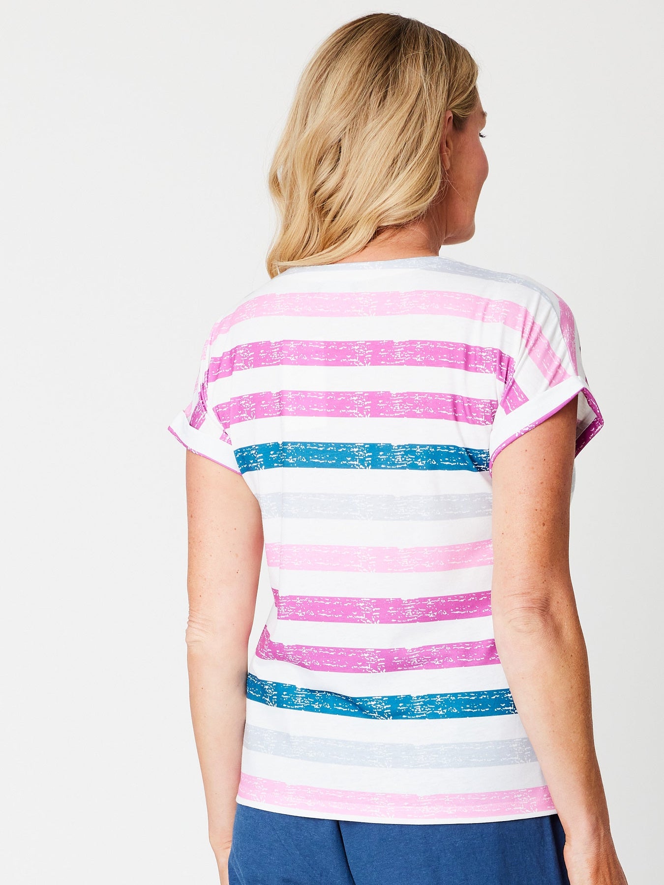 This fun short-sleeve tee features vibrant multi-coloured stripes accentuated by crisp white binding on the cuffs and neckline. The addition of three delicate buttons adds a subtle, elevated touch, making it perfect for both casual days and smarter outings. Comfortable and stylish, it’s a versatile wardrobe staple that brightens any look.