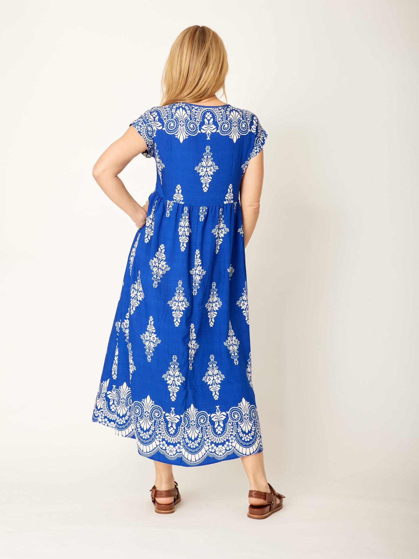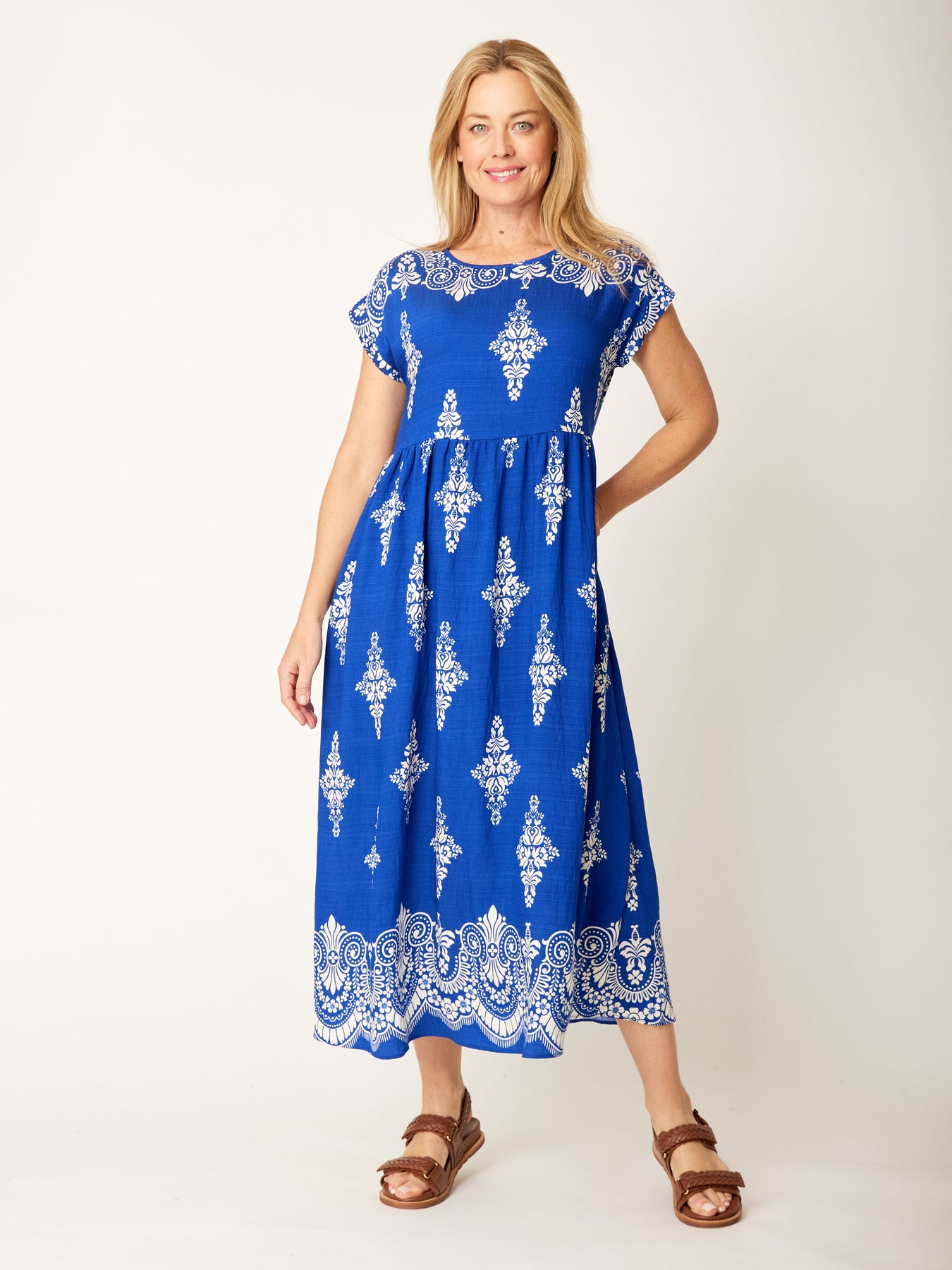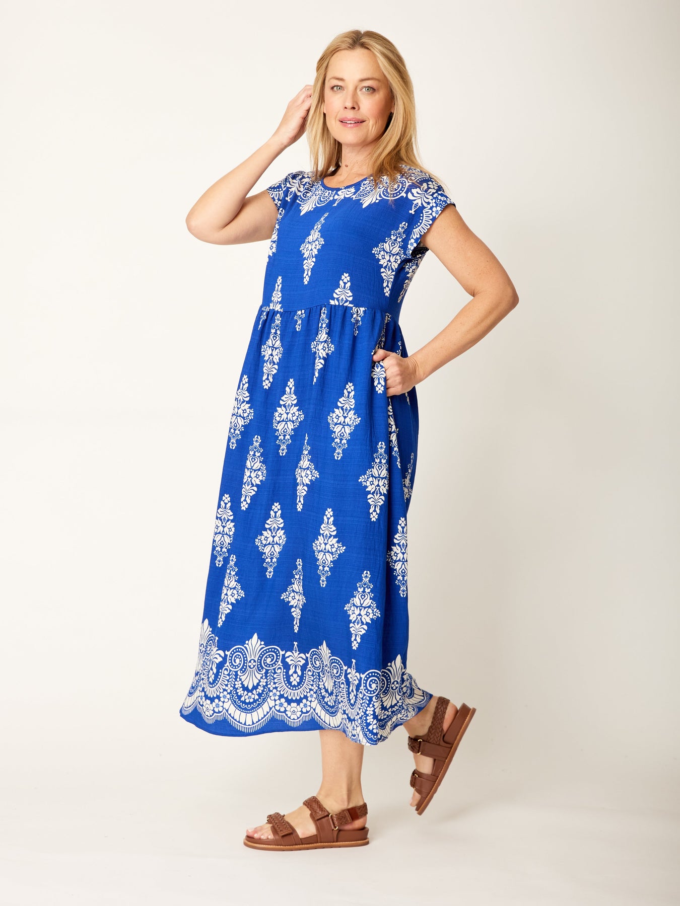 This stylish maxi dress features cap sleeves and a classic round neckline for an easy, flattering fit. Designed in a relaxed baby doll silhouette, it drapes beautifully for a comfortable and effortless look. The sharp, eye-catching print adds a bold touch, while the maxi length creates an elegant flow. Finished with practical side pockets, it’s the perfect throw-on-and-go piece for everyday wear with a hint of personality.