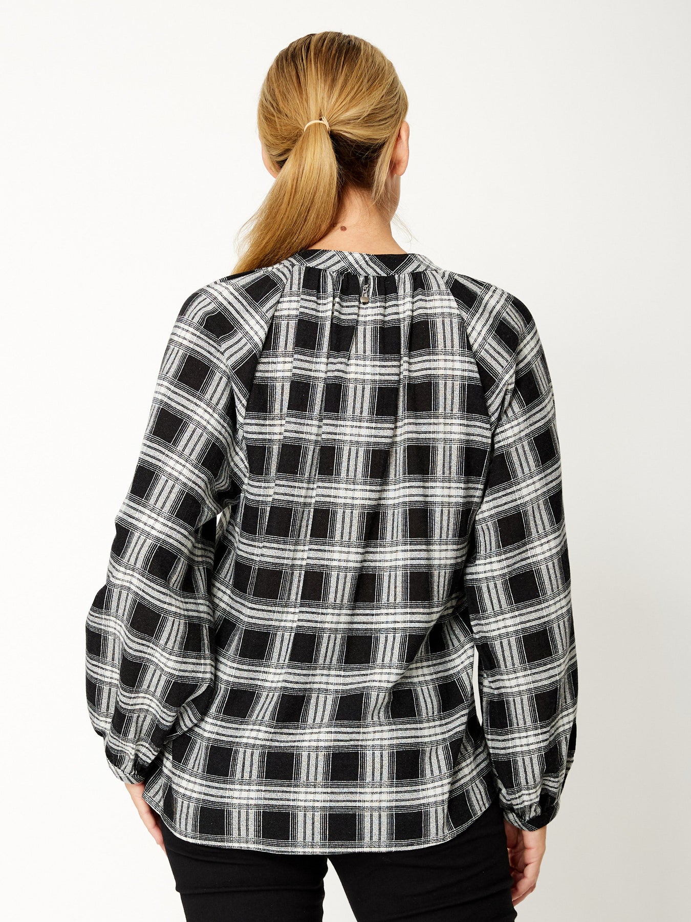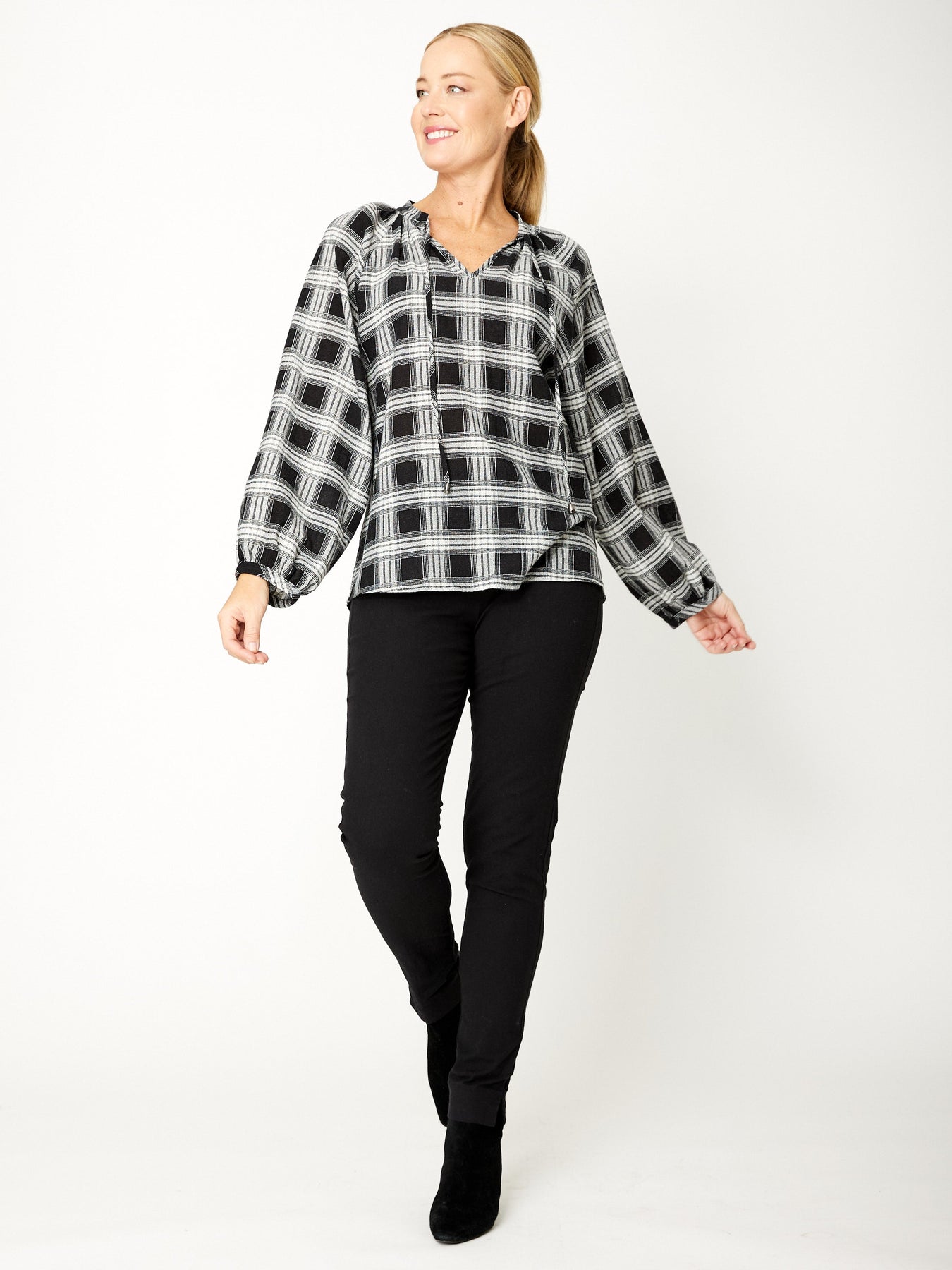 Effortless style meets timeless charm with this relaxed check peasant blouse. Featuring a classic tie neck detail and loose, flowing cuffs, it's designed for comfortable all-day wear. The soft check pattern adds visual interest while maintaining a versatile aesthetic that pairs beautifully with denim, skirts, or tailored trousers. Perfect for layering or wearing solo, this long-sleeve top brings an understated elegance to any wardrobe.