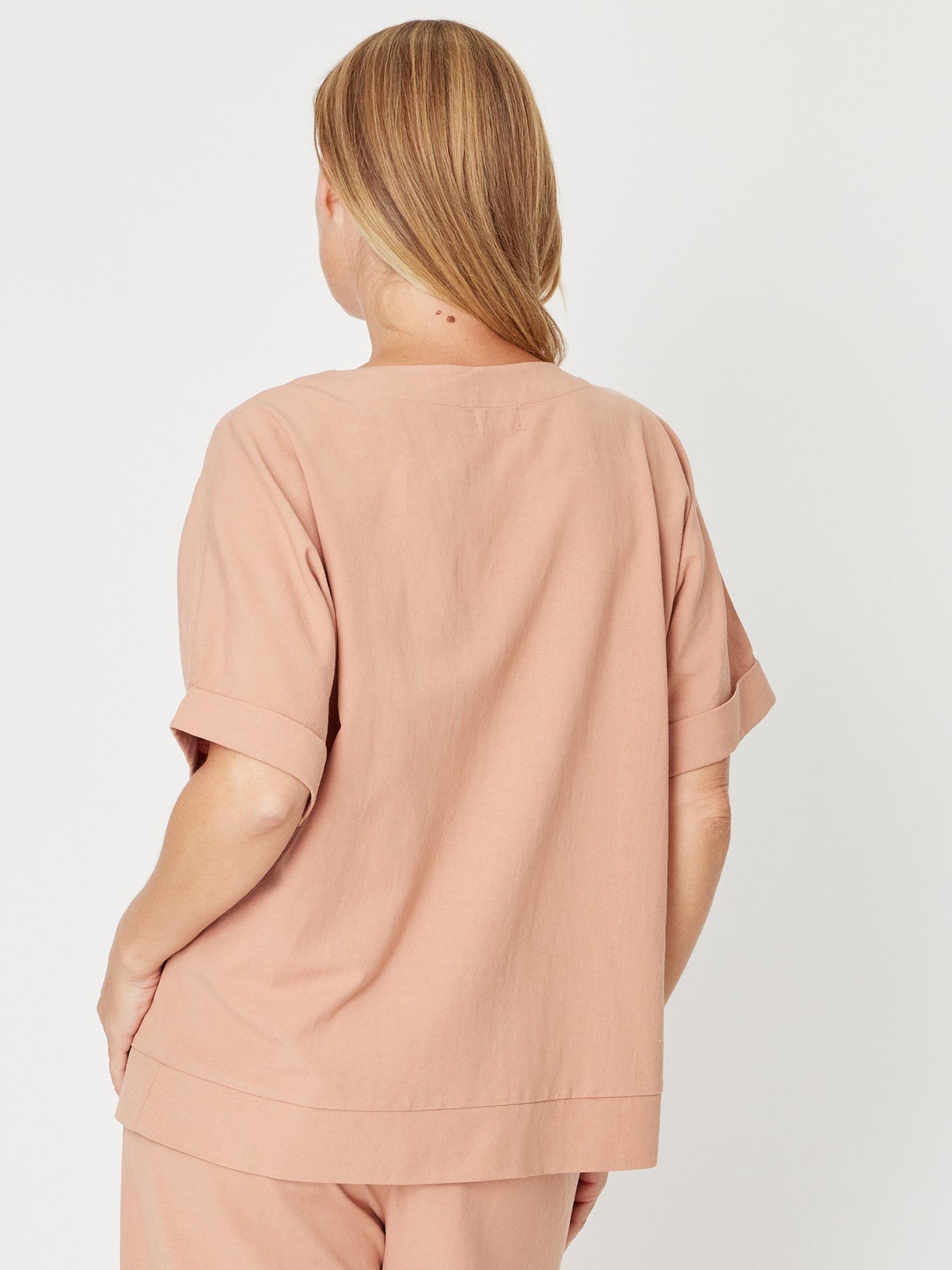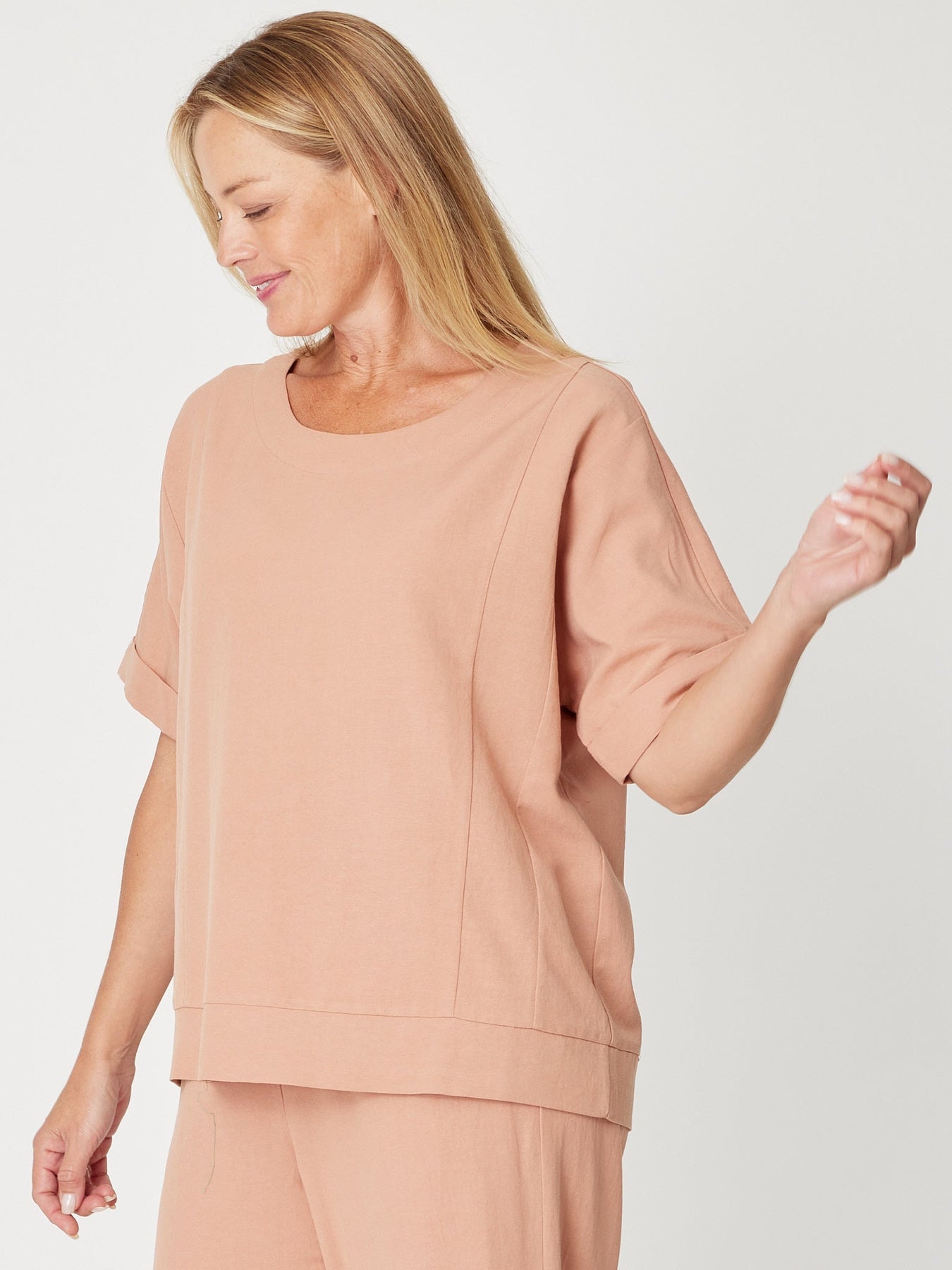 Experience effortless style with the Linen Shores Top in Apricot. Crafted from a breathable linen blend, this relaxed longer-line top features a flattering scoop neck and comfortable  extended short sleeves, perfect for warm days. Its airy fabric and easy fit make it an ideal choice for casual outings or layering, combining comfort and timeless elegance in one versatile piece.