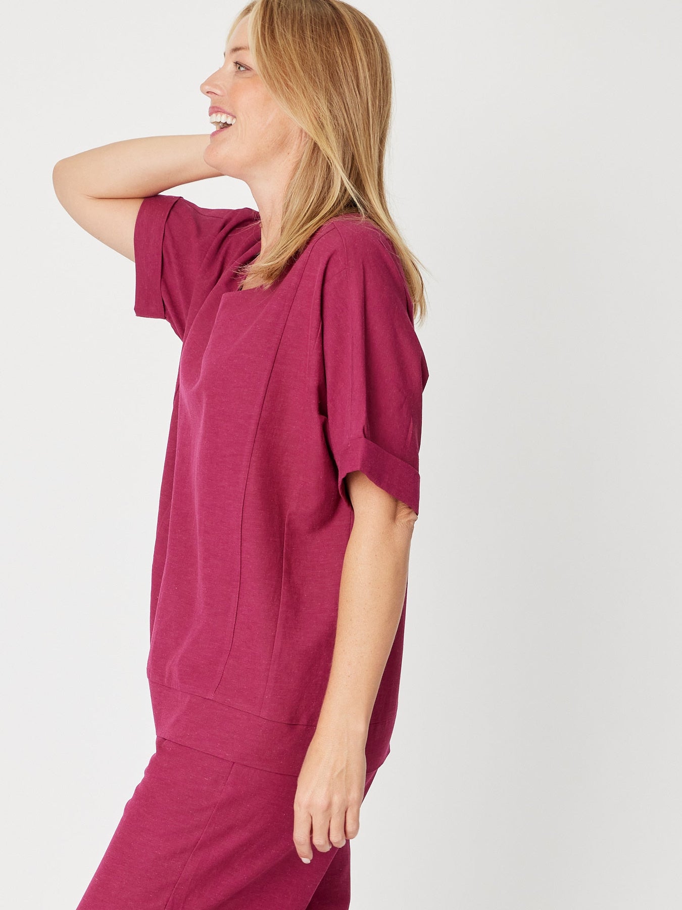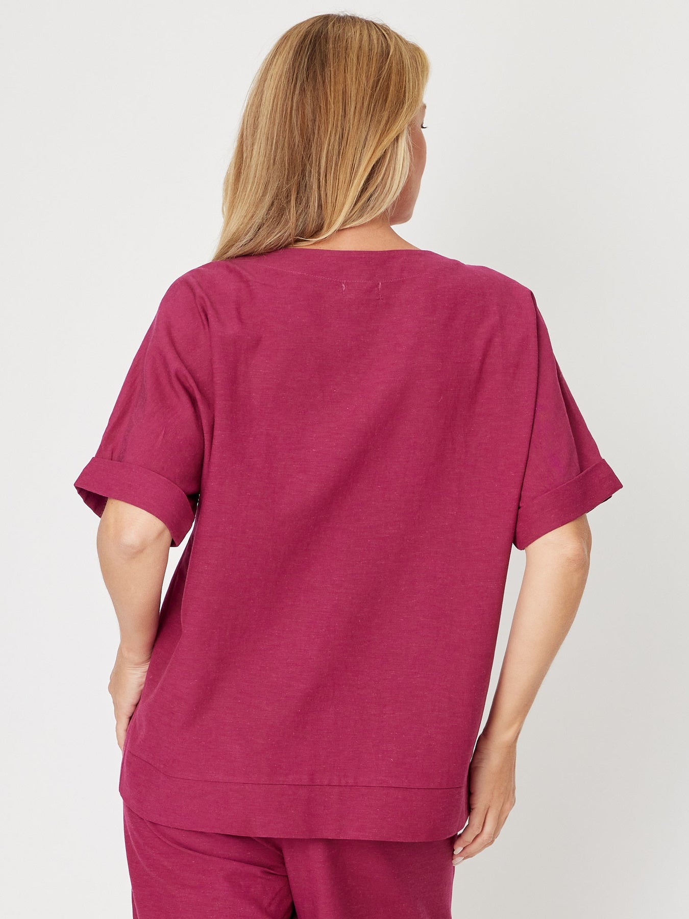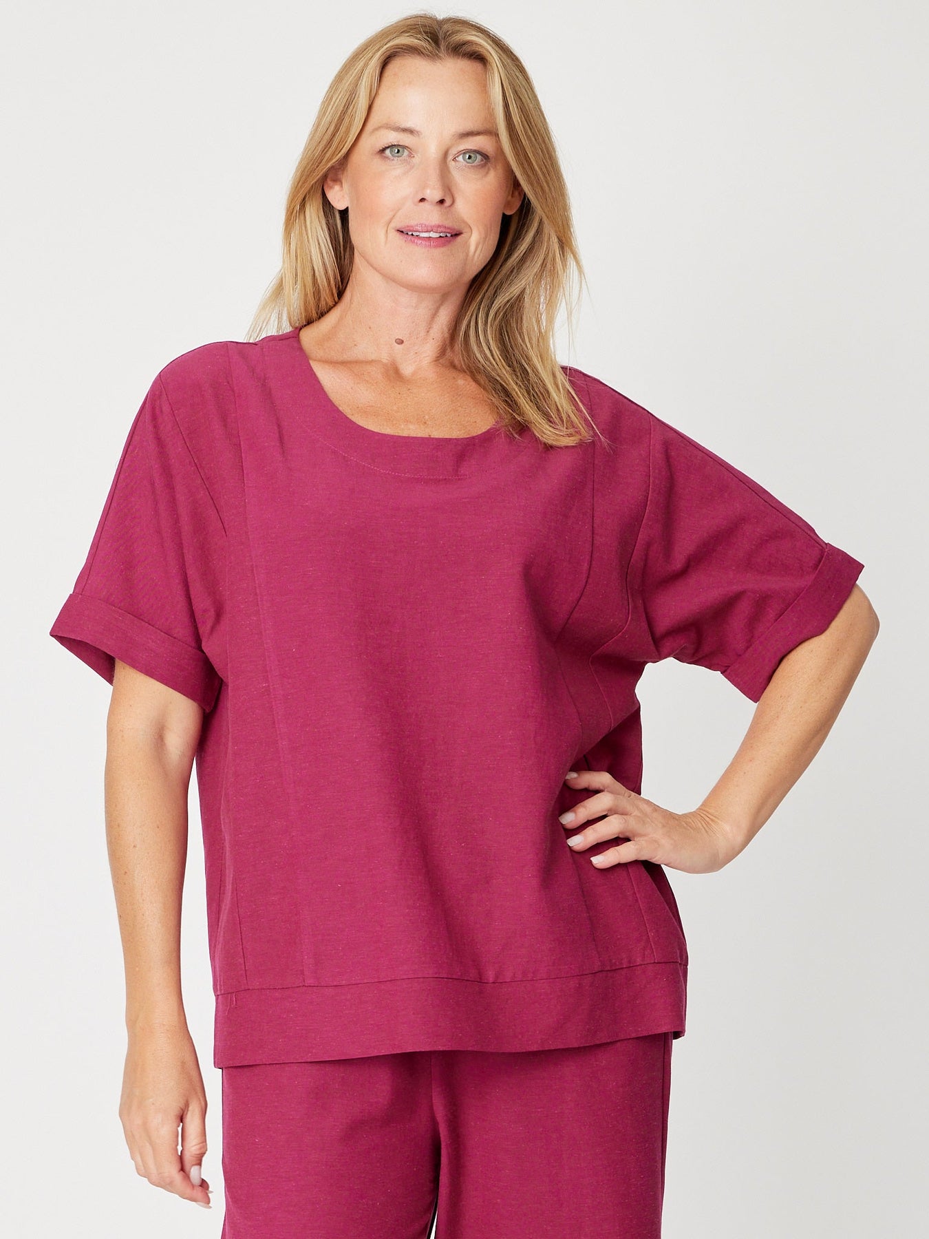 Experience effortless style with the Linen Shores Top in Berry. Crafted from a breathable linen blend, this relaxed longer-line top features a flattering scoop neck and comfortable extended short sleeves, perfect for warm days. Its airy fabric and easy fit make it an ideal choice for casual outings or layering, combining comfort and timeless elegance in one versatile piece.