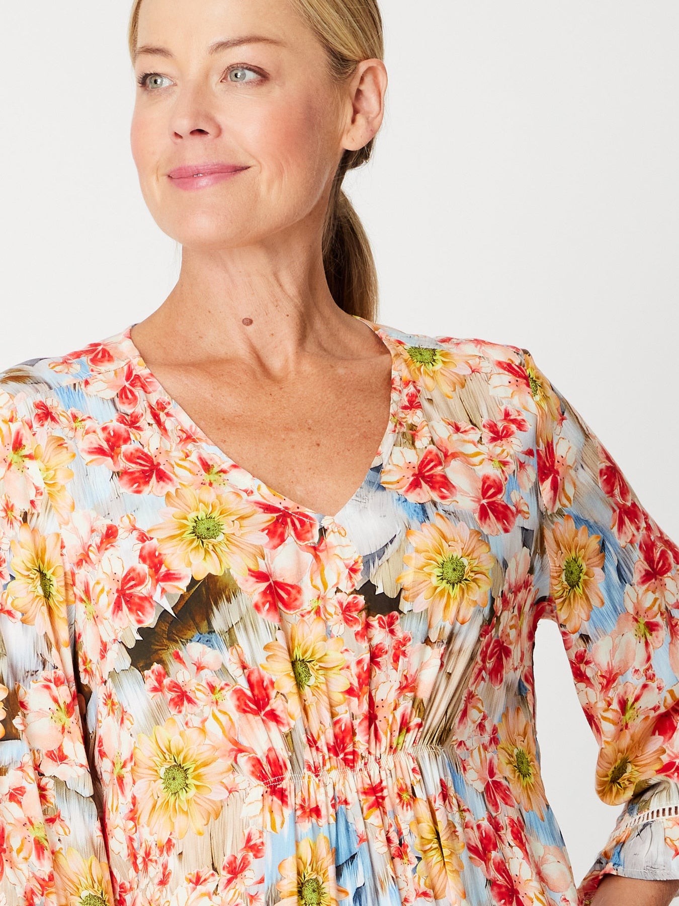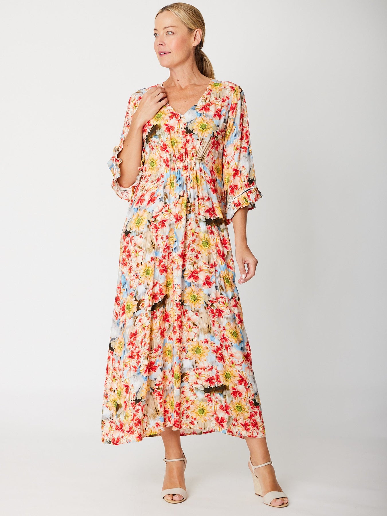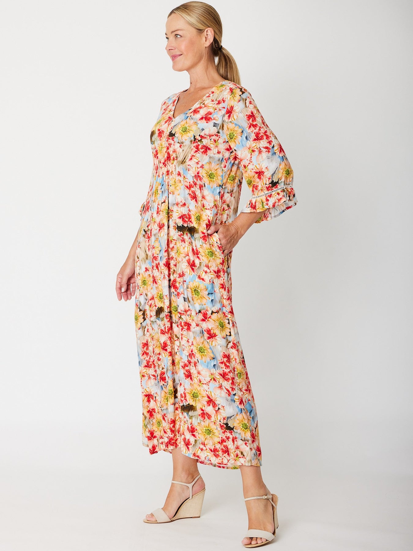 Elevate your everyday wardrobe with the Katie FLORAL V-Neck Dress, a versatile piece that effortlessly transitions from day to night. The flattering v-neckline and graceful 3/4 floaty sleeves create an elegant silhouette, while the vibrant floral print adds a touch of feminine charm. Practical side pockets keep your essentials within reach without compromising style. Perfect for casual outings, work events, or weekend gatherings, this dress combines comfort and sophistication in one stunning design.