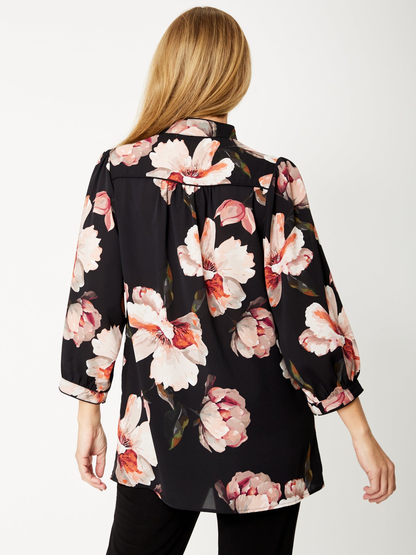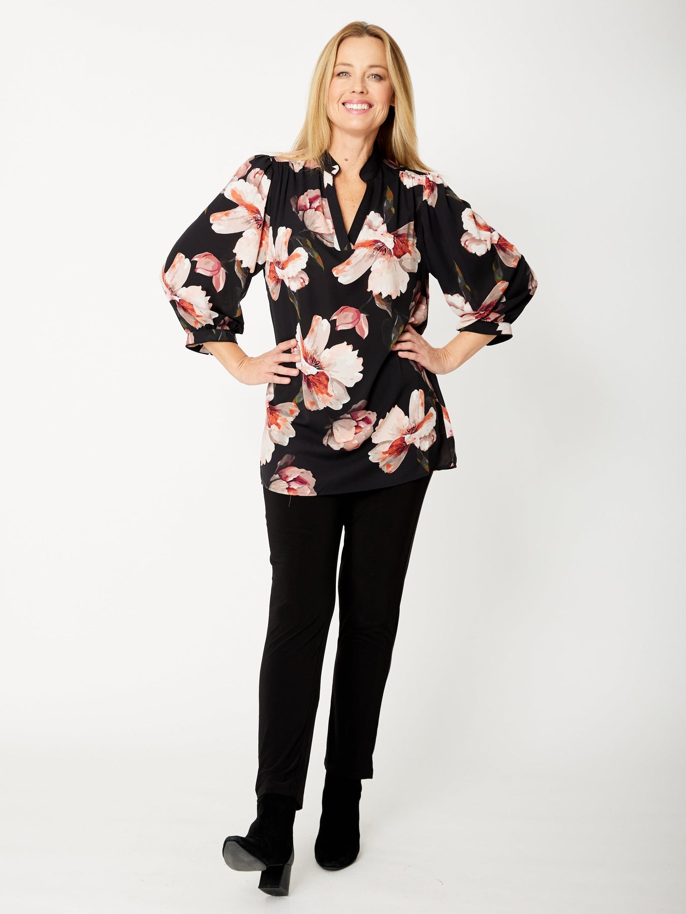Elevate your special occasion wardrobe with this stunning Wren Floral Top. Featuring a graceful Nehru neckline and flowing 3/4 length sleeves, this chiffon tunic delivers effortless elegance. The lightweight fabric drapes beautifully, making it perfect for celebrations, gatherings, or any moment that calls for refined style. A versatile piece that transitions seamlessly from day to evening wear.