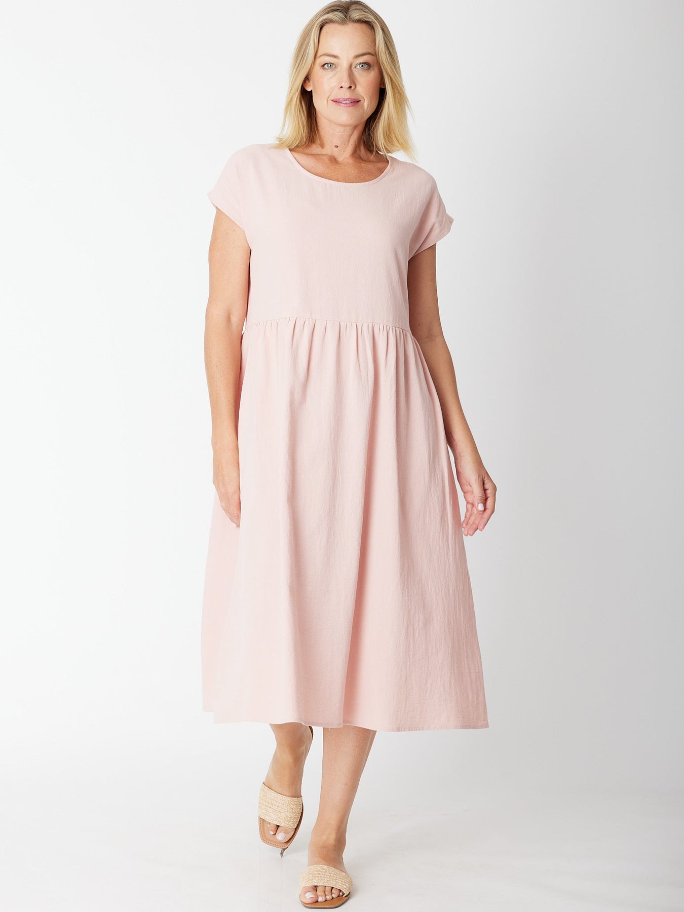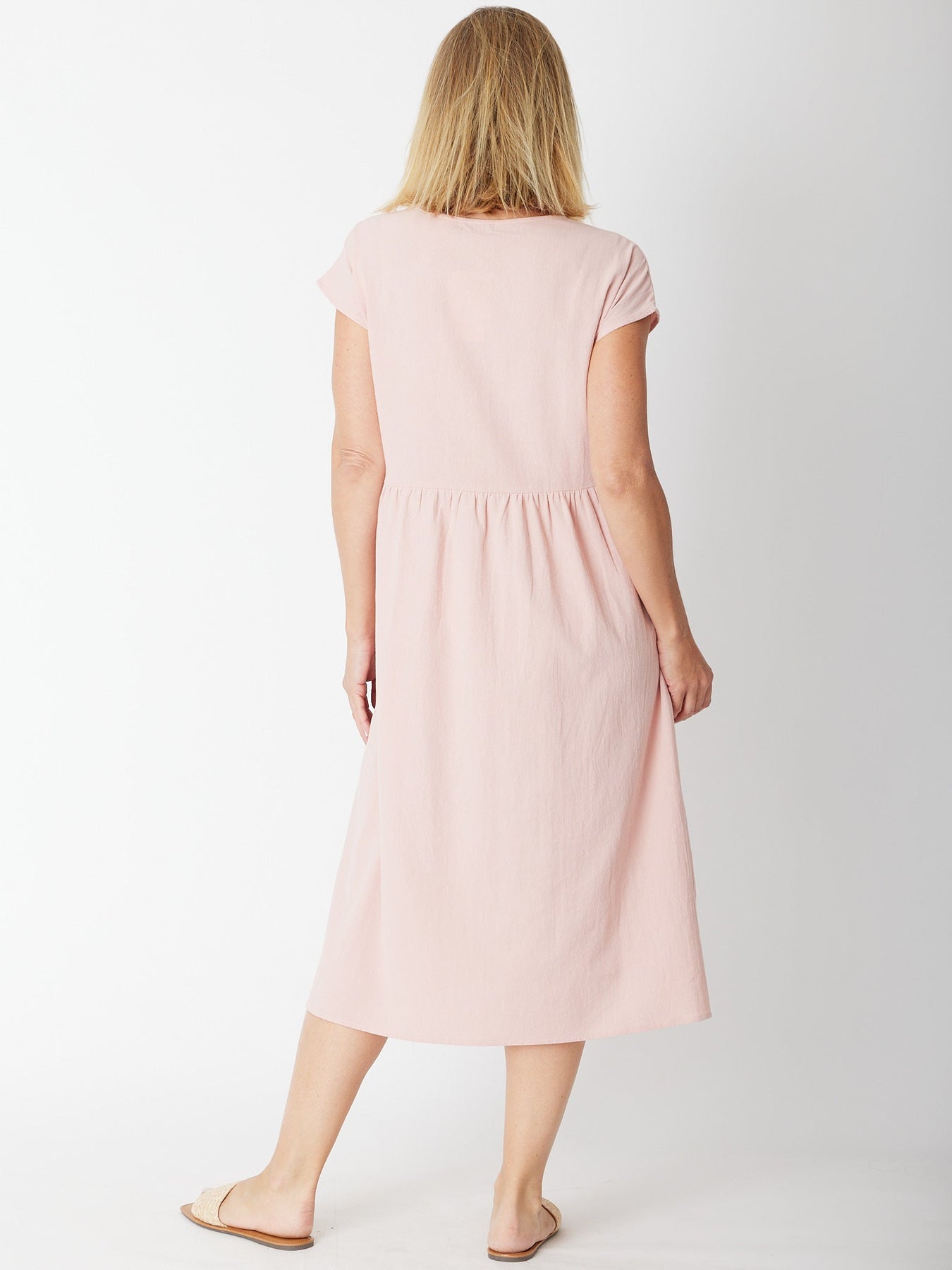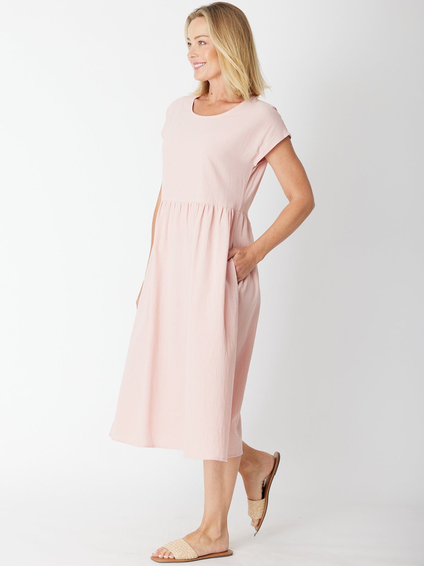 UPCYCLE Cotton Doll Dress is your perfect grab and go dress made from 100% cotton. With an extended cap sleeve, crew neck, and drop waist design, it flatters all shapes and sizes. Convenient pockets, mid length, and versatile styling options make it suitable for all heights and occasions. Cold wash and line dry make this dress easy to care for.
