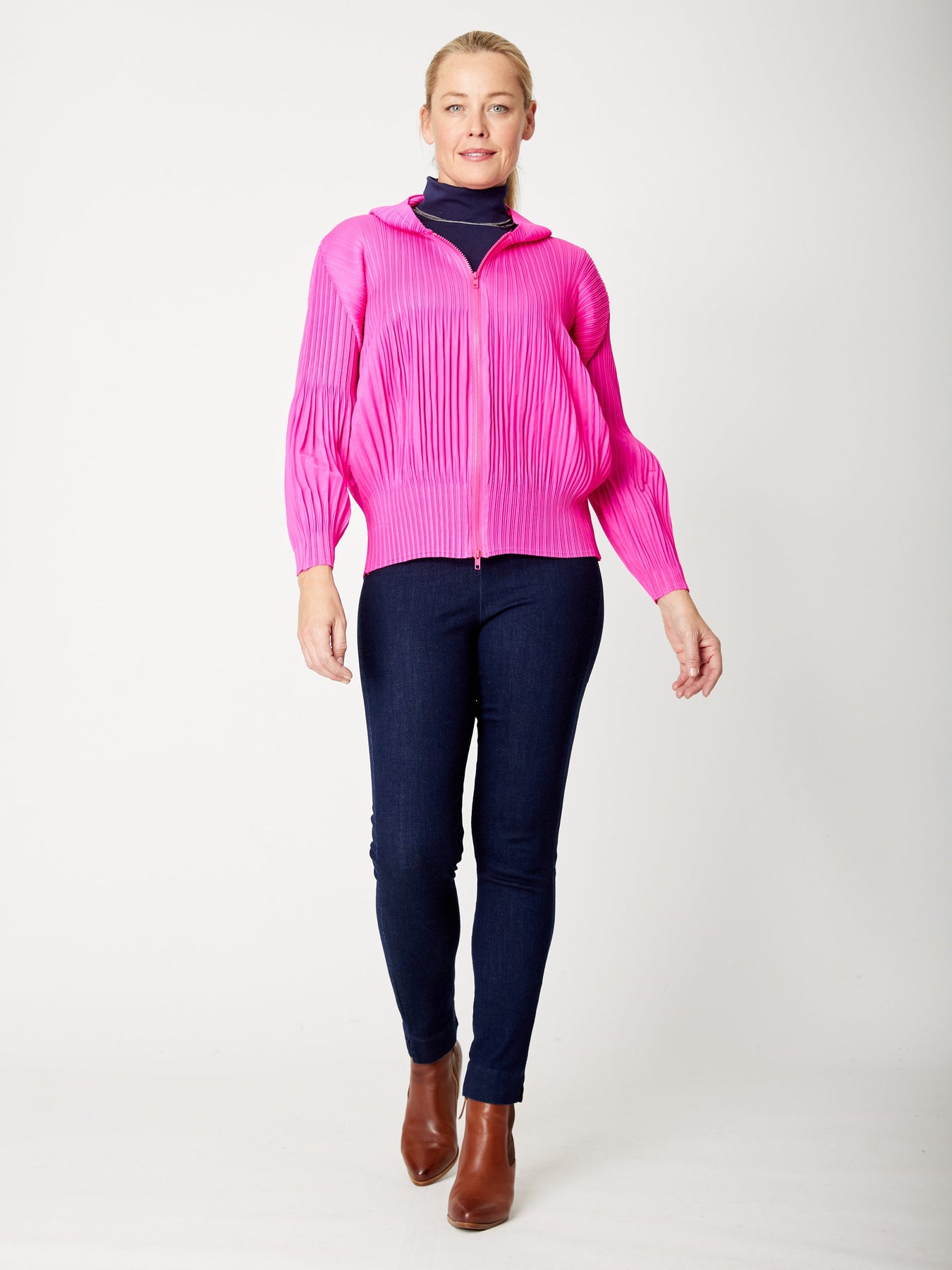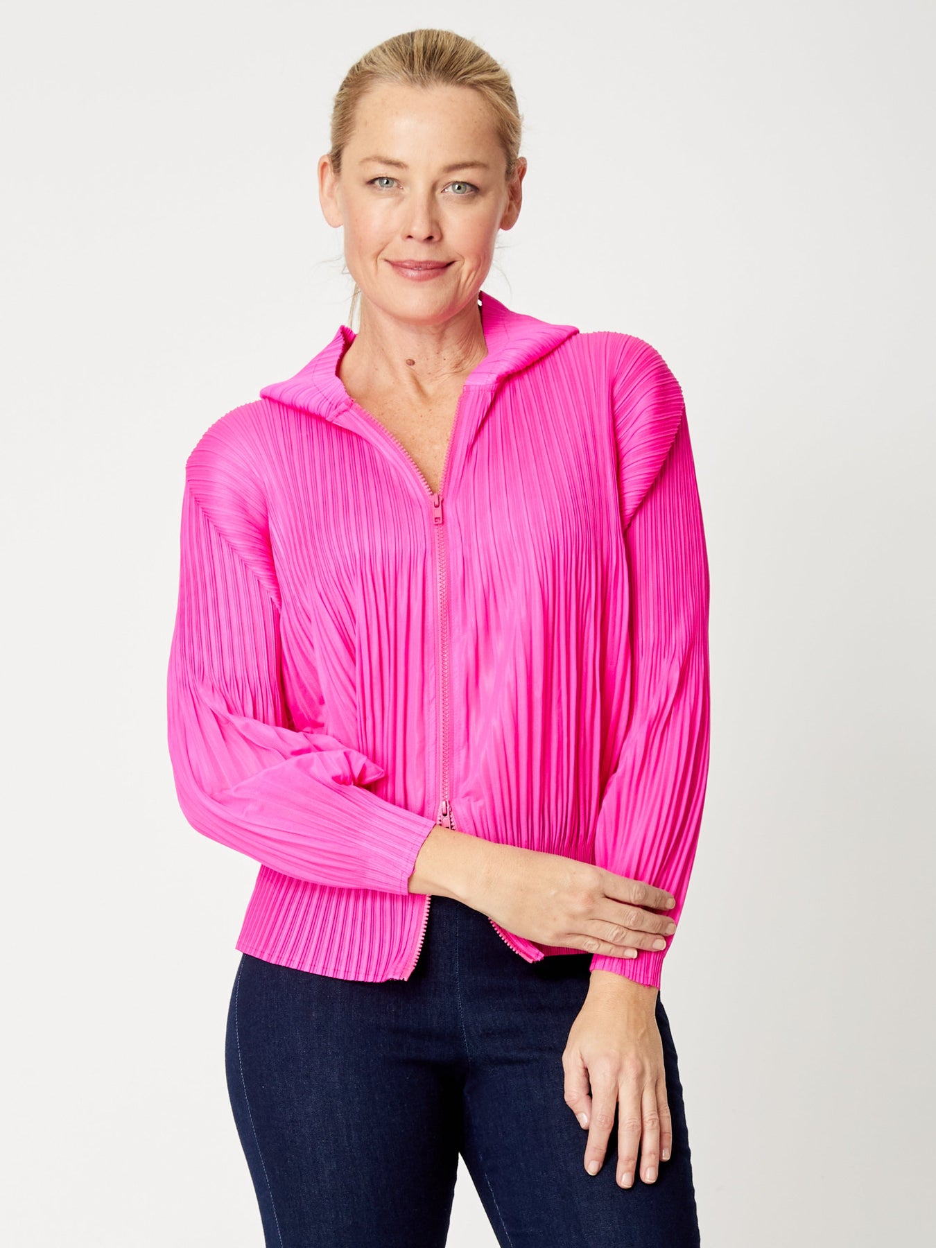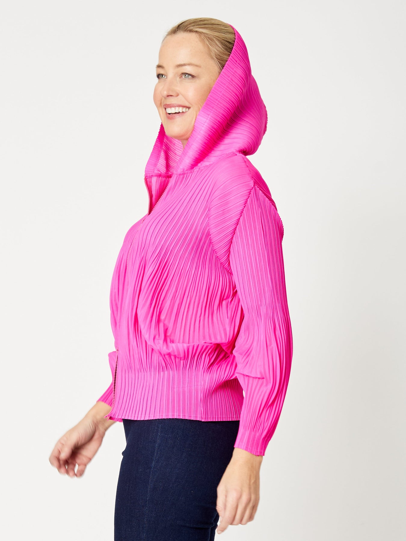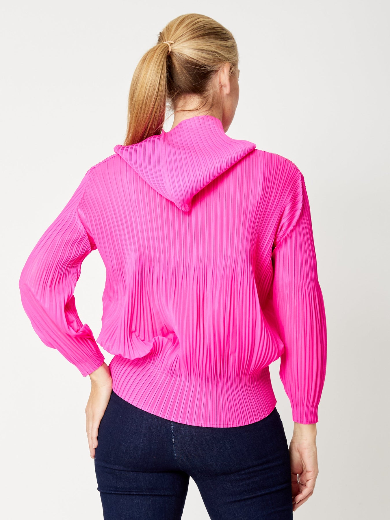 Elevate your casual wardrobe with this striking Crinkle Micro Pleated Hoodie in vibrant hot pink. Designed with a cropped silhouette and long sleeves, this piece offers the perfect balance of comfort and contemporary style. The full zip closure makes layering effortless, while the hood provides practical coverage on cooler days. The distinctive pleated texture adds visual interest and dimension to any outfit, making it an ideal choice for those seeking a standout piece that transitions seamlessly from day to night. Versatile, flattering, and undeniably chic. Crop length