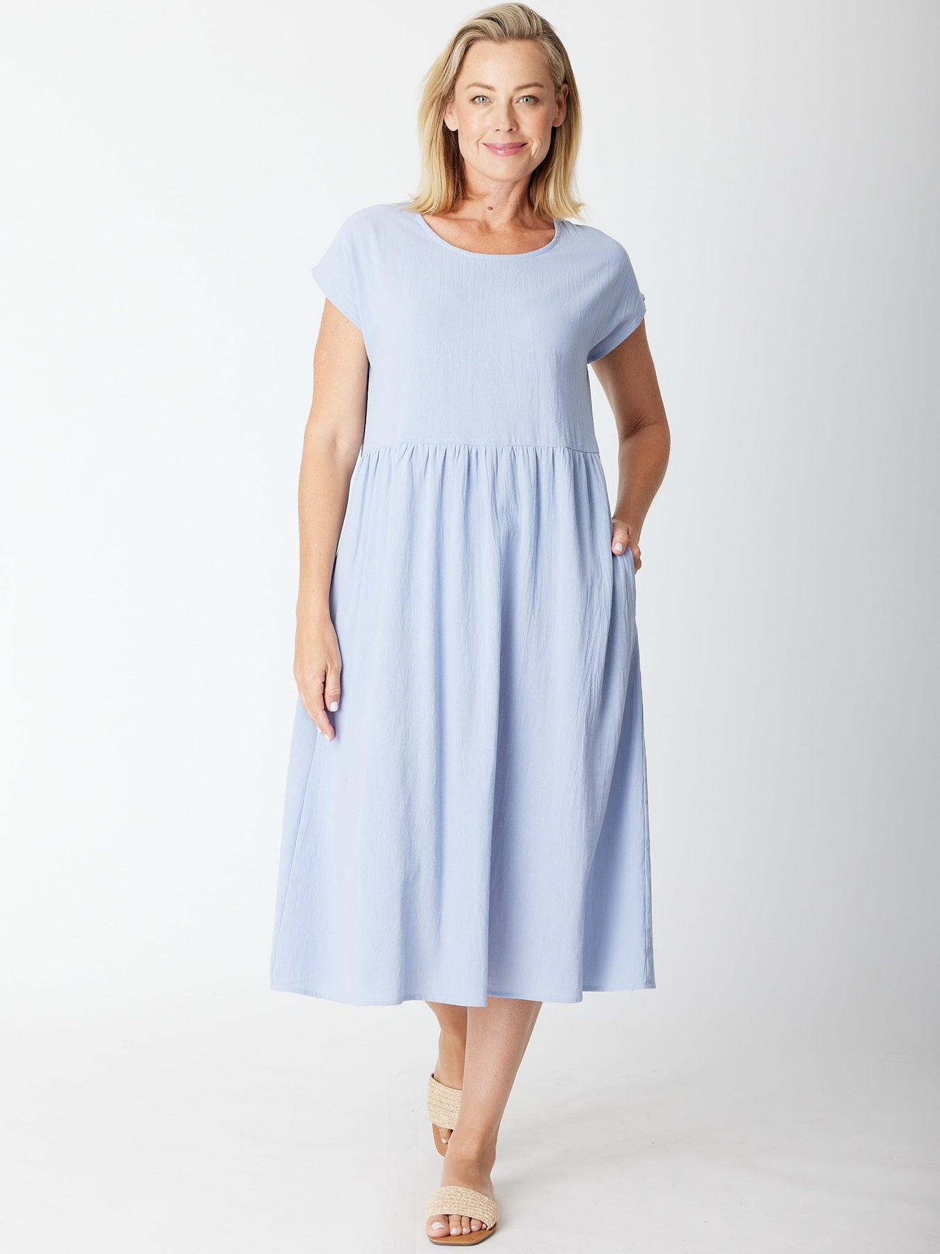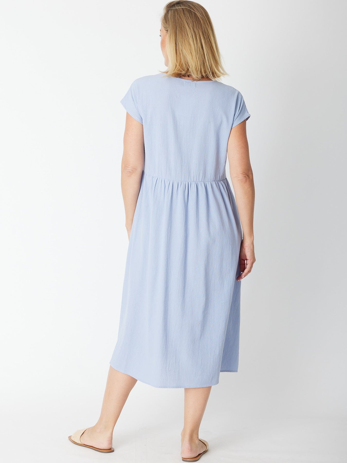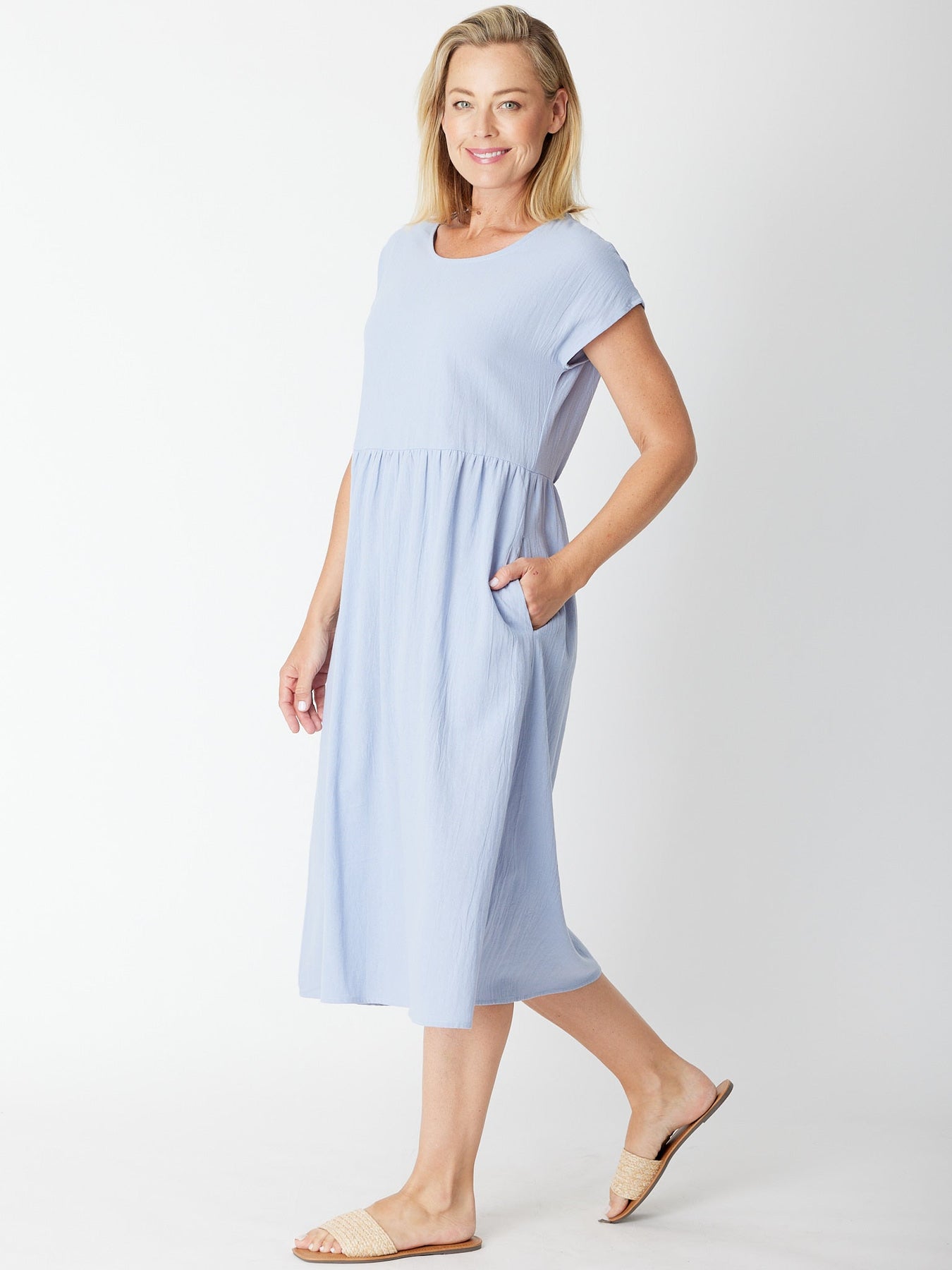 UPCYCLE Cotton Doll Dress is your perfect grab and go dress made from 100% cotton. With an extended cap sleeve, crew neck, and drop waist design, it flatters all shapes and sizes. Convenient pockets, mid length, and versatile styling options make it suitable for all heights and occasions. Cold wash and line dry make this dress easy to care for.