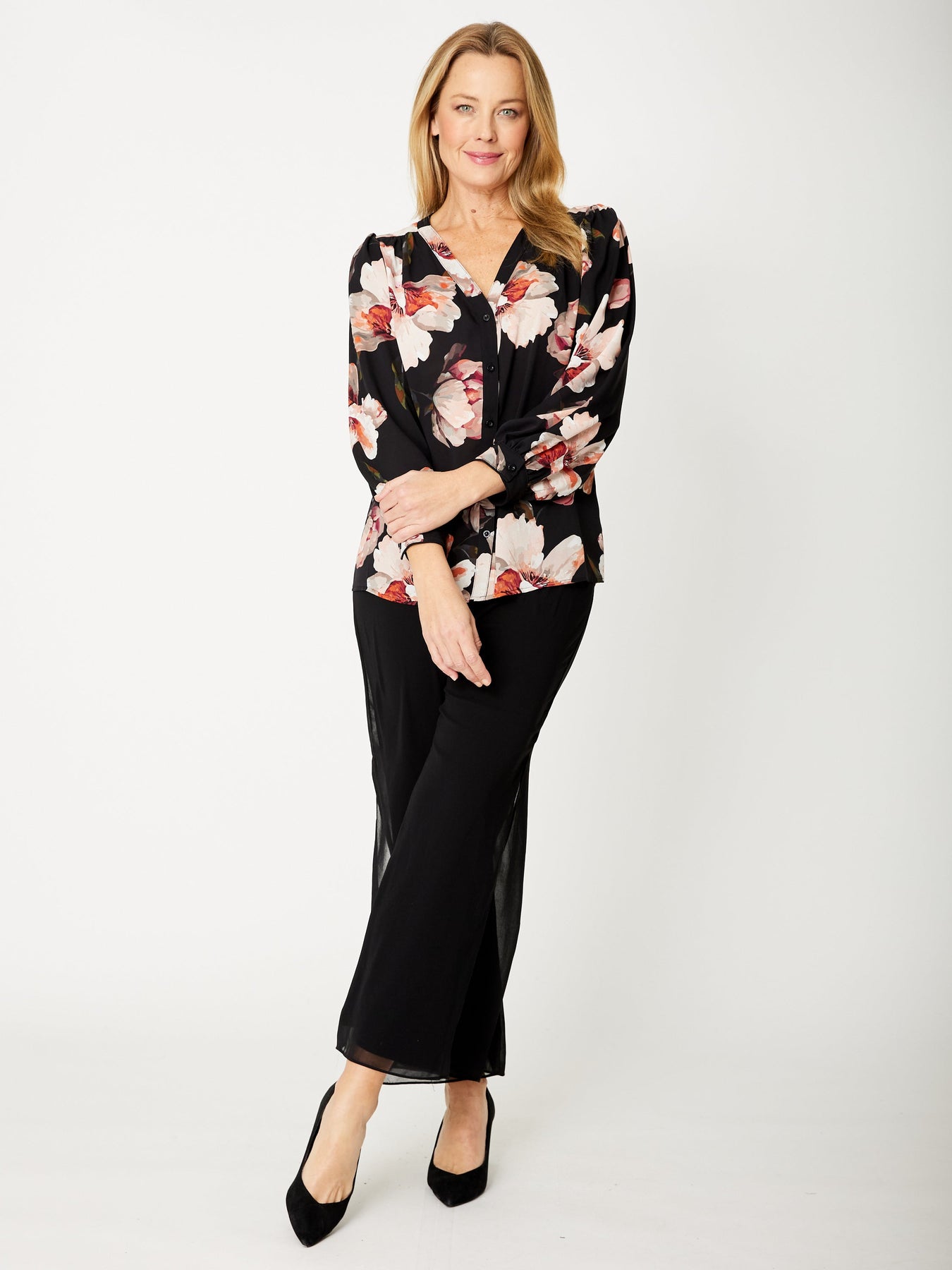The Wren Shirt is a timeless piece designed for those special moments. Crafted from soft chiffon, this long sleeve vee neck shirt features a classic button-through front and beautifully relaxed sleeves that drape with effortless elegance. The flattering neckline and flowing fabric create a refined silhouette perfect for dressing up or down. Ideal for occasions that call for understated sophistication and comfort.
