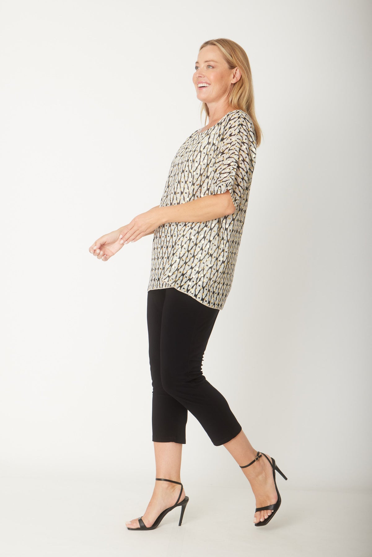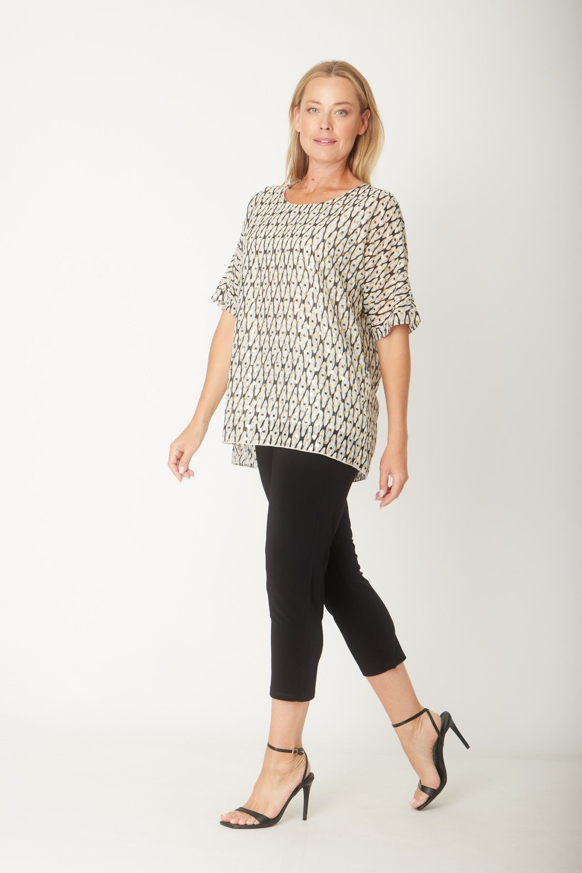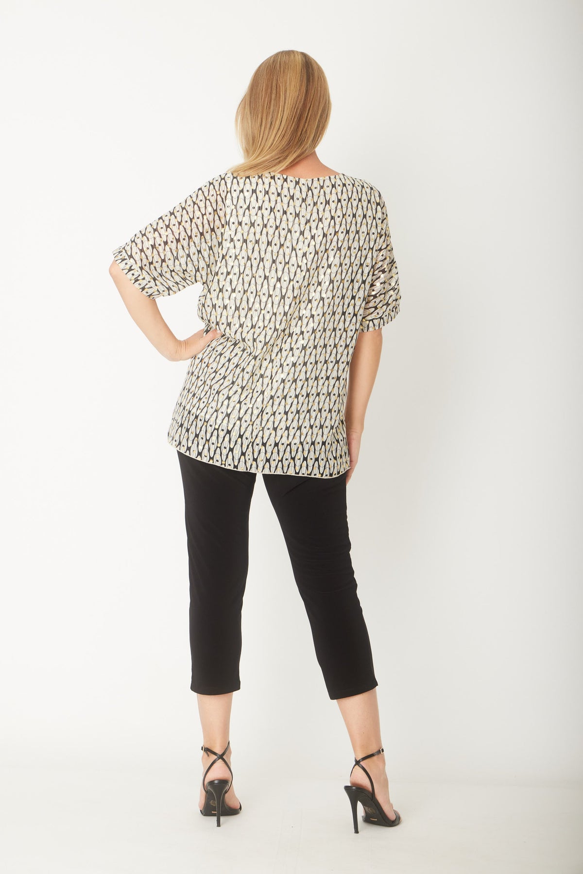 Crafted from premium chiffon with elegant gold foil detailing, this Asha top combines style and comfort effortlessly. The flattering mid-length sleeves and soft rayon lining ensure a cool, breathable feel all day. Perfect for adding a touch of sophistication to any outfit.