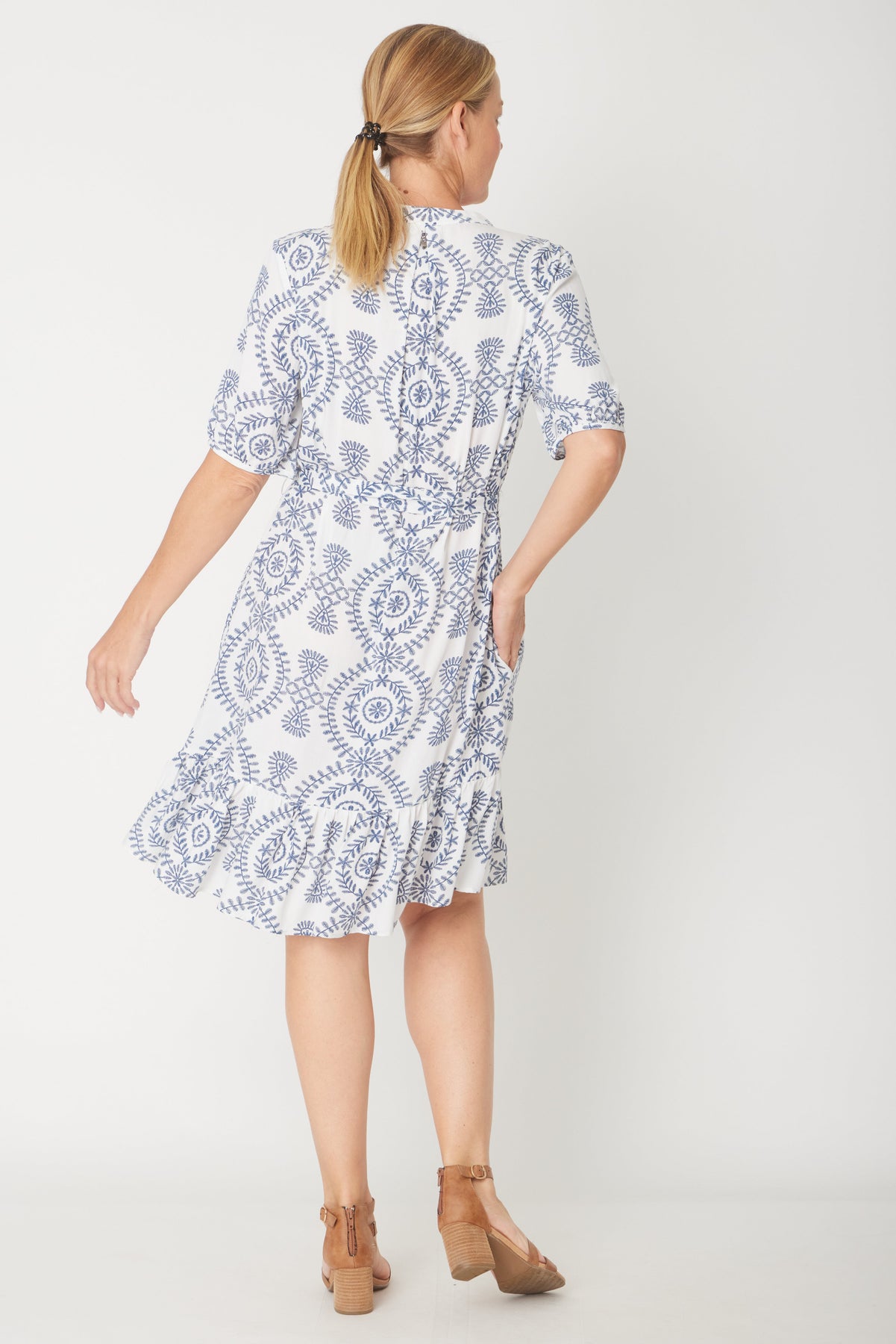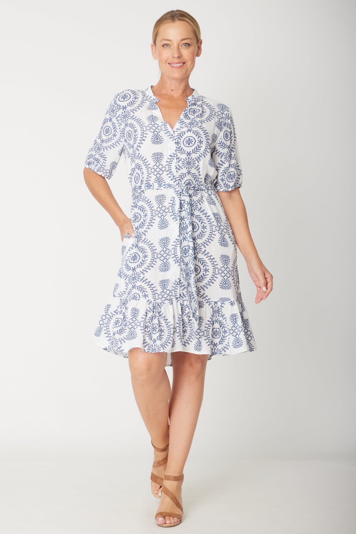 Elevate your everyday wardrobe with this stunning Nehru-style button dress, crafted from breathable rayon for all-day comfort. Featuring classic elbow-length sleeves and a flattering knee-length cut, this versatile piece transitions seamlessly from casual outings to relaxed social gatherings. The crisp white and navy colourway offers timeless appeal that pairs effortlessly with your existing pieces. Perfect for warm weather, the cool rayon fabric keeps you feeling fresh and composed throughout the day. A contemporary take on traditional styling that delivers both sophistication and ease.