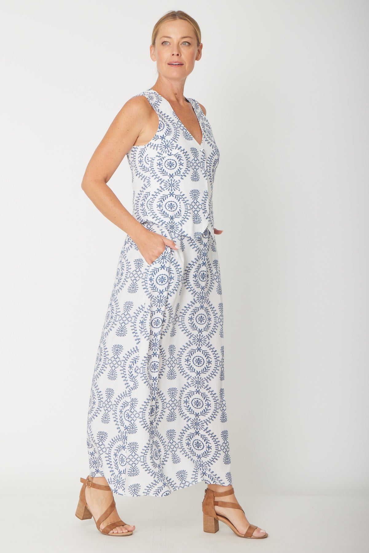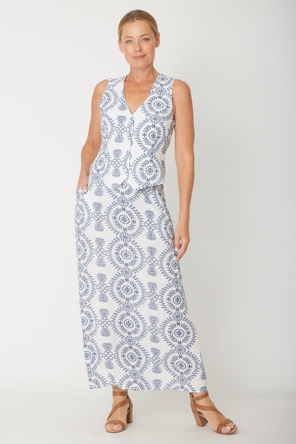 This season's must-have bandana button vest combines effortless style with versatile wear. Designed to be bra-friendly, wear it buttoned for a polished look or leave it open over a tee for casual appeal. The classic white and navy colourway pairs seamlessly with the matching skirt for coordinated elegance, or style it with jeans, denim pants, or shorts for everyday versatility. Whether you're dressing up or down, this on-trend piece adapts to your wardrobe and mood.