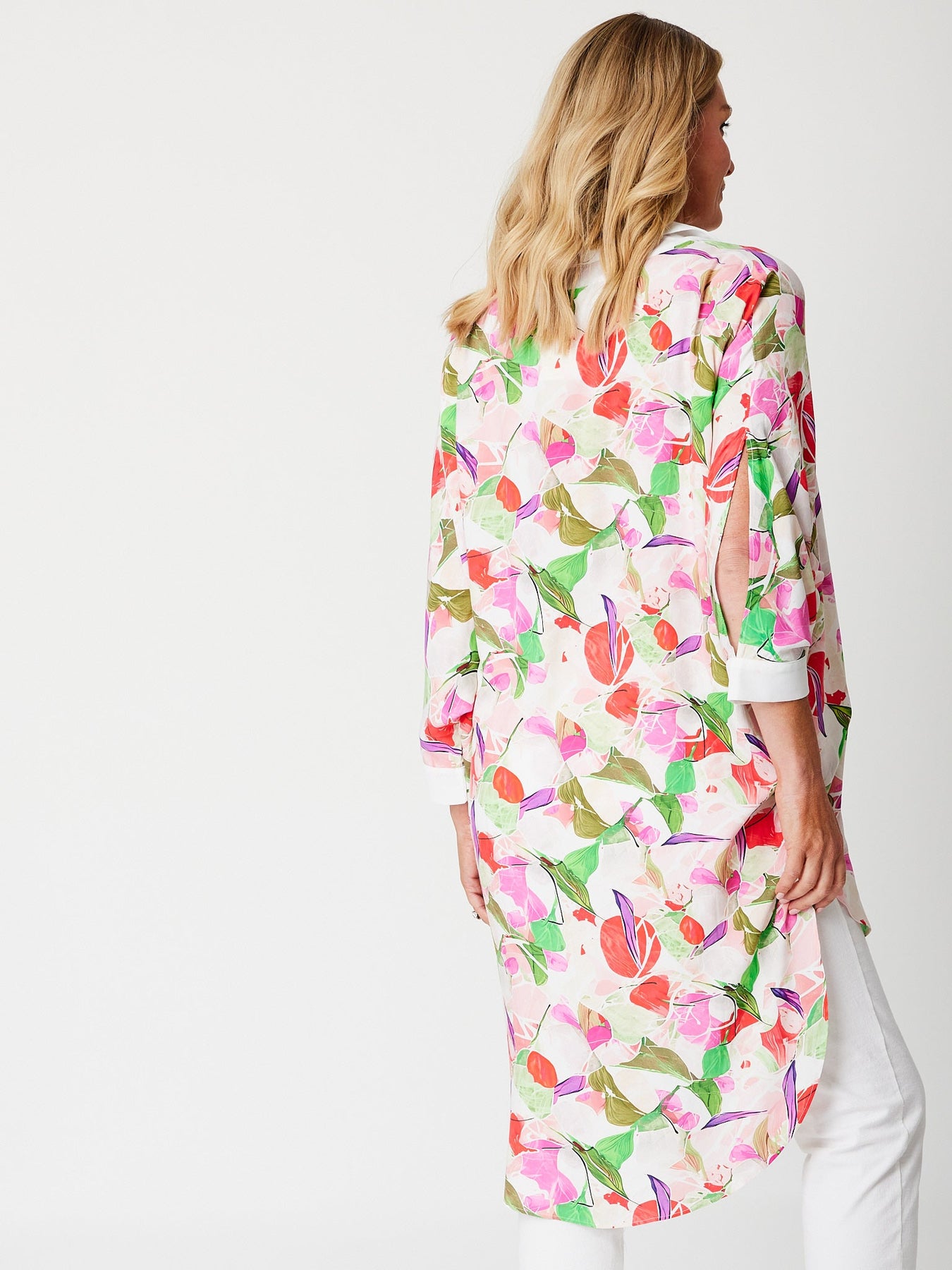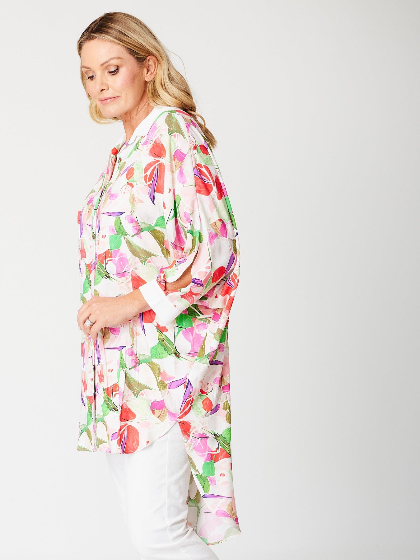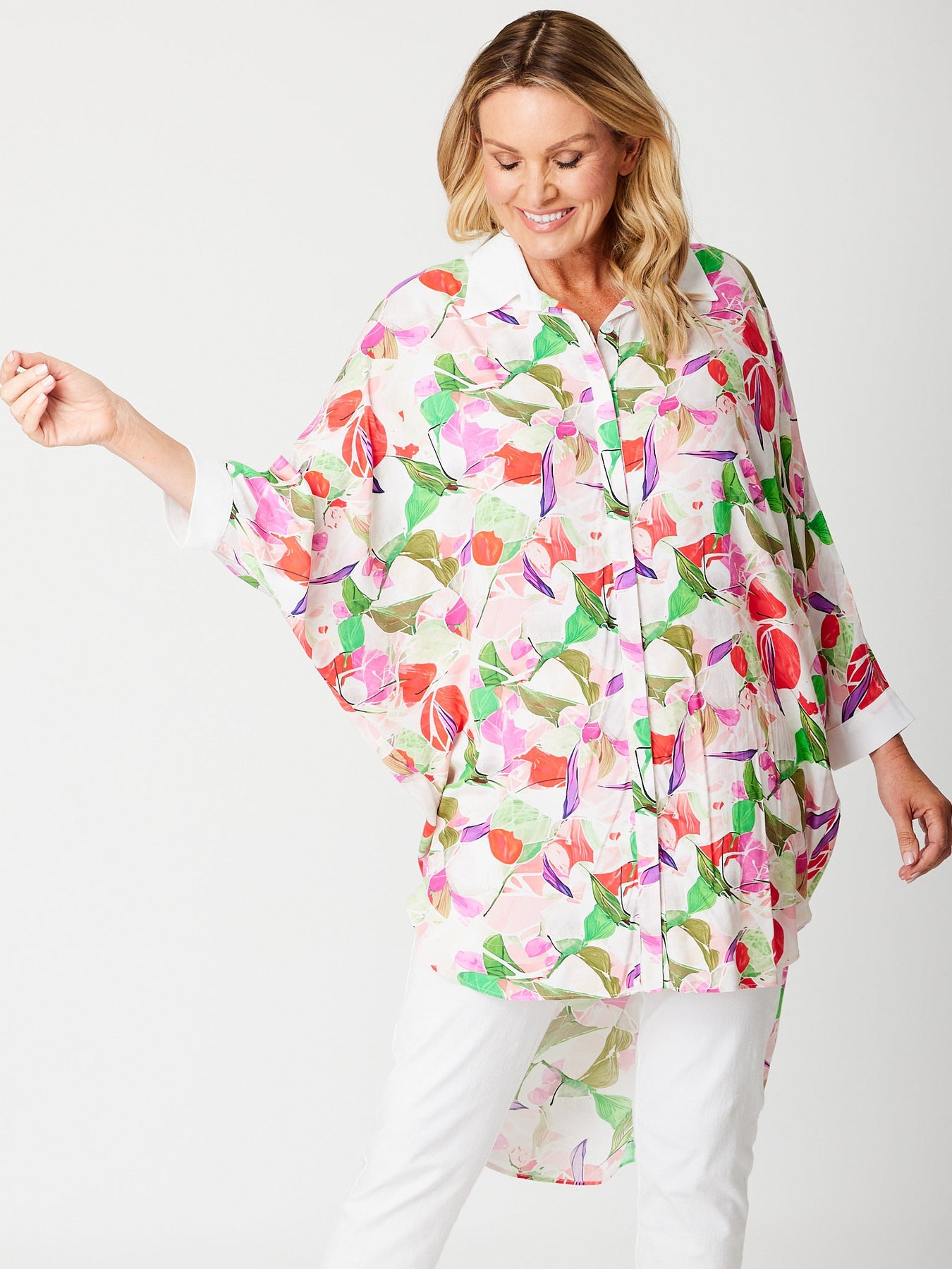 Effortless elegance meets summer style with this rayon batwing tunic shirt. The dramatic batwing sleeves create a flattering silhouette, while the contrast white collar and cuffs add crisp sophistication. Cut higher at the front and longer at the back for a modern, flattering drape that works beautifully over pants or as a chic beach cover-up. Perfect for poolside glamour or casual seaside getaways, this versatile piece transitions seamlessly from day to evening wear.
