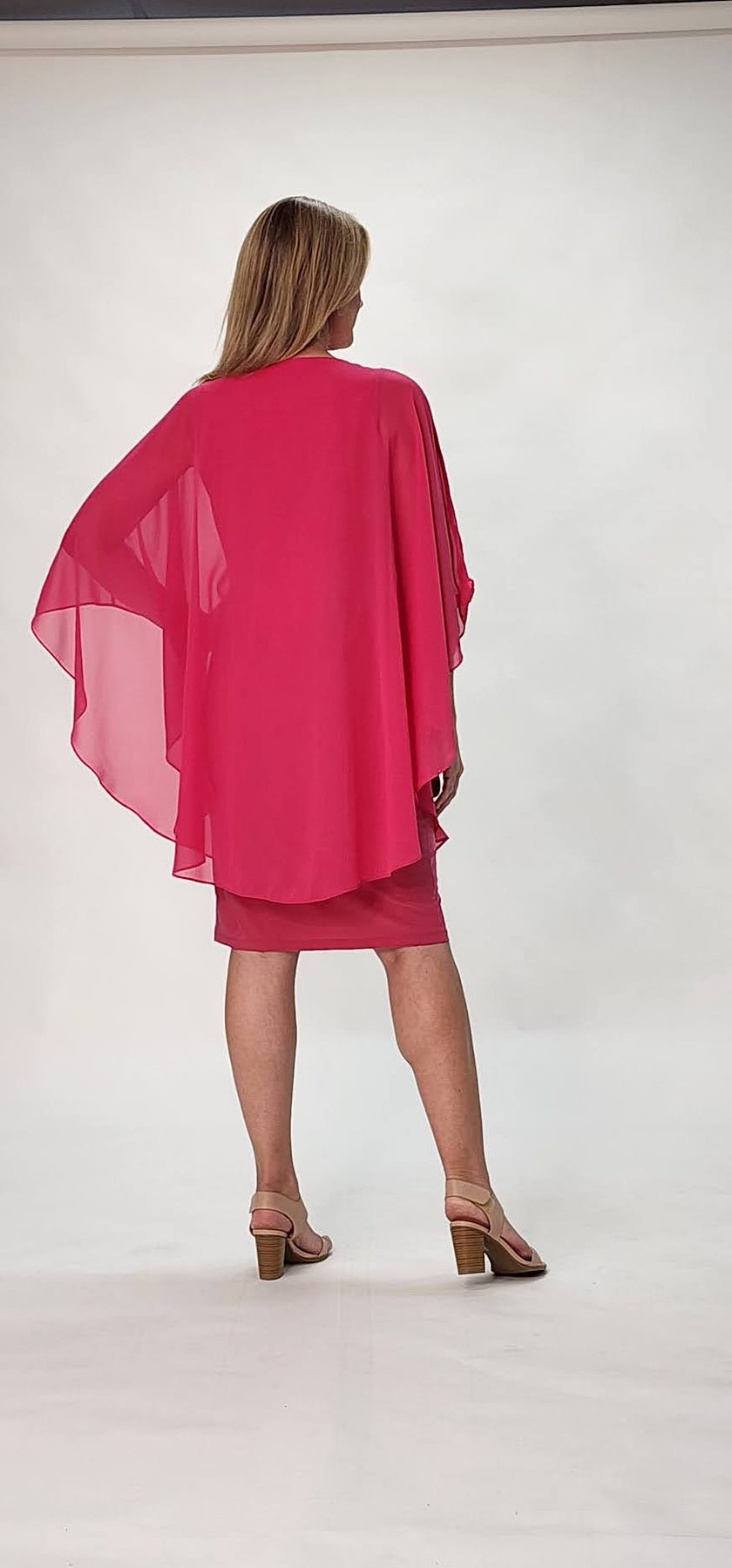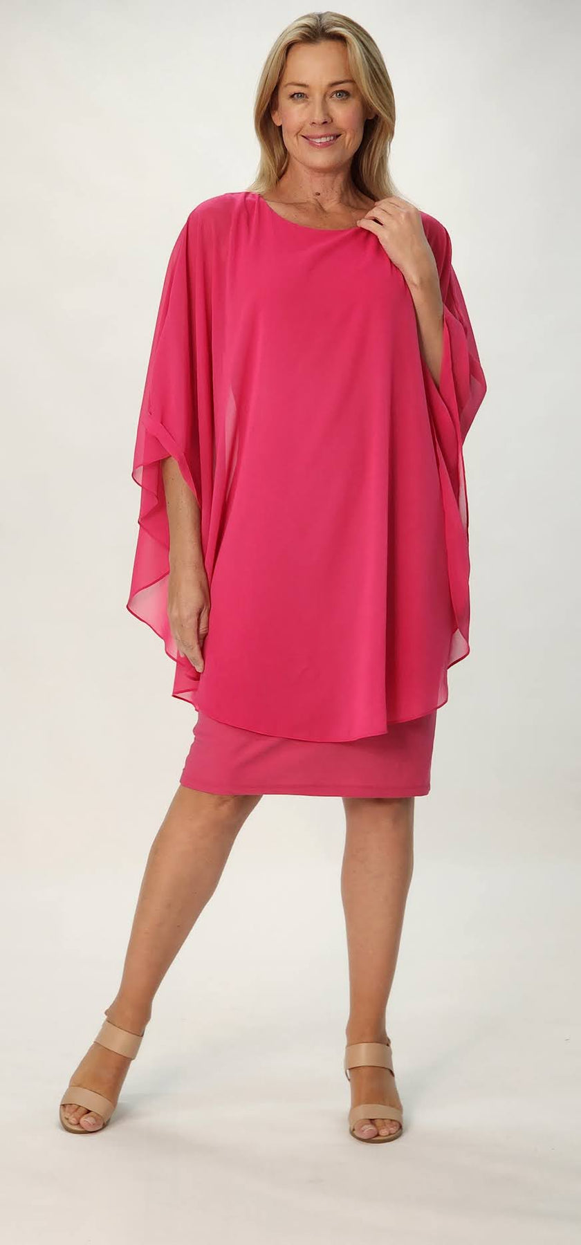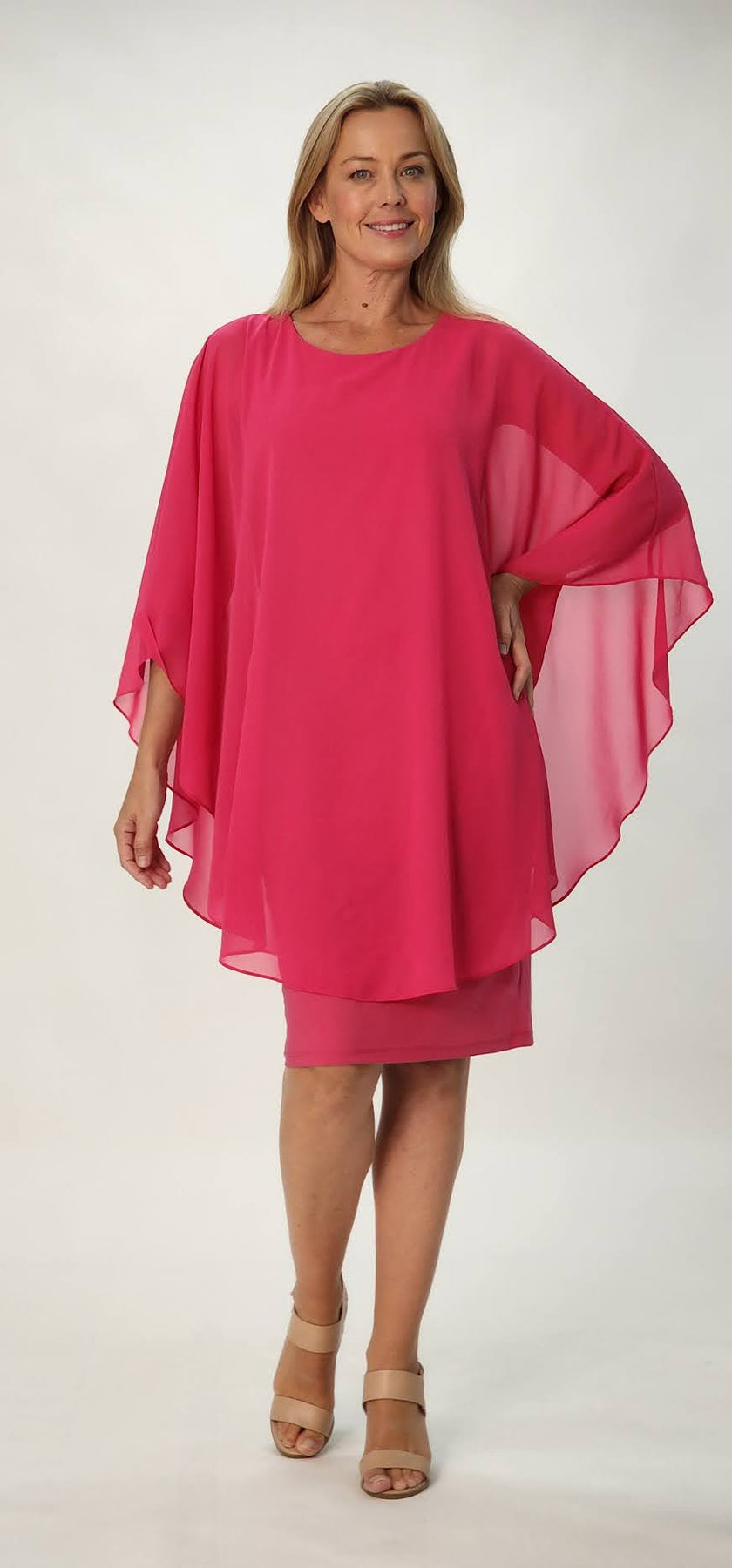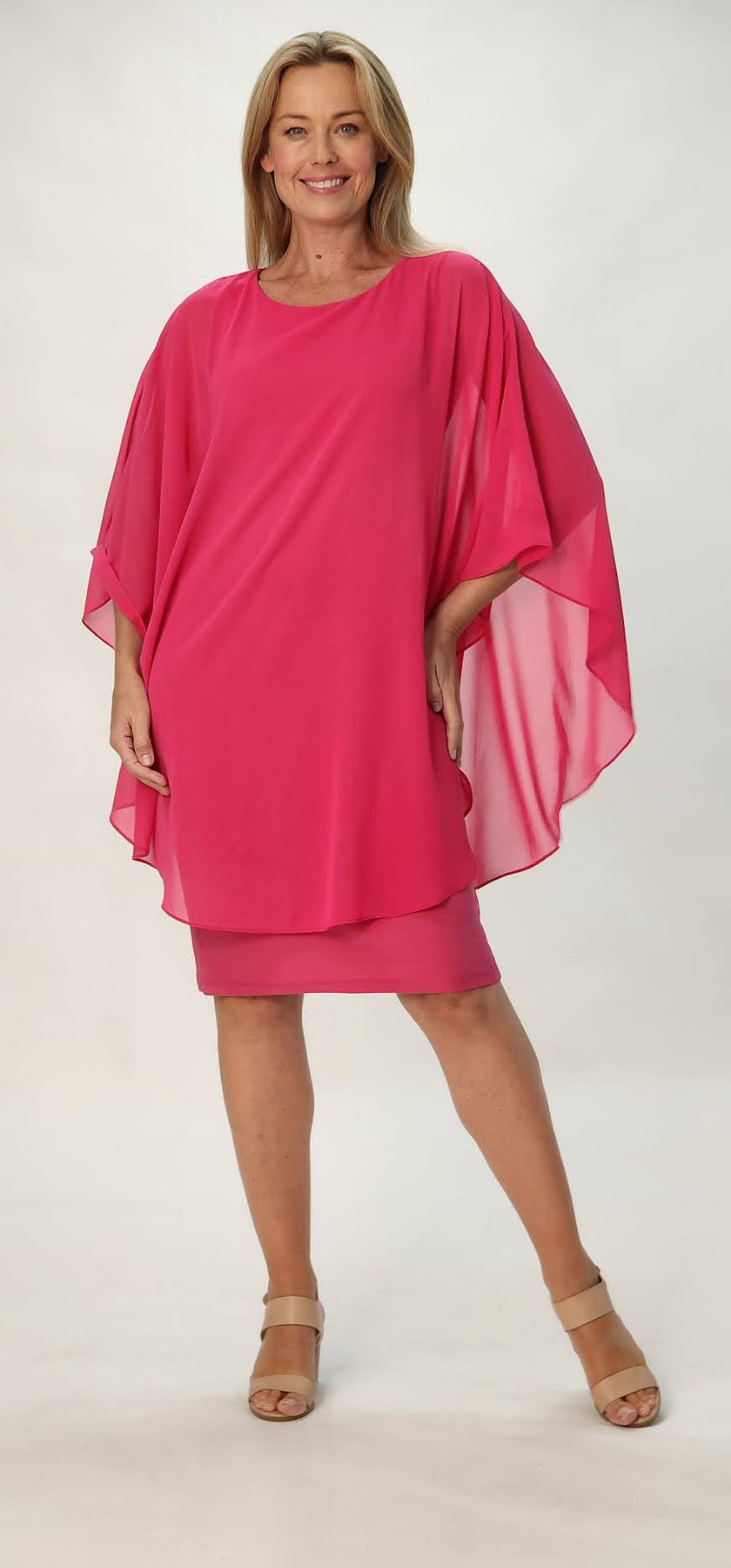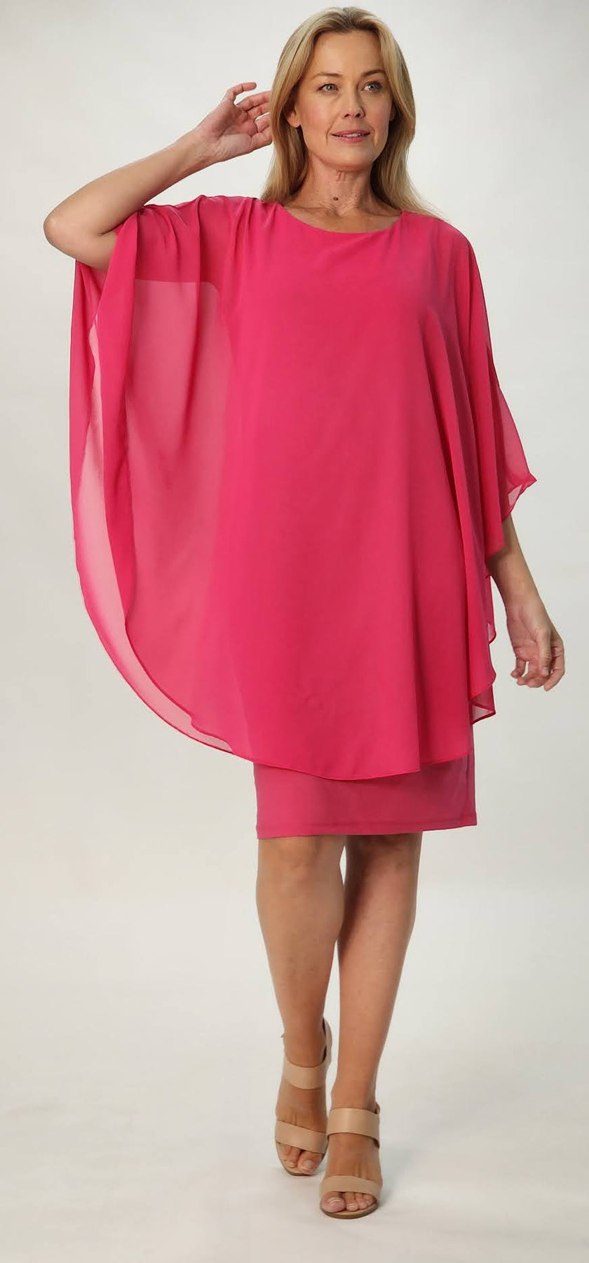 This striking fuchsia dress combines a fluid chiffon overlay cape with a comfortable stretch jersey base, creating a perfect blend of elegance and ease. The delicate chiffon offers graceful movement, while the stretch jersey ensures a flattering fit that moves with you. Ideal for standing out at any event, this dress promises both style and comfort in one stunning package.