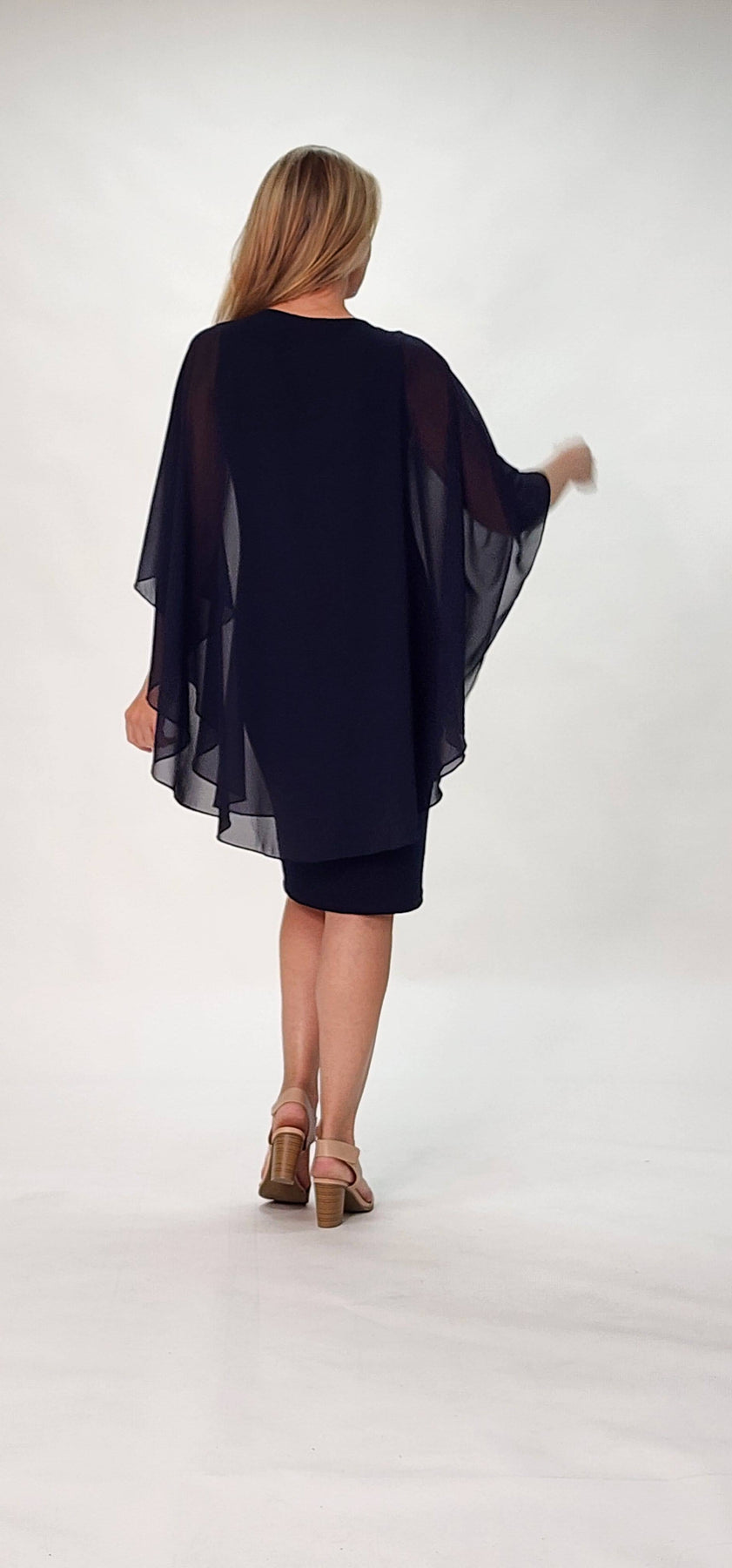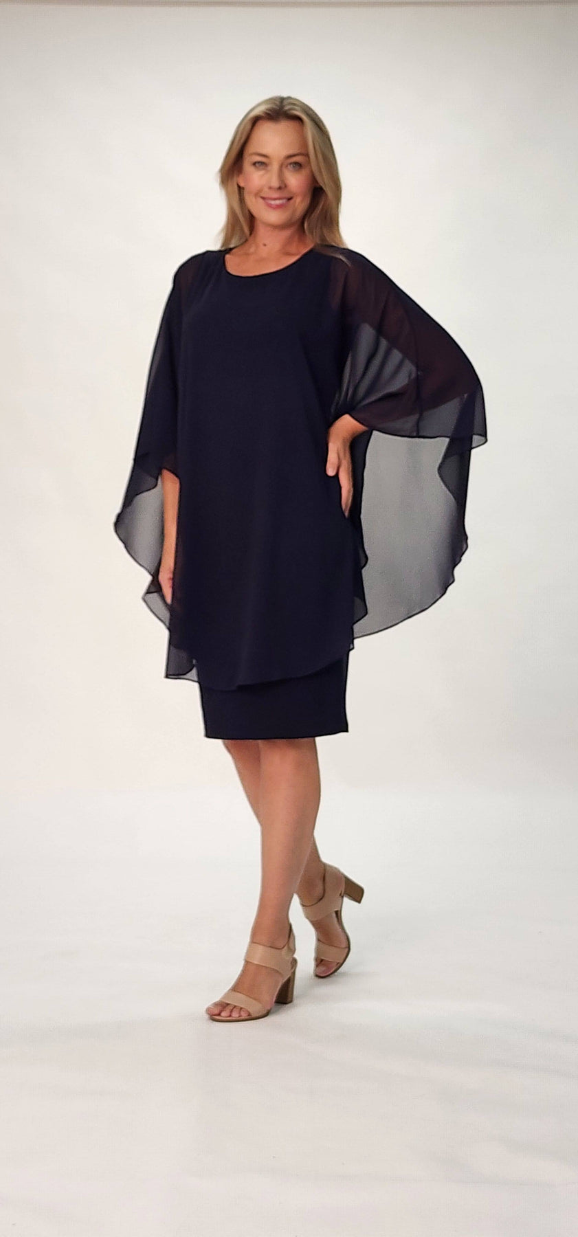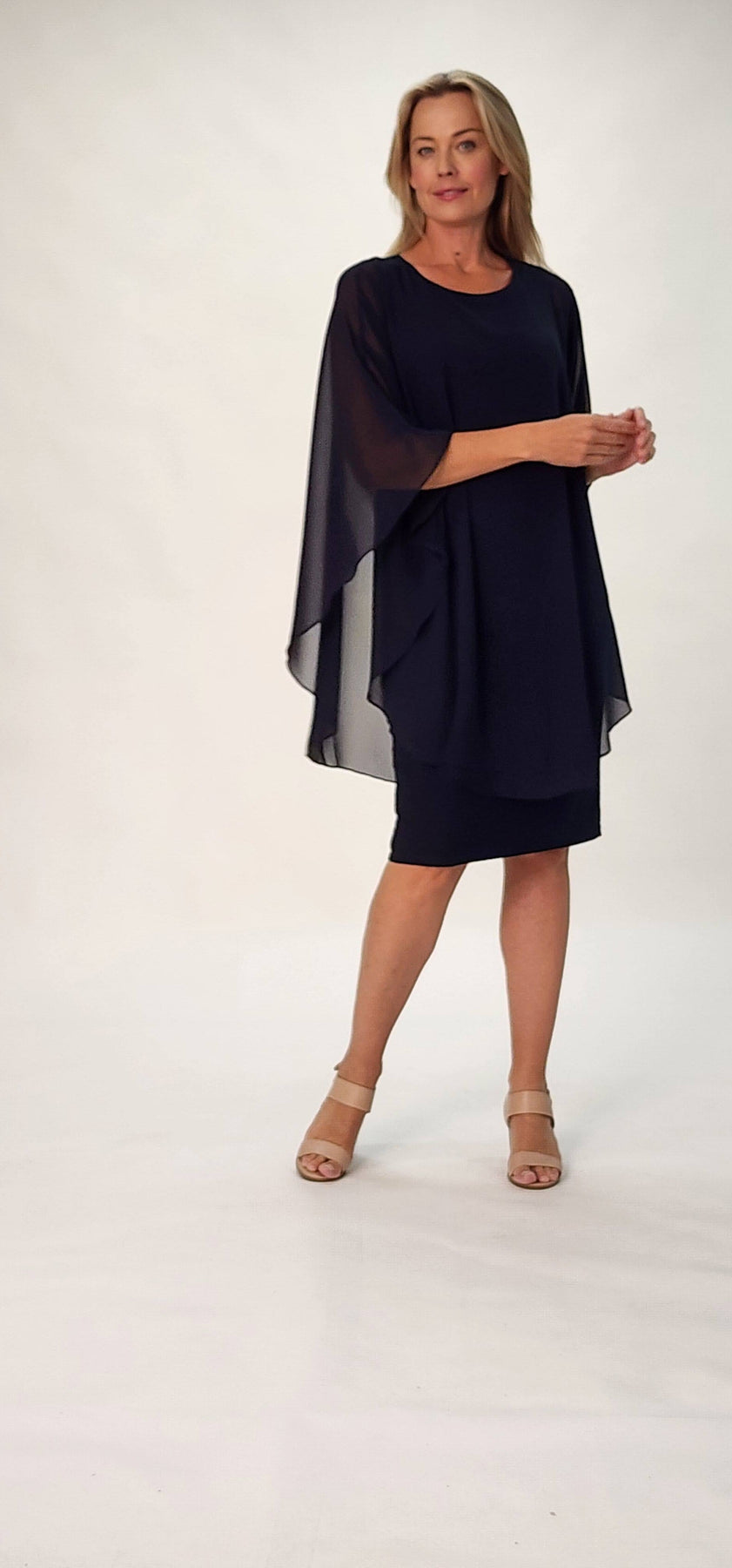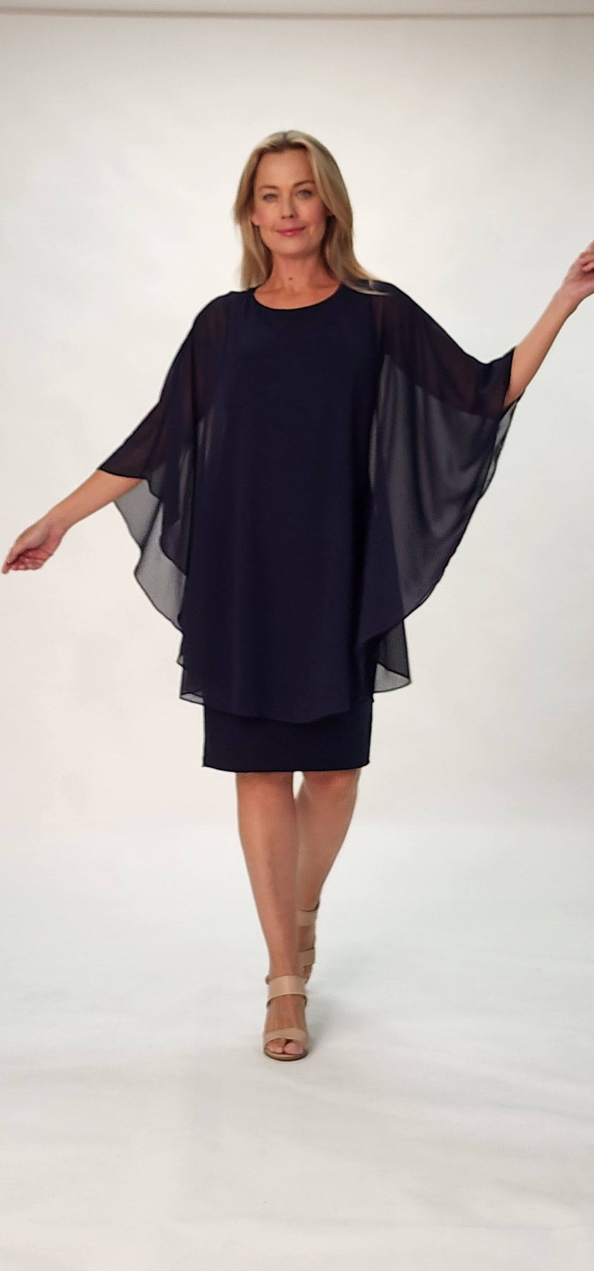 This striking fuchsia dress combines a fluid chiffon overlay cape with a comfortable stretch jersey base, creating a perfect blend of elegance and ease. The delicate chiffon offers graceful movement, while the stretch jersey ensures a flattering fit that moves with you. Ideal for standing out at any event, this dress promises both style and comfort in one stunning package.