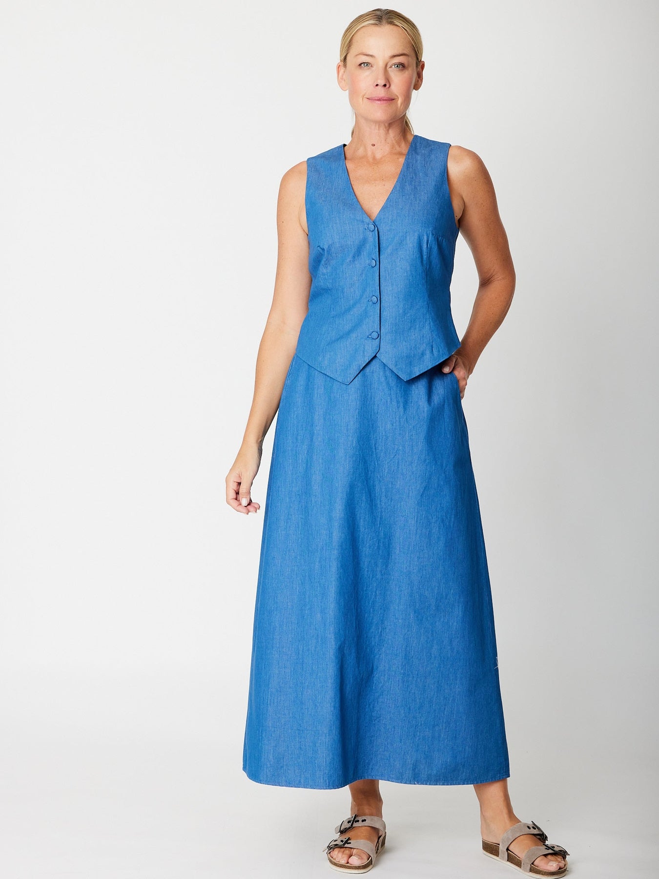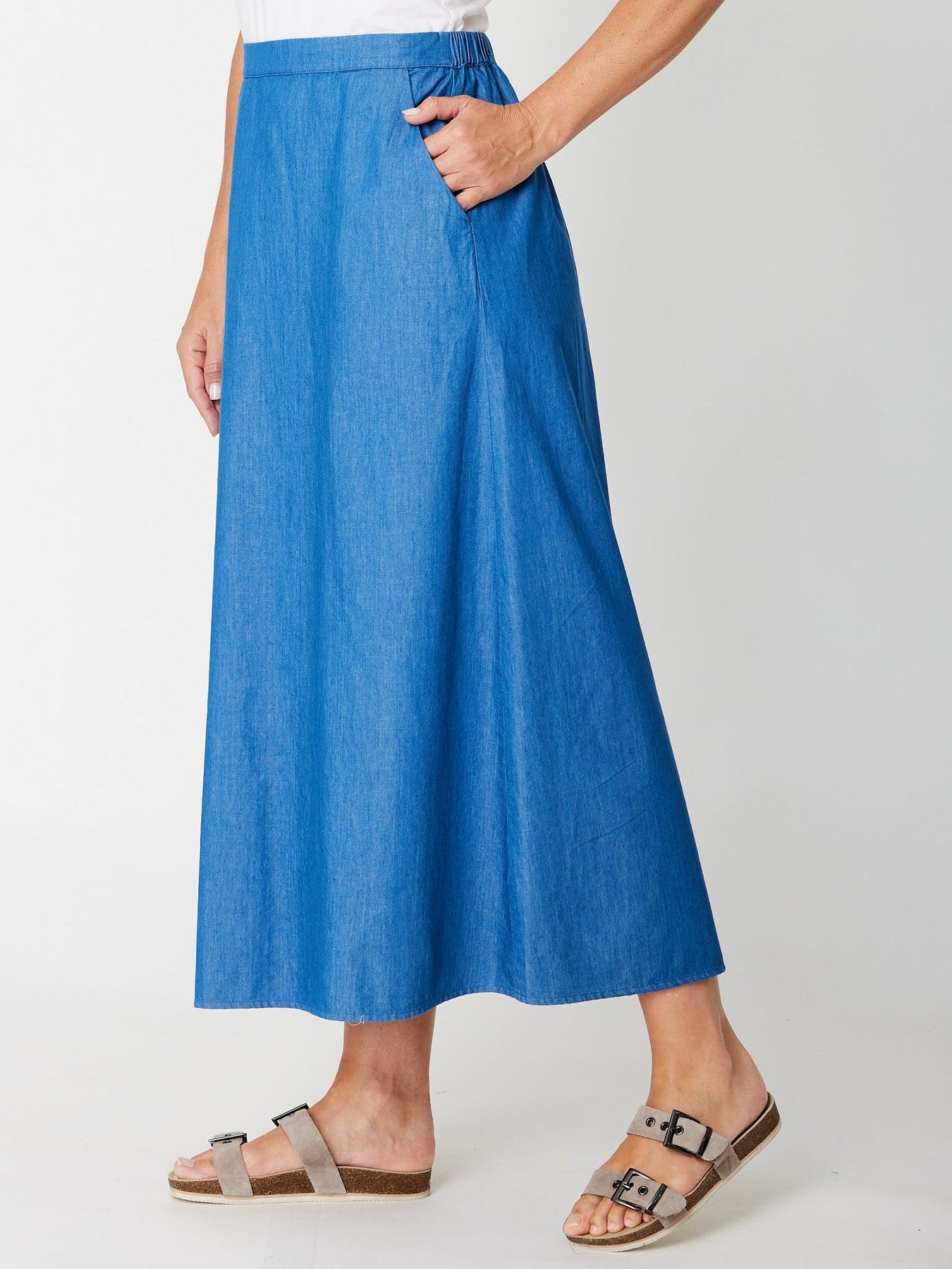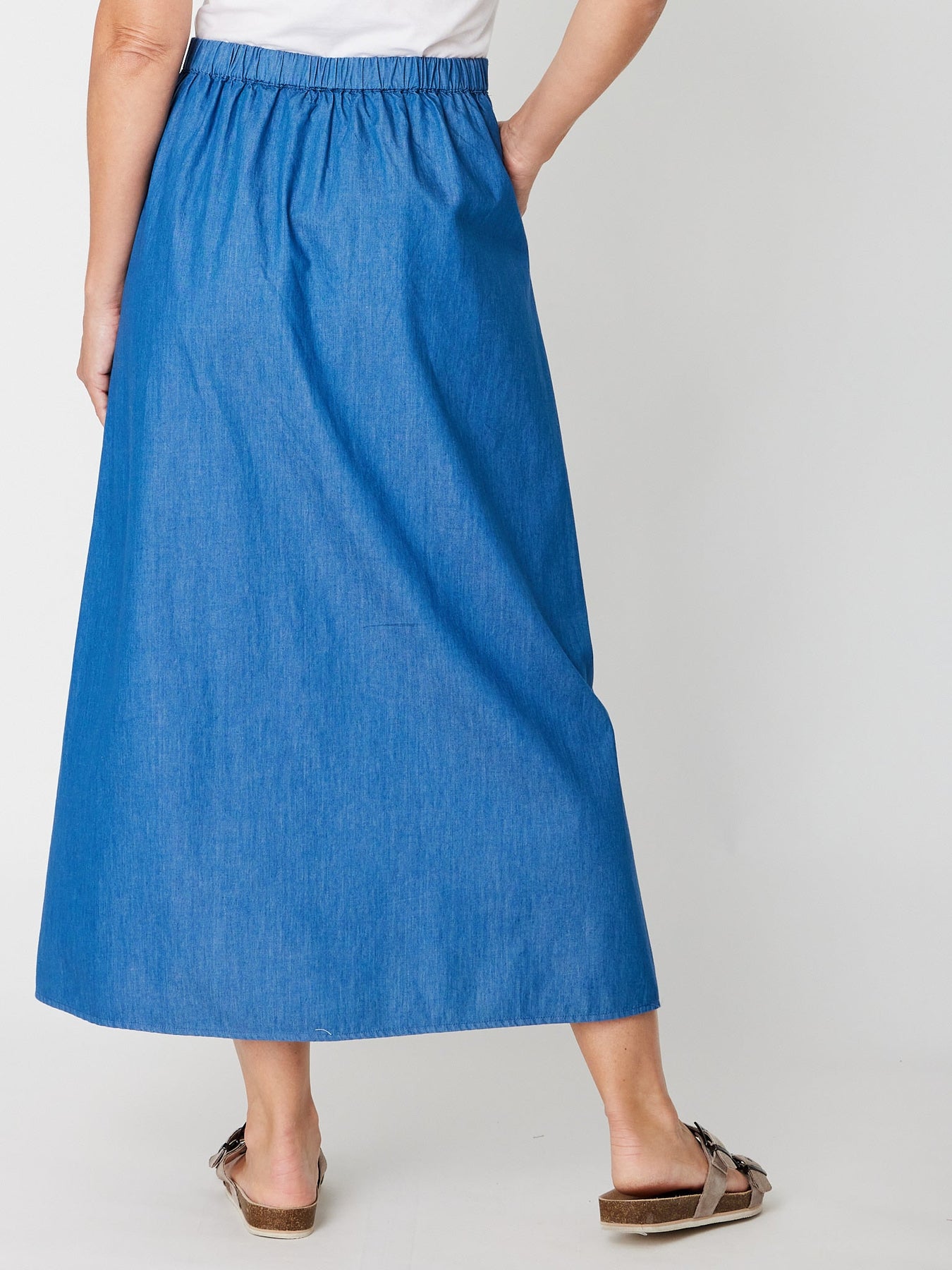 This stylish A- line denim skirt combines comfort and practicality with an elastic back for effortless wear and convenient side pockets to keep essentials close. Perfect for versatile everyday looks that move with you.
