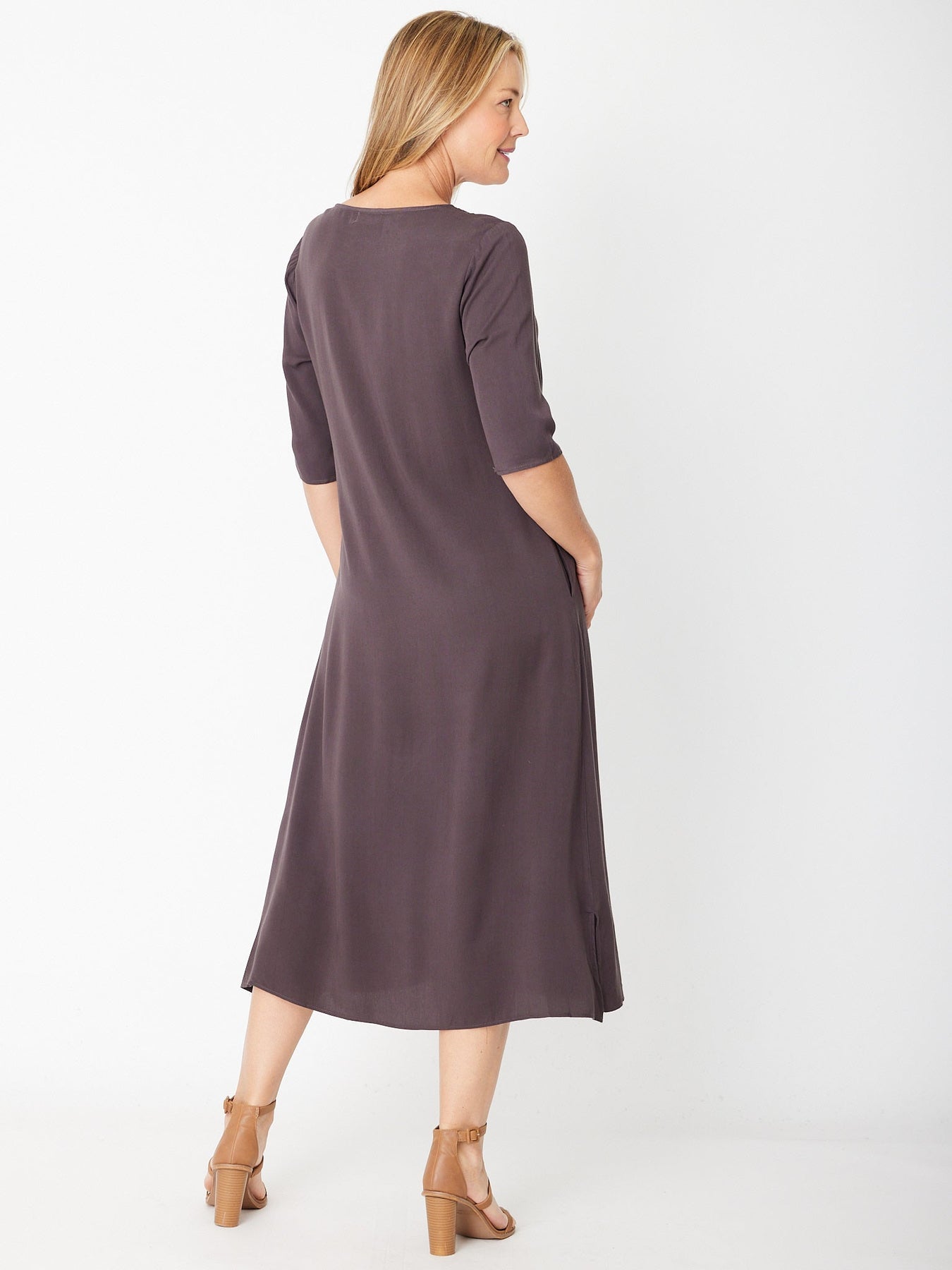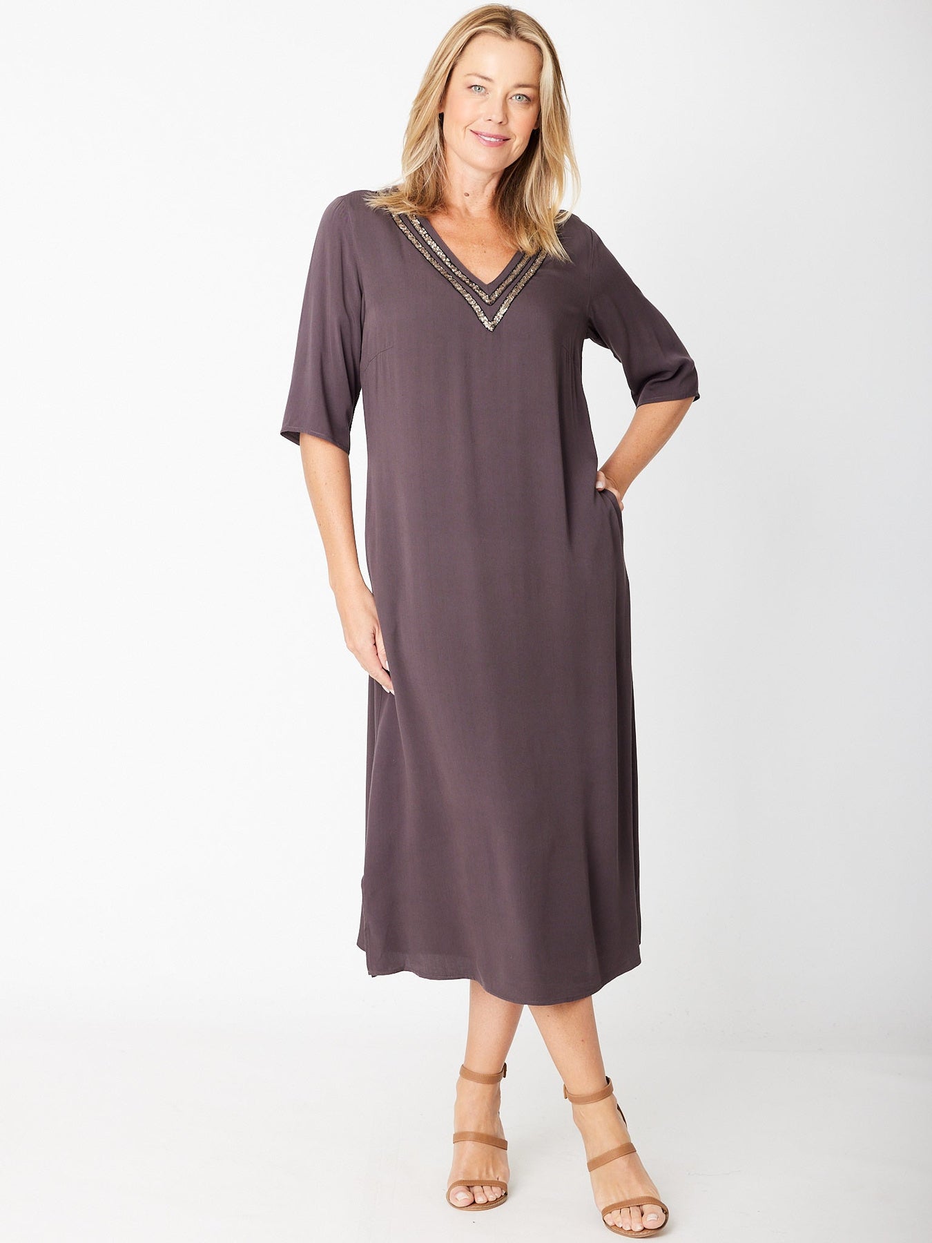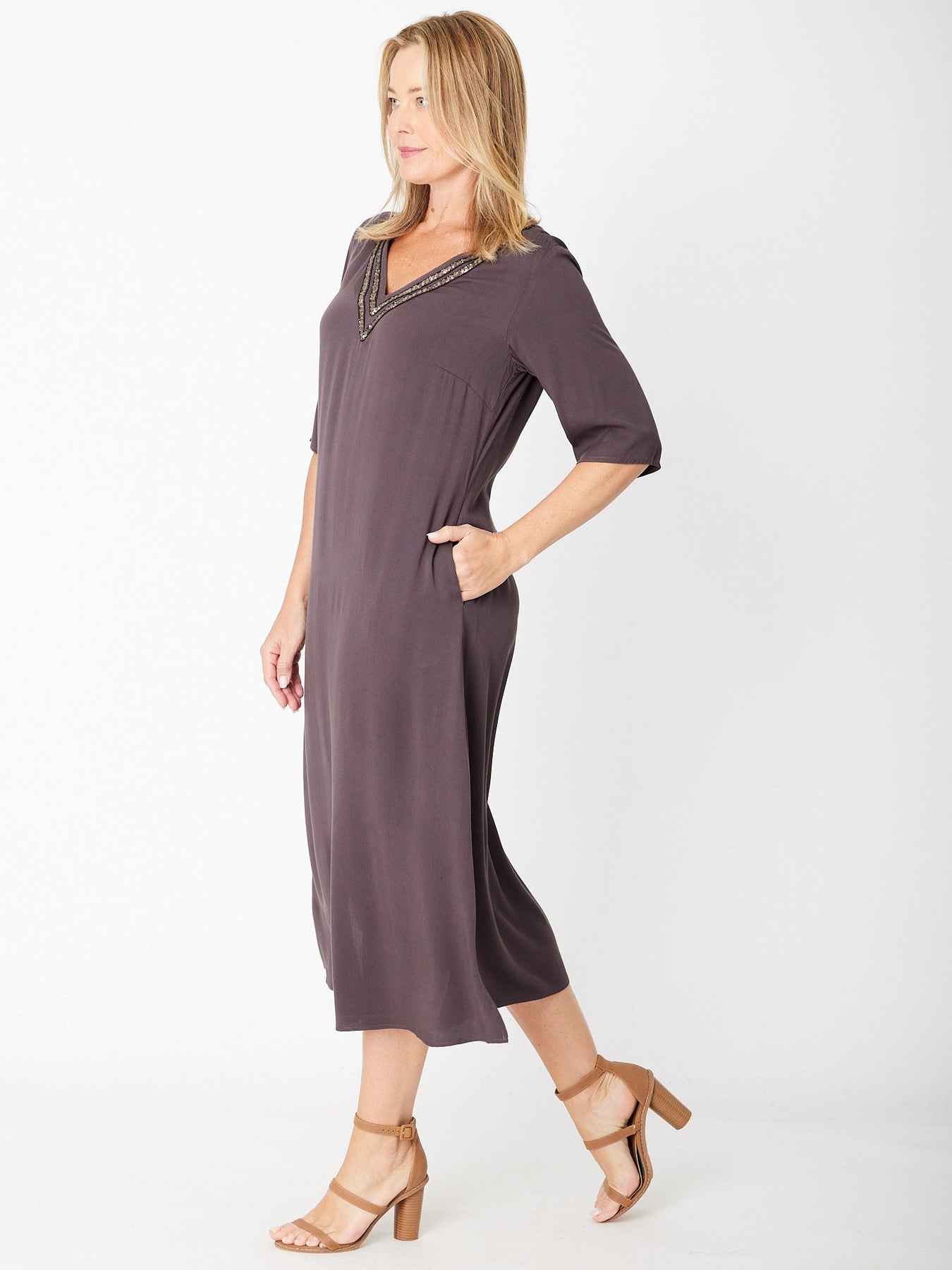 Effortless elegance meets everyday comfort in this stunning elbow-length rayon dress. The relaxed shift silhouette skims beautifully over your frame, while functional pockets add practical style. A flattering V-neckline is adorned with delicate beading trim that catches the light with every movement. Crafted from breathable rayon, this versatile piece transitions seamlessly from casual outings to special occasions, offering the perfect balance of sophistication and wearability.