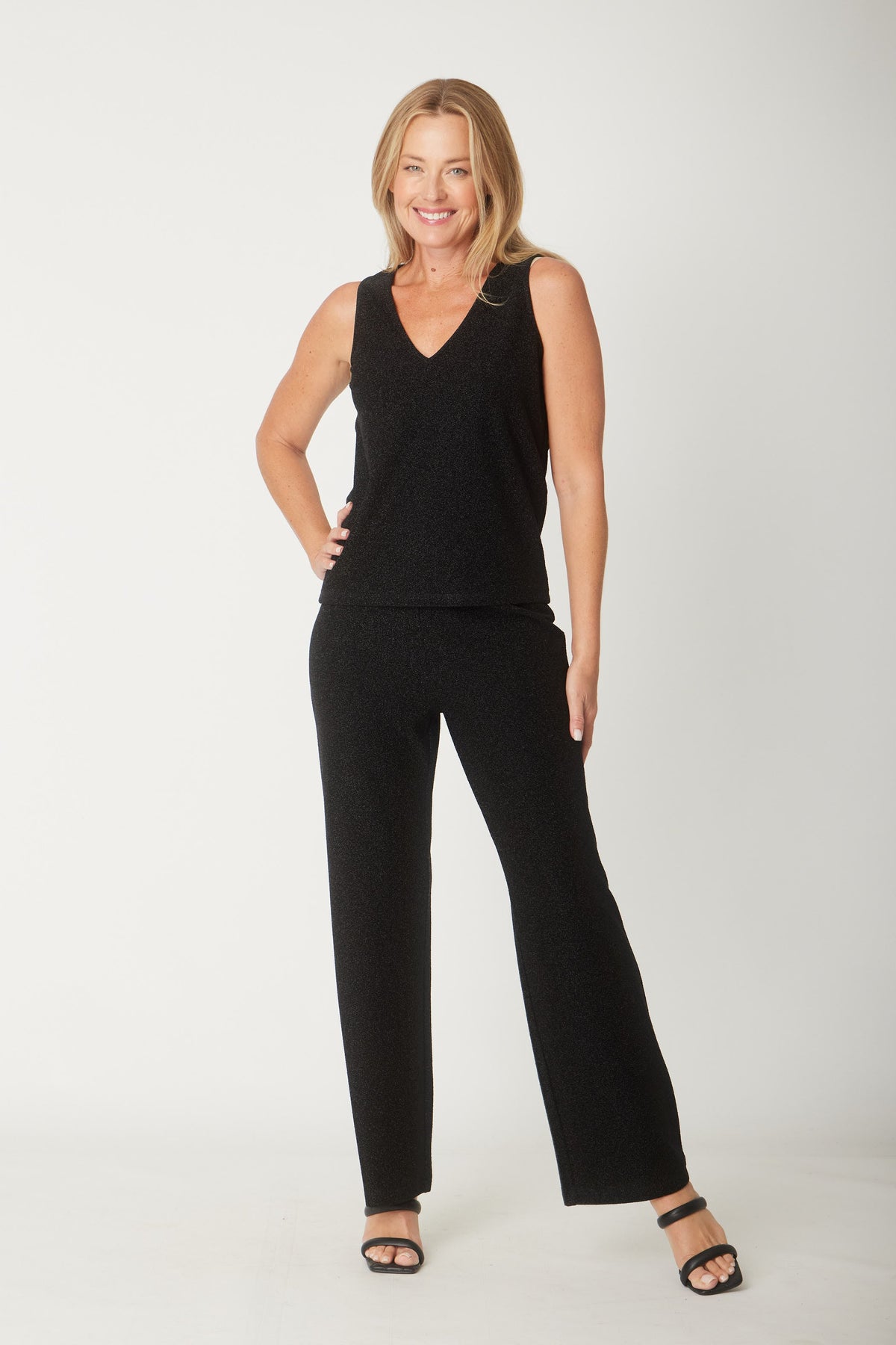 This sleeveless V-neck lurex top adds a touch of shimmer to your special occasion wardrobe. Its stretch fabric ensures a comfortable, flattering fit, while pairing effortlessly with the matching skirt, pant, and jacket for a polished, coordinated outfit. Elevate your look with this versatile piece designed to shine at any event.