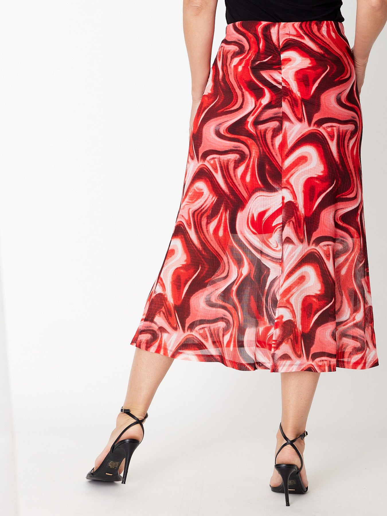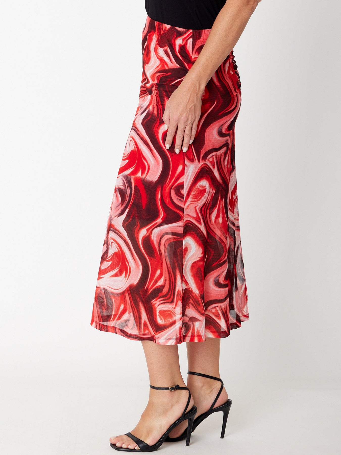 This elegant A-line midi skirt combines a pull-on elastic waist with a subtly ruched back for a refined silhouette. Crafted from red swirl stretch mesh with smooth lining, it offers both comfort and graceful movement, making it a sophisticated addition to any wardrobe.