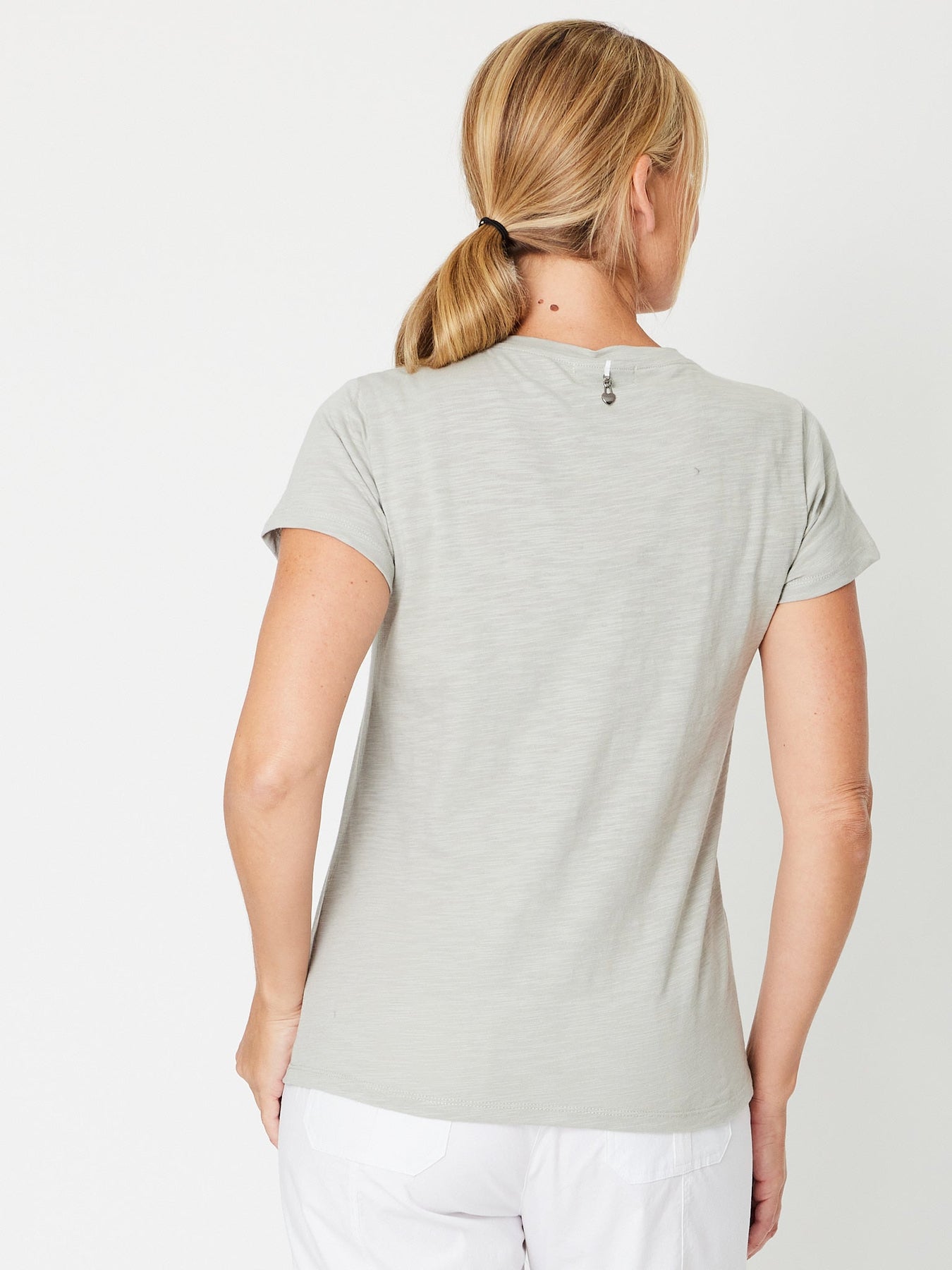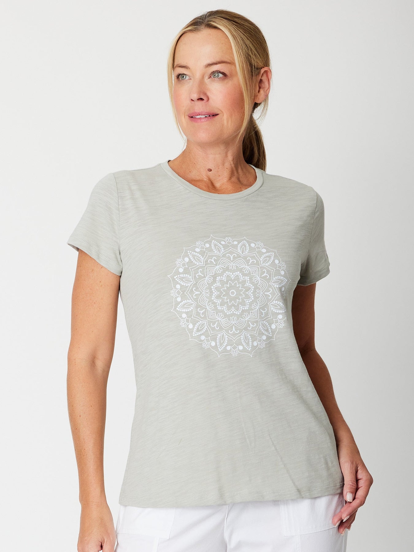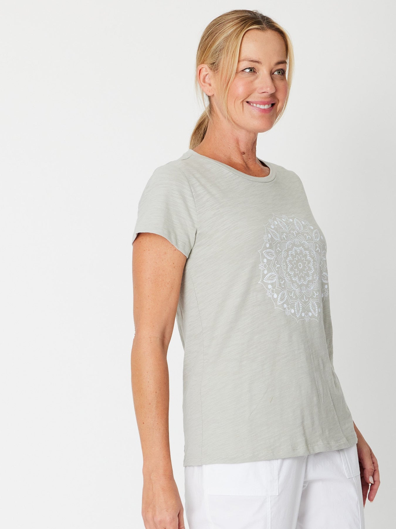 This Mozaic Print Tee in toffee offers a playful twist on casual style with its unique white mosaic design. Crafted from stretch cotton jersey, it ensures a comfortable fit that moves with you. Perfect for adding a touch of fun to your everyday wardrobe while keeping you cool in short sleeves.