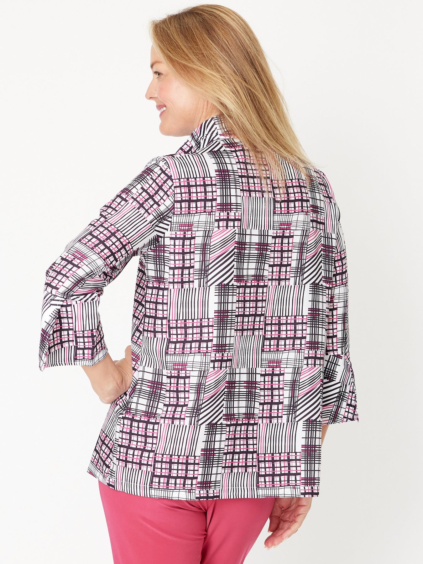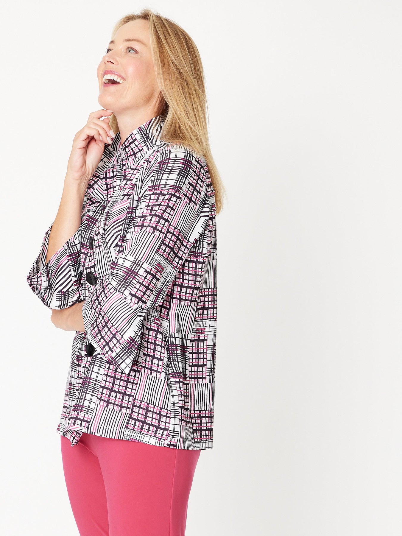 Make a bold fashion statement with this striking button-through collared shirt, featuring an eye-catching striped abstract print that commands attention. Oversized black statement buttons add contemporary edge, while the flattering 3/4 bell sleeves create movement and elegance. Perfect for layering or wearing solo, this versatile piece transitions effortlessly from casual to sophisticated occasions. The structured collar and thoughtful sleeve design ensure a polished silhouette that flatters every frame. Elevate your wardrobe with a shirt that combines artistic flair with wearable style.