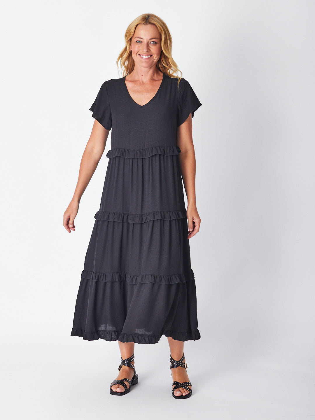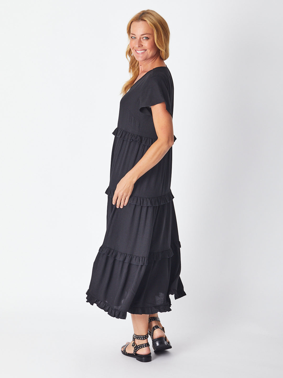 The Ruffle Tier Dress in black is a breezy maxi tier dress offering elegance and a relaxed, gorgeously flowing silhouette.