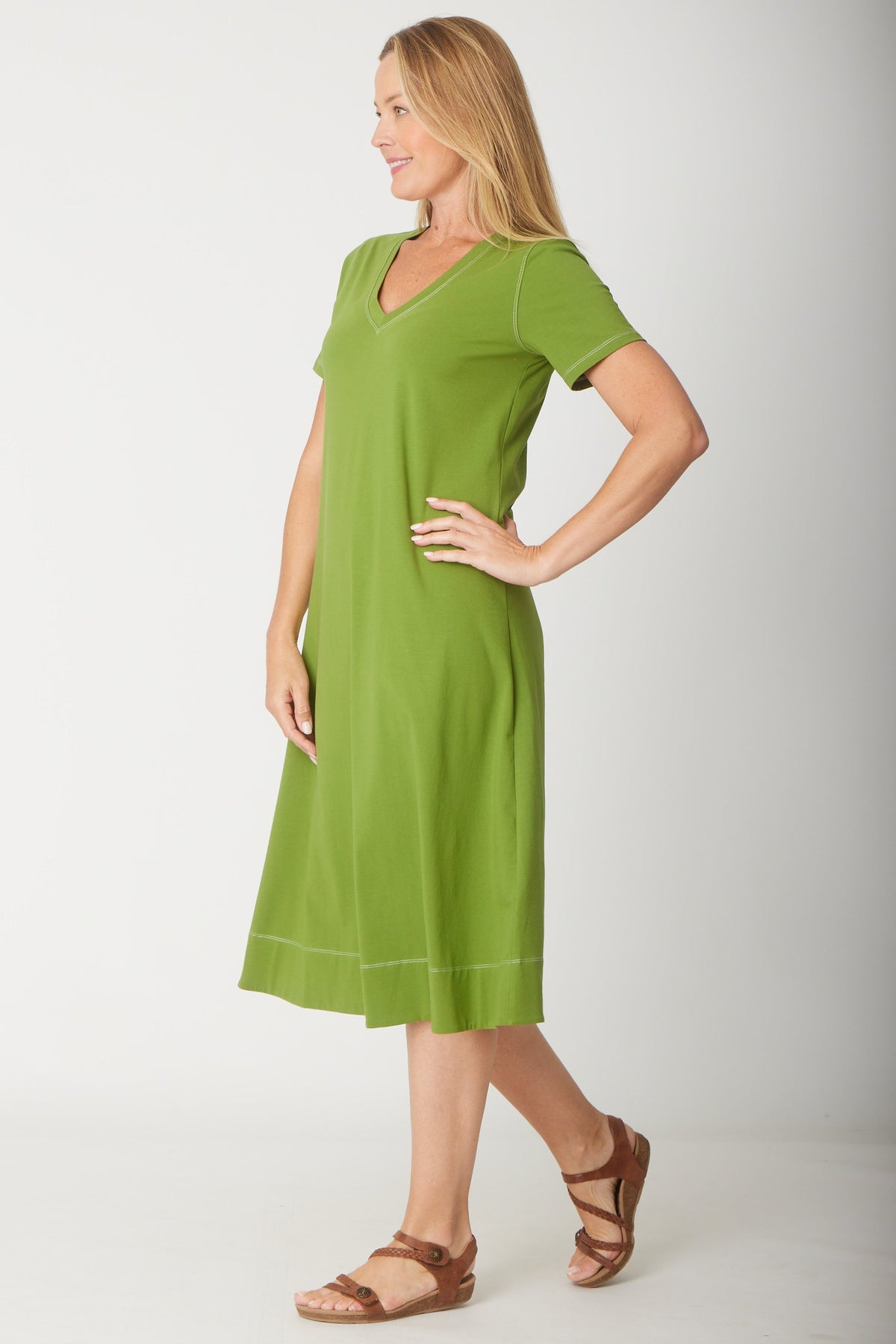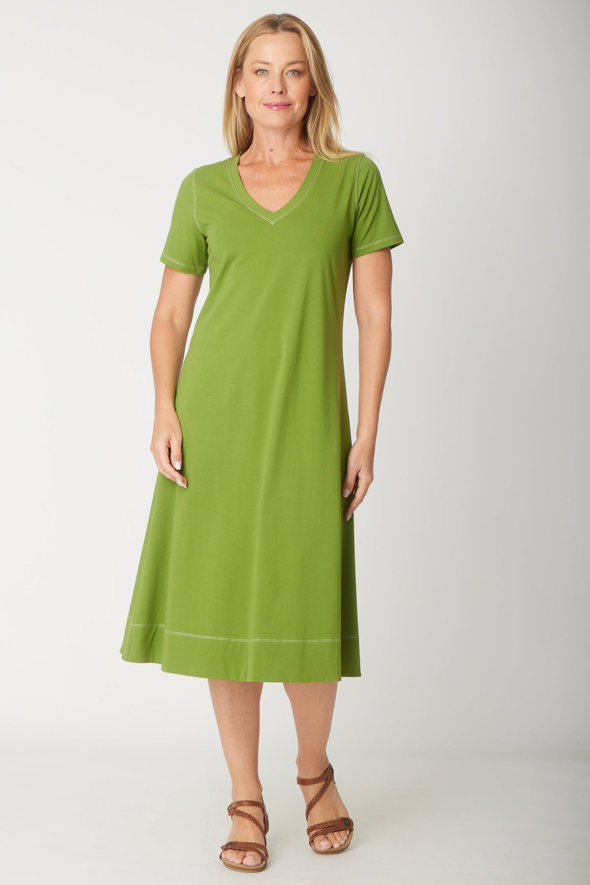 This short sleeve cotton jersey dress features a flattering V-neck and stylish contrast stitching on the neckline and hemline, adding subtle detail to a classic design. Soft and breathable fabric ensures all-day comfort, making it perfect for casual wear or layering. For the best fit, select your size based on bust measurements; if you’re between sizes, we recommend sizing up for ease and comfort. Elevate your wardrobe with this effortlessly chic and comfortable dress.