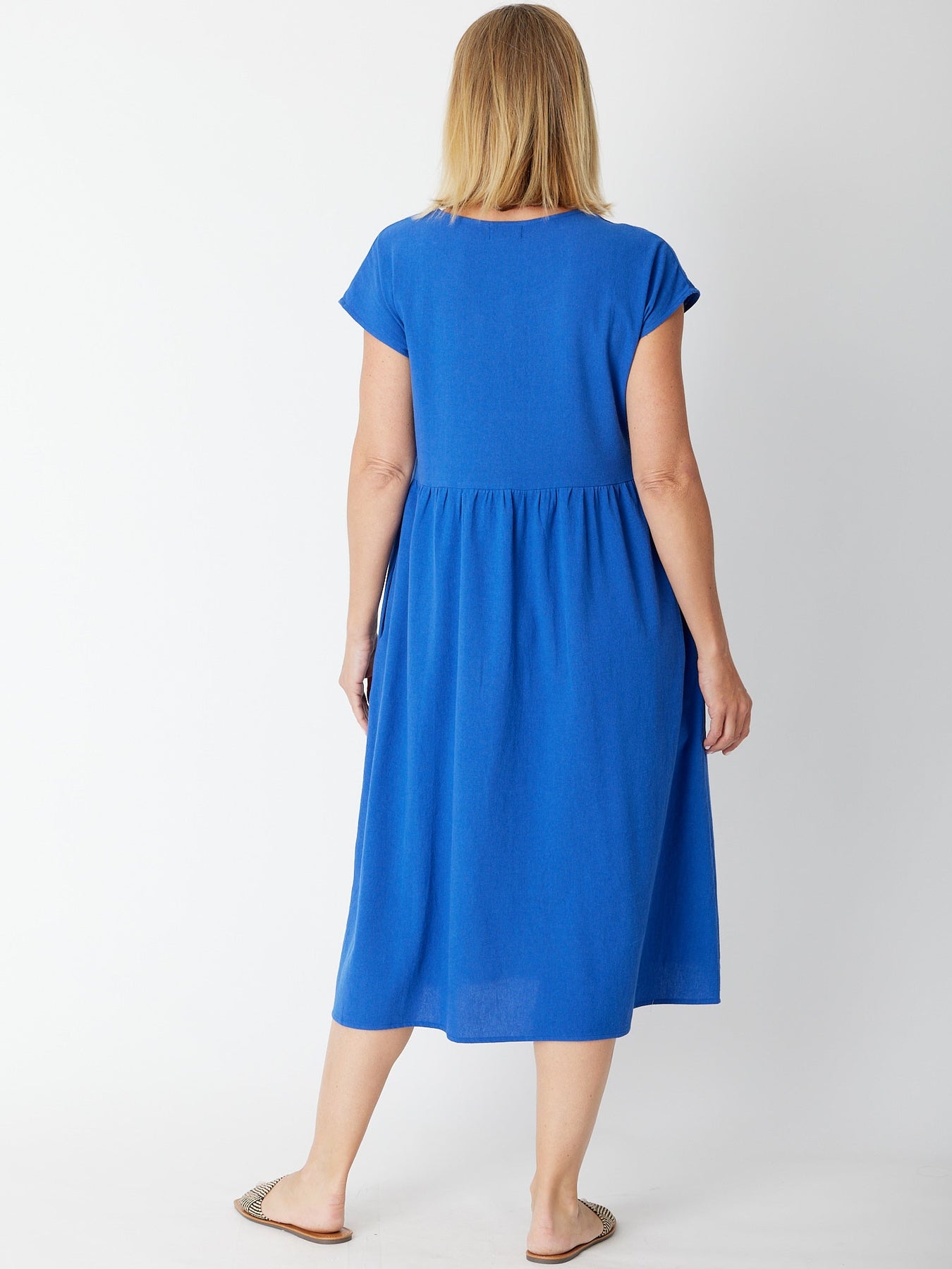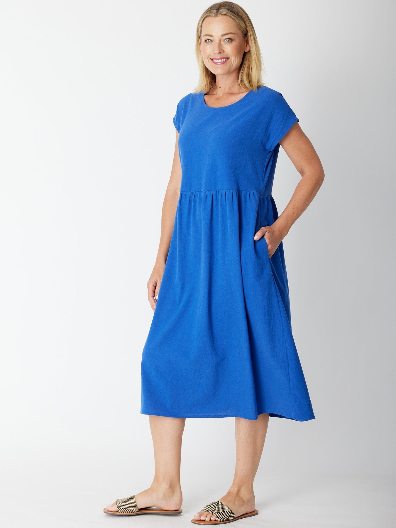 UPCYCLE Cotton Doll Dress is your perfect grab and go dress made from 100% cotton. With an extended cap sleeve, crew neck, and drop waist design, it flatters all shapes and sizes. Convenient pockets, mid length, and versatile styling options make it suitable for all heights and occasions. Cold wash and line dry make this dress easy to care for.