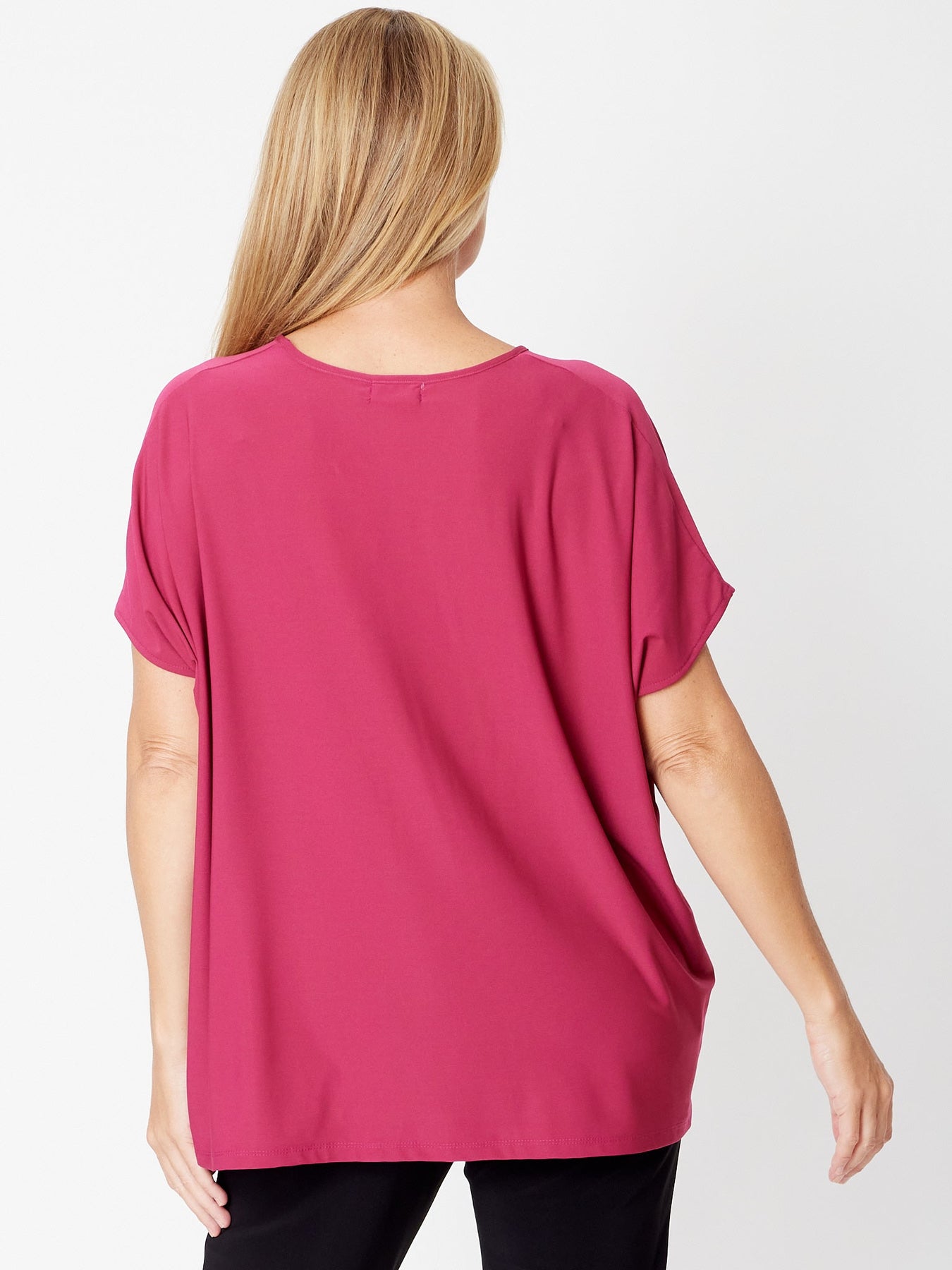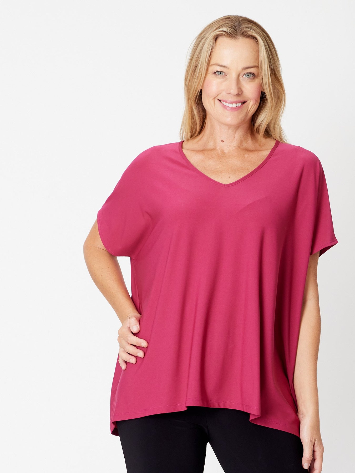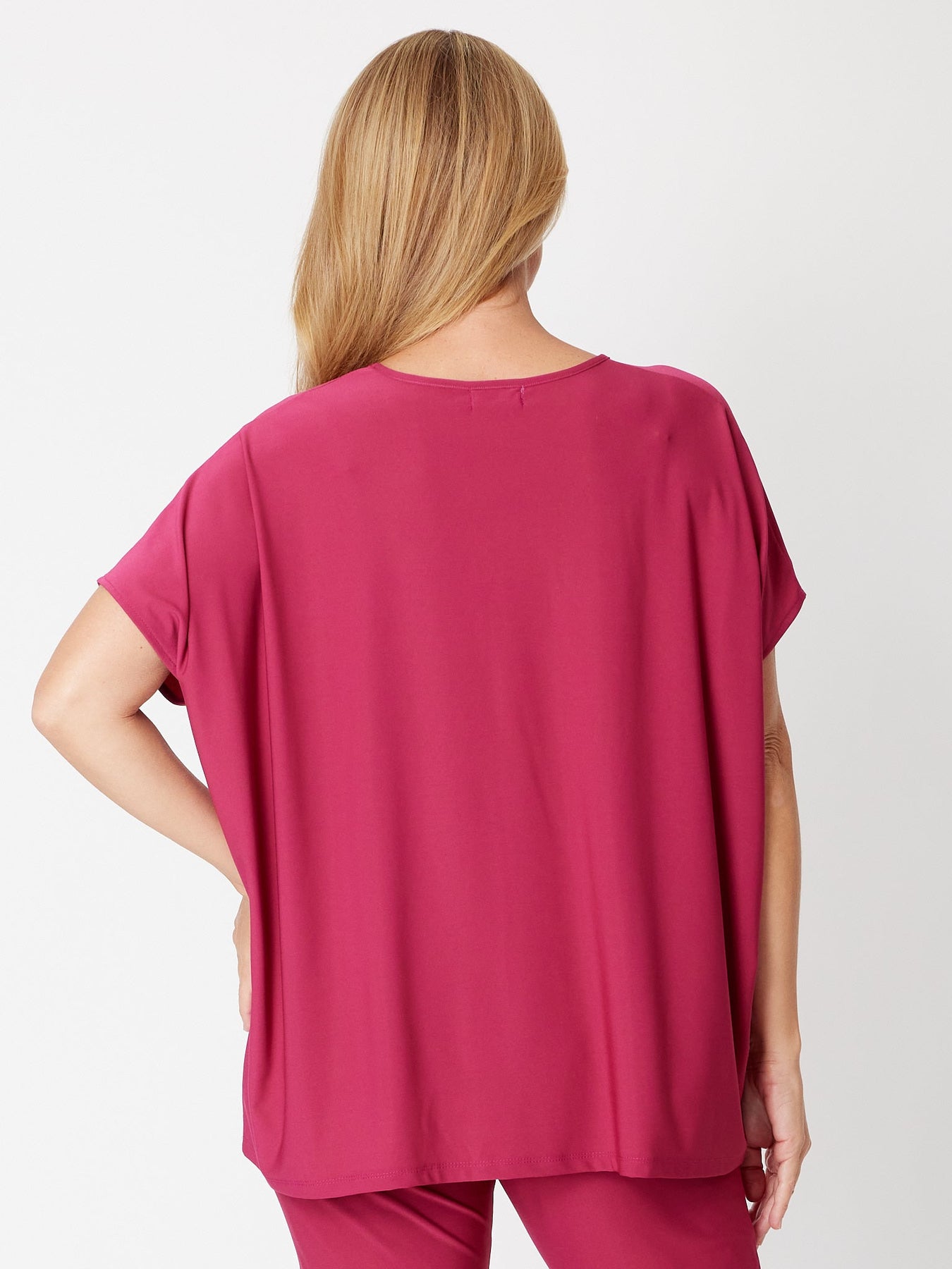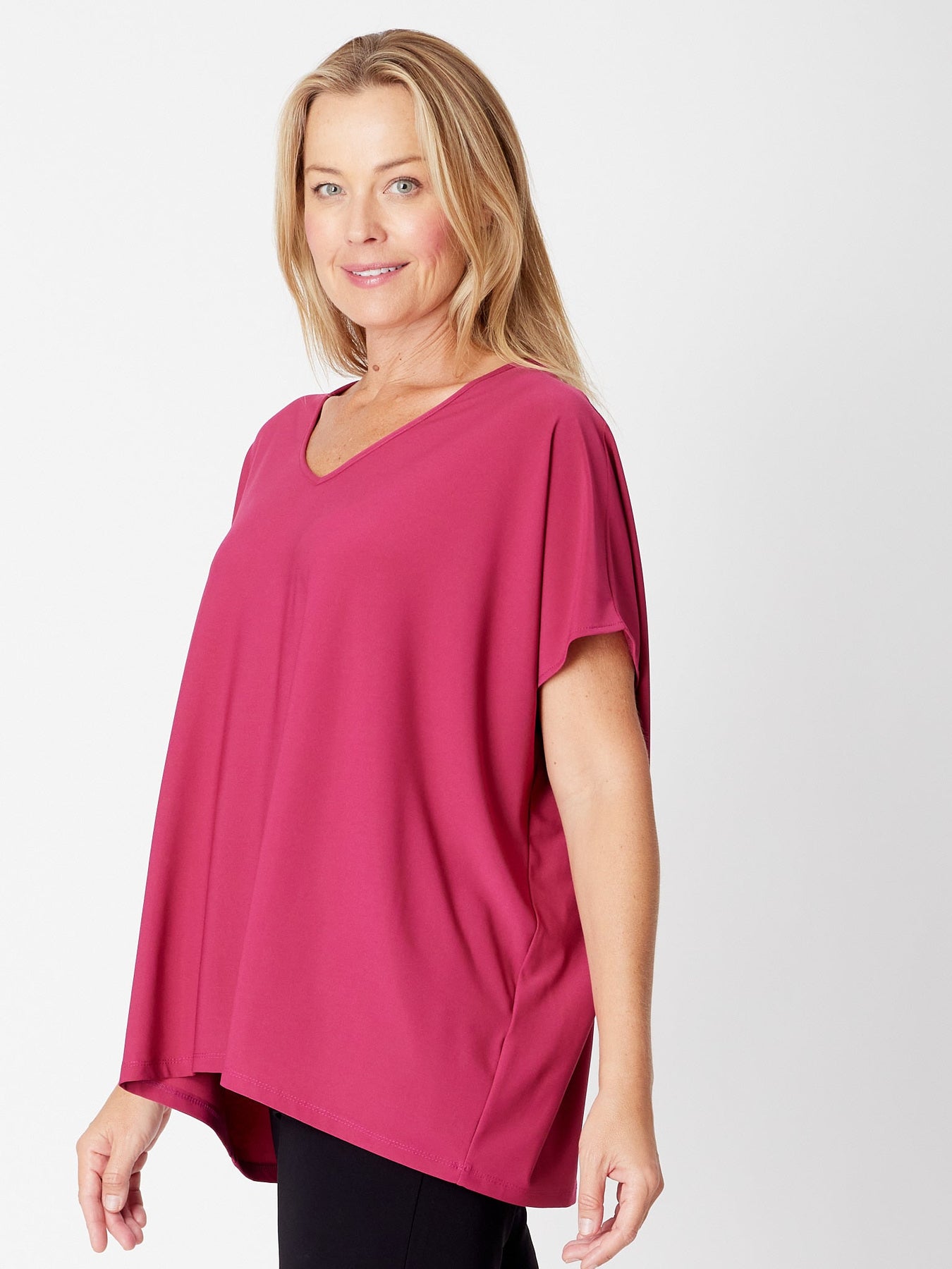 Experience effortless elegance with the Core Lux Jersey. Crafted from premium stretch jersey, this relaxed oversized top features a flattering V-neck and a longer length that drapes beautifully. Its almost kimono-inspired shape offers a sophisticated, dressy look while ensuring comfort and ease of movement. Perfect for elevating your wardrobe with a versatile piece that blends style and softness.  We suggest sizing down if you are in between sizes.  It is a very generous fit.