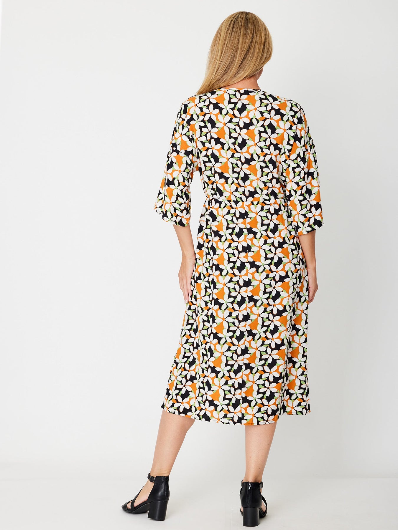 This black flower print dress features a flattering v-neck and relaxed 3/4 sleeves for effortless style. Made from cool rayon, it offers comfort and breathability, perfect for all-day wear. The functional drawstring waist allows you to adjust the fit to suit your silhouette, while the midi length adds a touch of elegance. Ideal for any occasion, this dress combines comfort with a tailored look that moves with you.