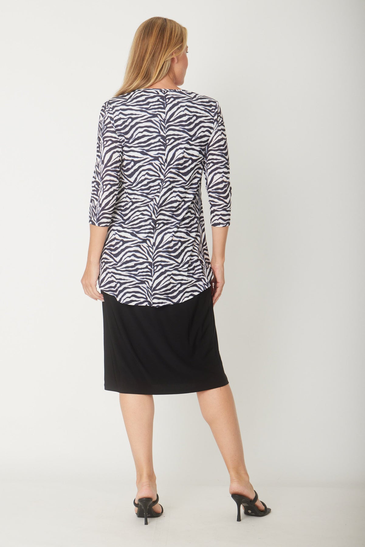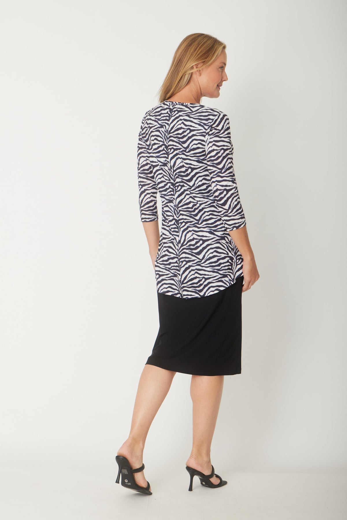 This print over plain Forgiveness Dress offers comfortable hip and tummy coverage with its cleverly designed overlay top combined with a straight dress underneath. Made from stretch jersey, it’s easy to wear and care for—machine washable with no ironing needed. Perfectly suited for work or travel, this dress keeps you looking polished and feeling confident wherever you go.