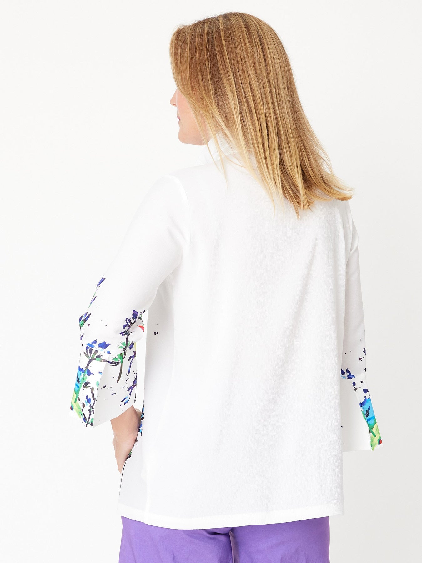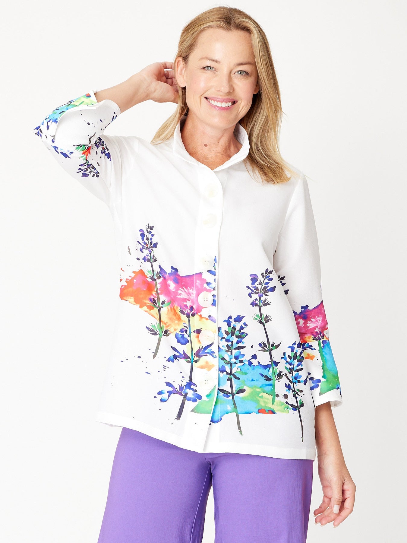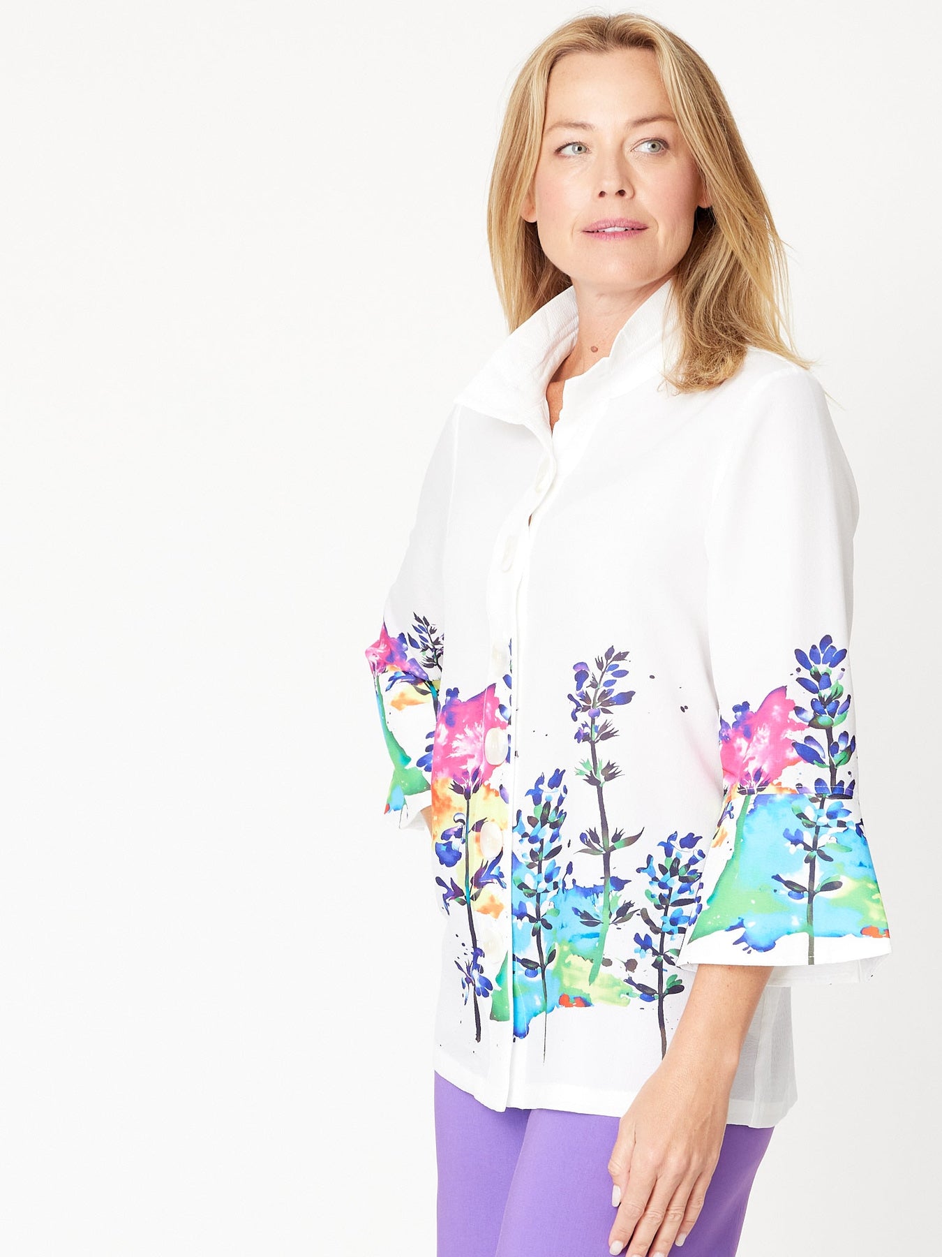This Tall Flowers Print Shirt features elegant 3/4 bell sleeves adorned with detailed border prints, adding a touch of sophistication to your look. The button-through front and versatile stand collar allow you to style it up or down effortlessly. Perfect for both casual and dressy occasions, this shirt combines comfort with refined design to elevate your wardrobe.