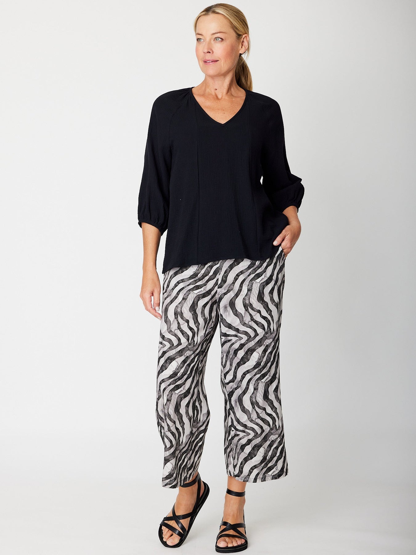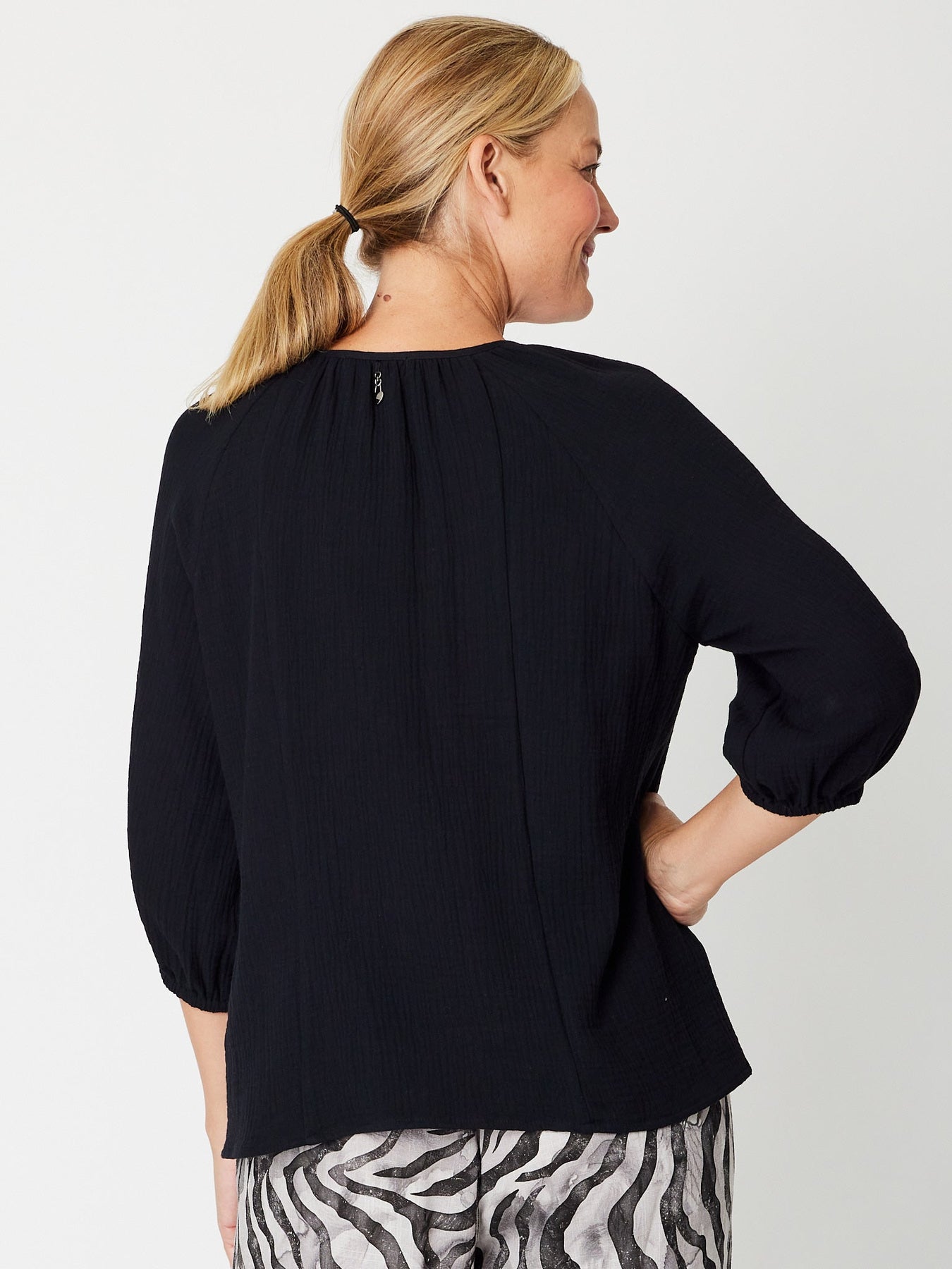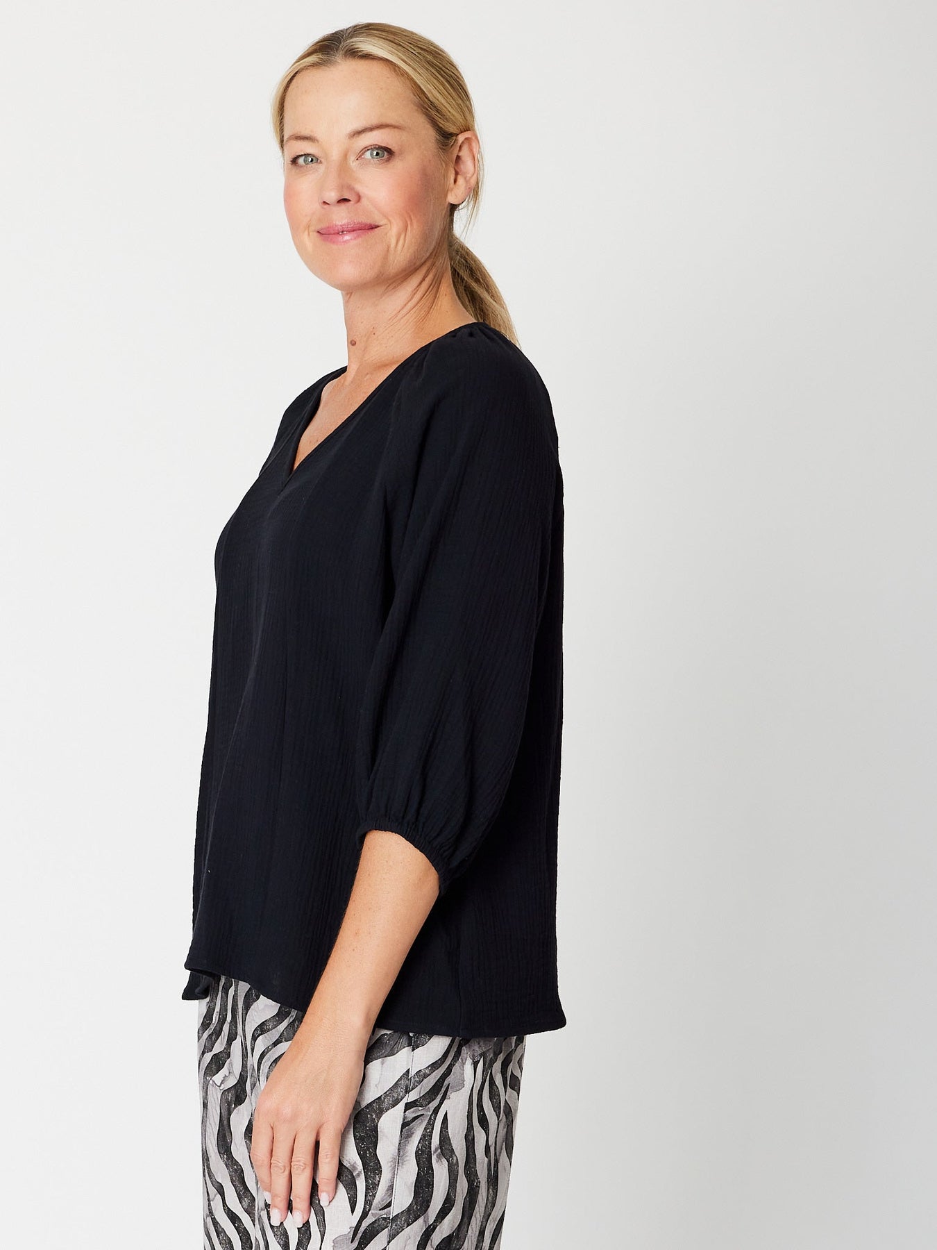 Effortlessly chic and undeniably comfortable, this bubble cotton top features a flattering V-neckline and relaxed 3/4 sleeves finished with a soft self-cuff. The lightweight cheesecloth blend drapes beautifully while maintaining its shape, making it an ideal layering piece or standalone essential. Perfect for casual days when you want style without compromise.