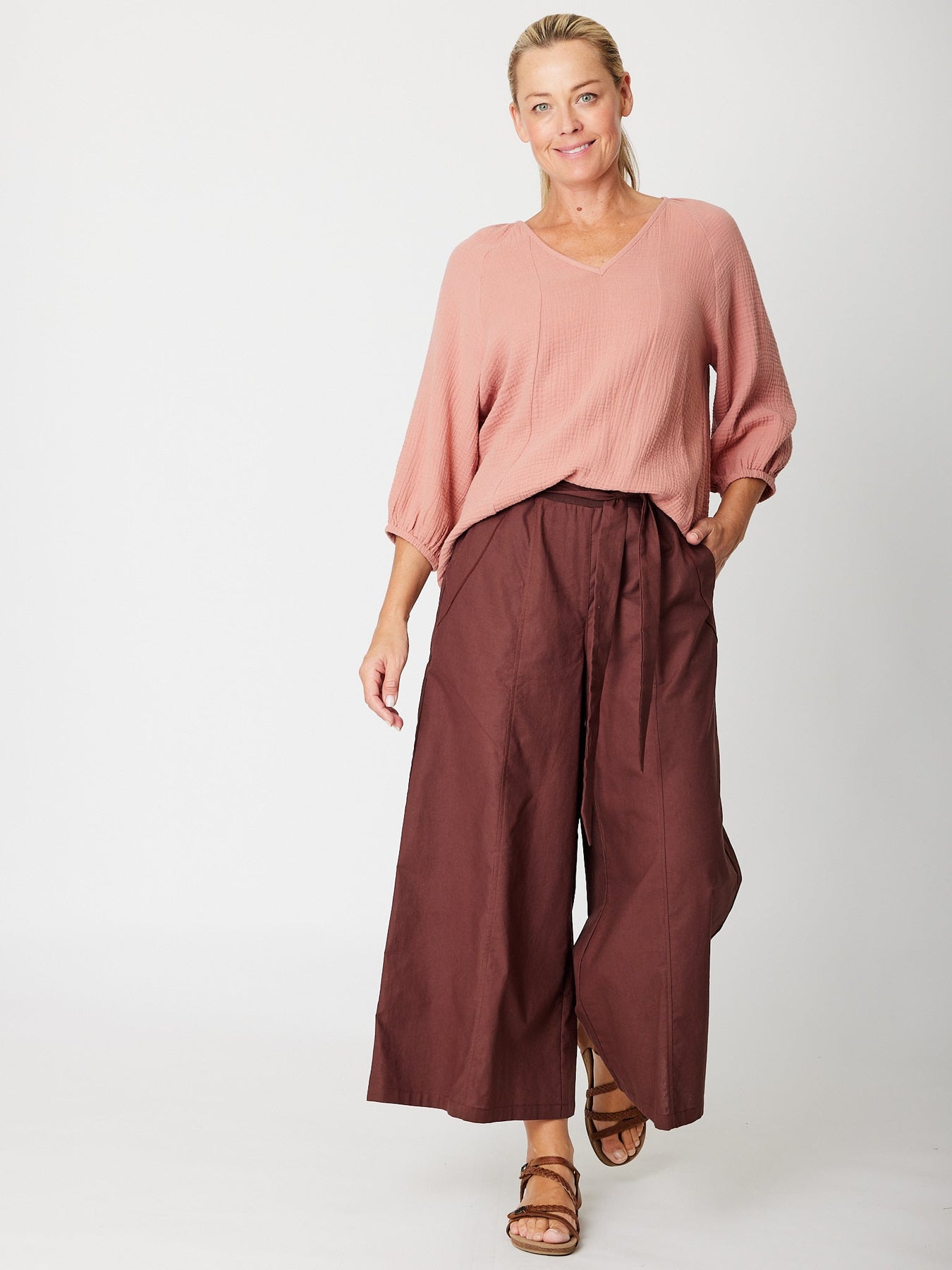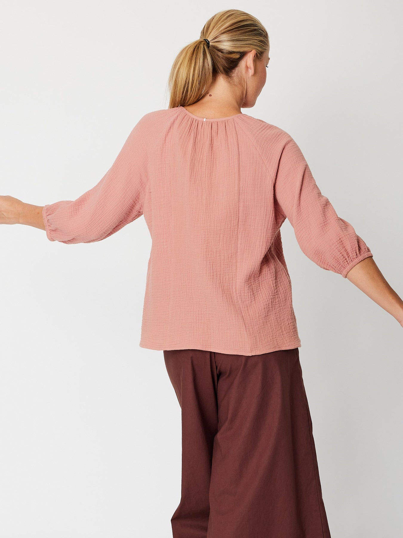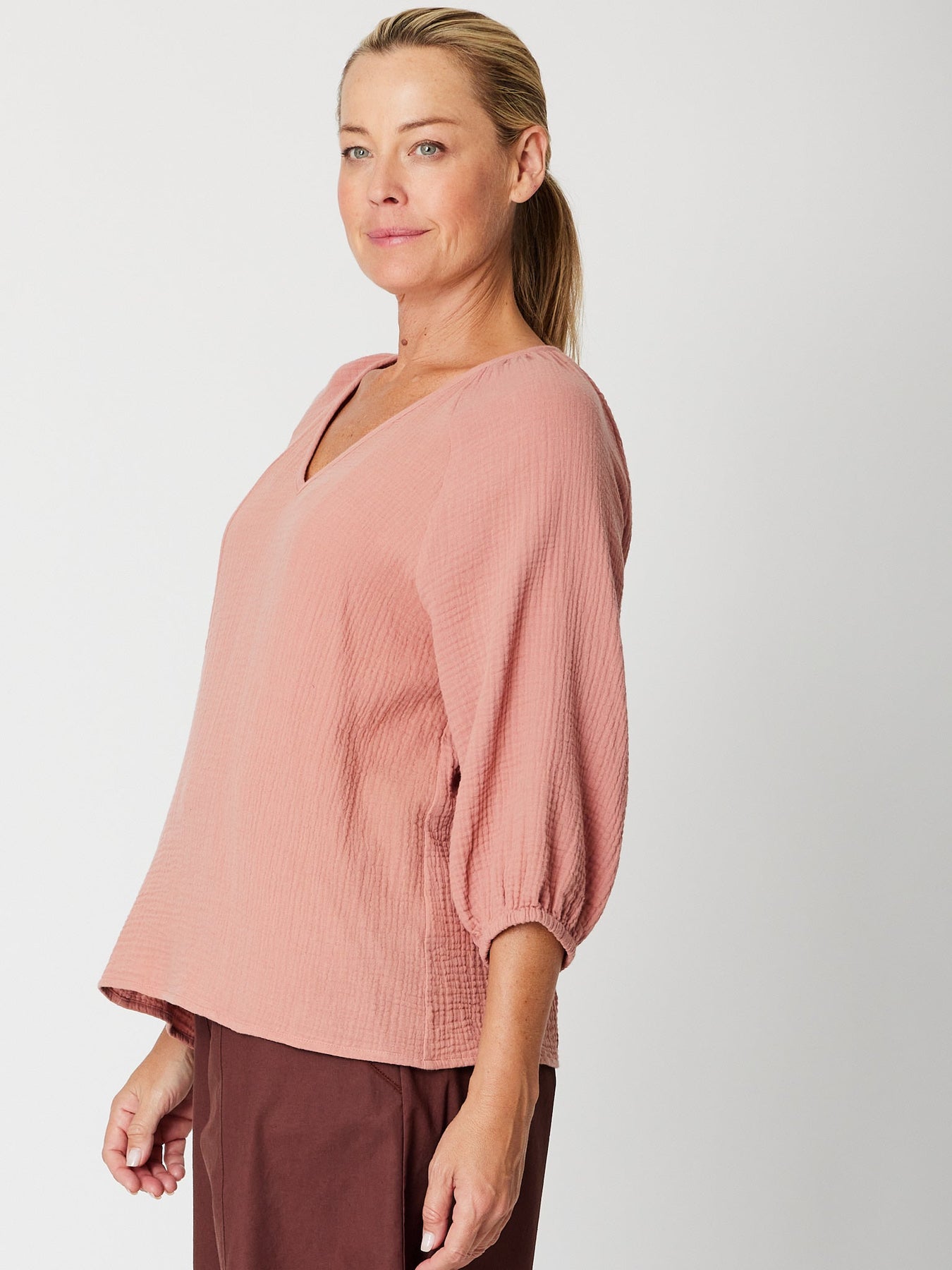 Effortlessly chic and undeniably comfortable, this bubble cotton top features a flattering V-neckline and relaxed 3/4 sleeves finished with a soft self-cuff. The lightweight cheesecloth blend drapes beautifully while maintaining its shape, making it an ideal layering piece or standalone essential. Perfect for casual days when you want style without compromise.