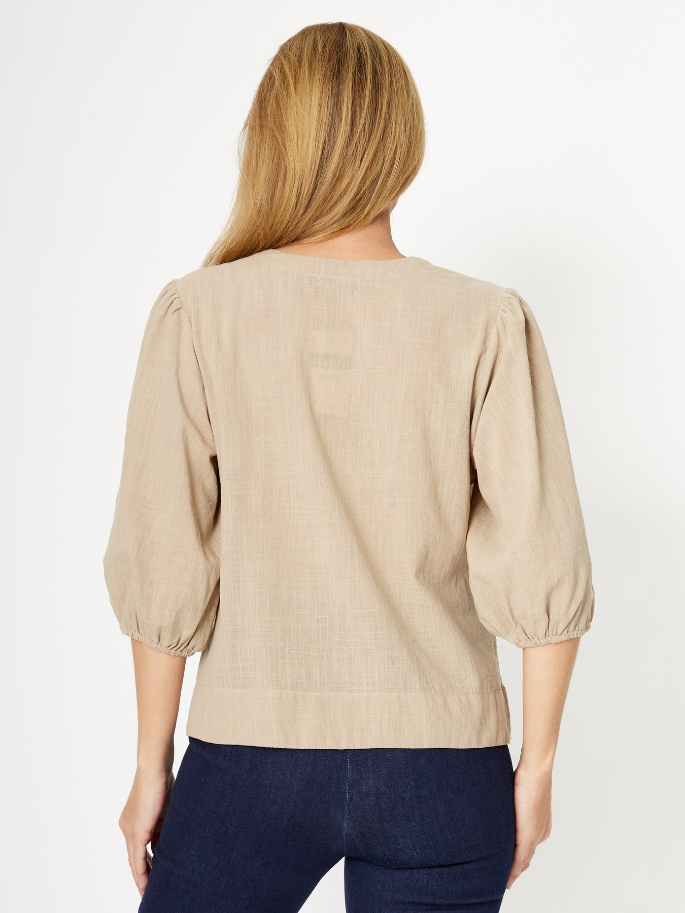 Cotton Balloon Sleeve V Shirt -Sand - 31993