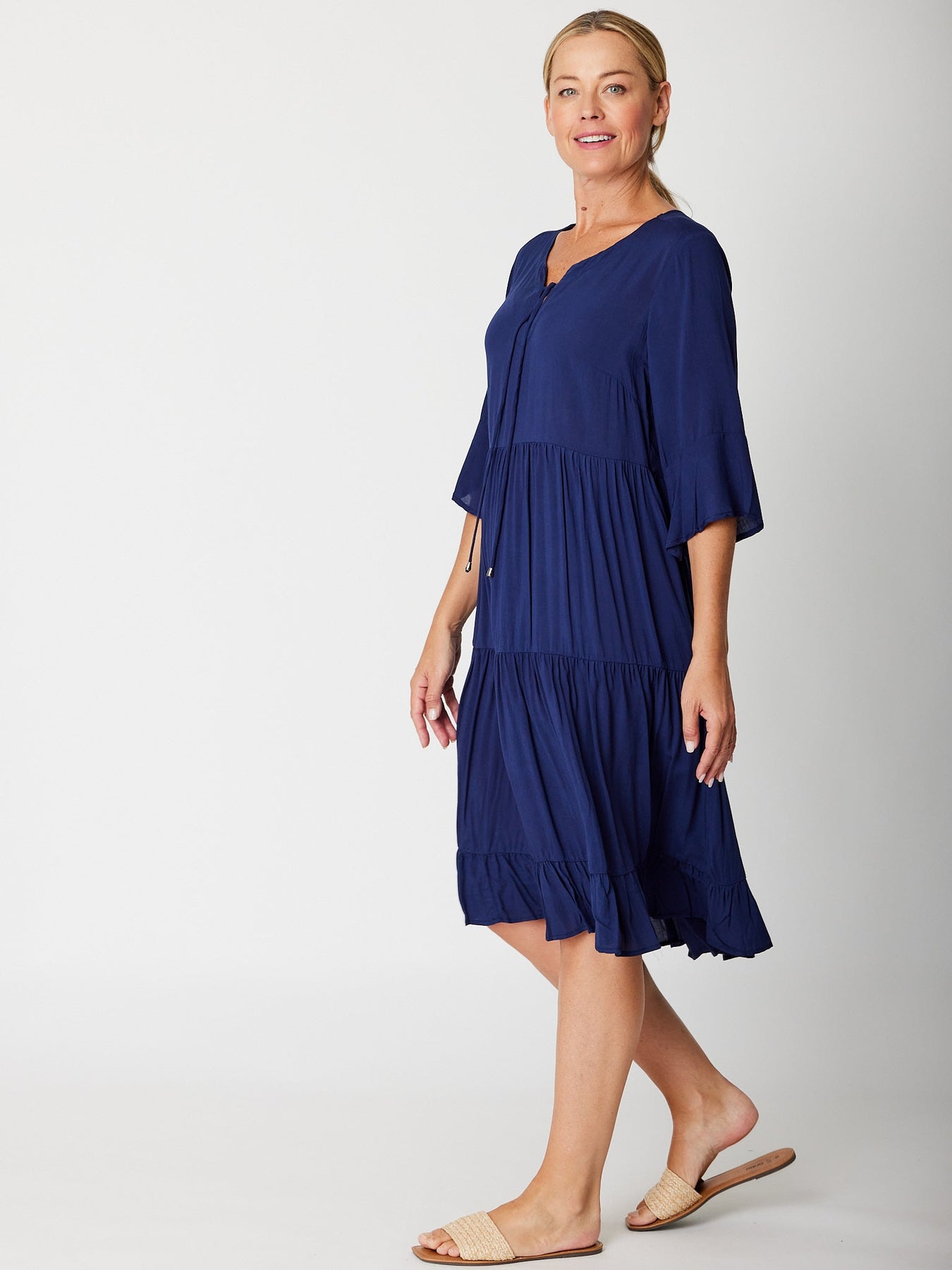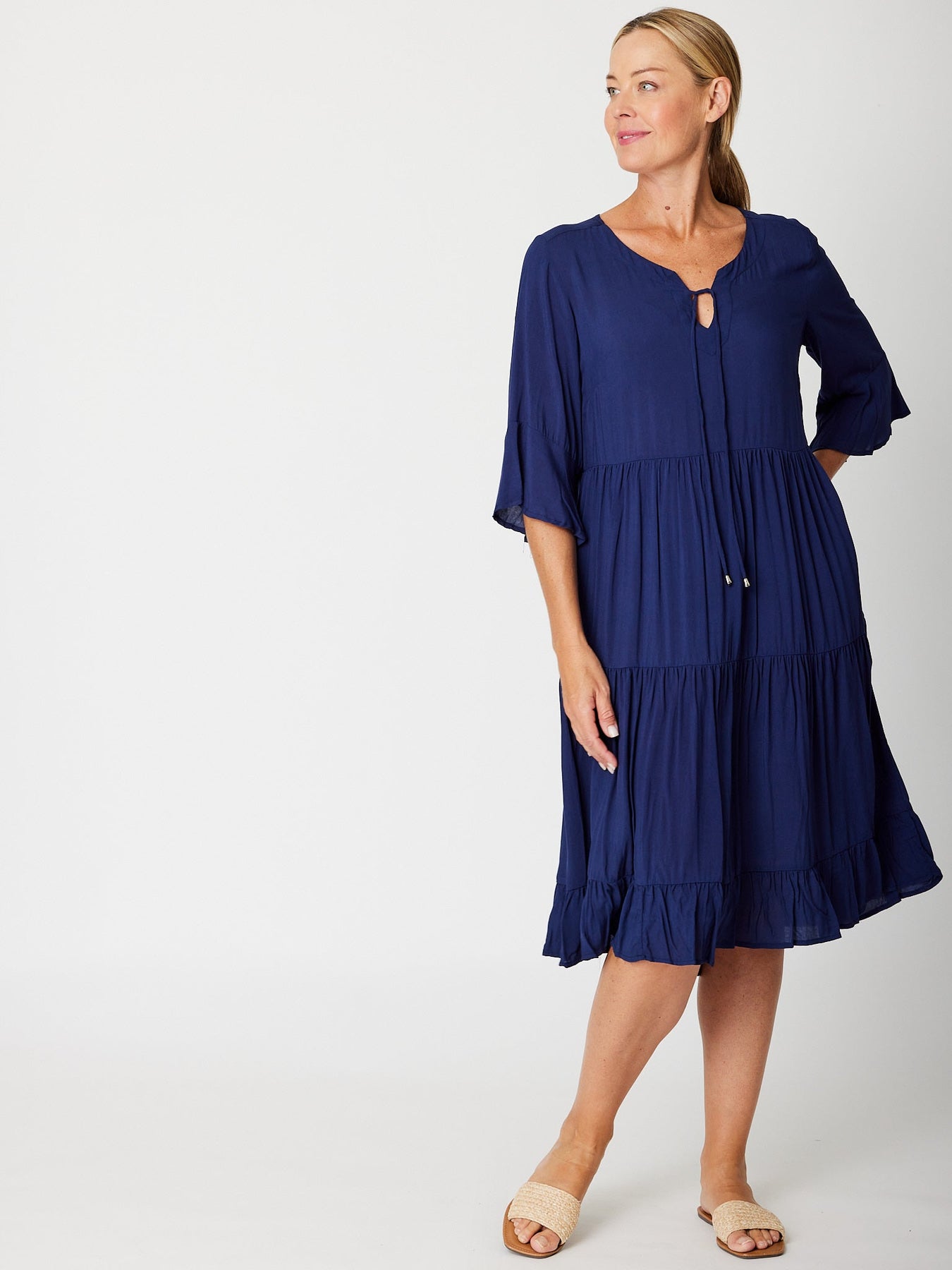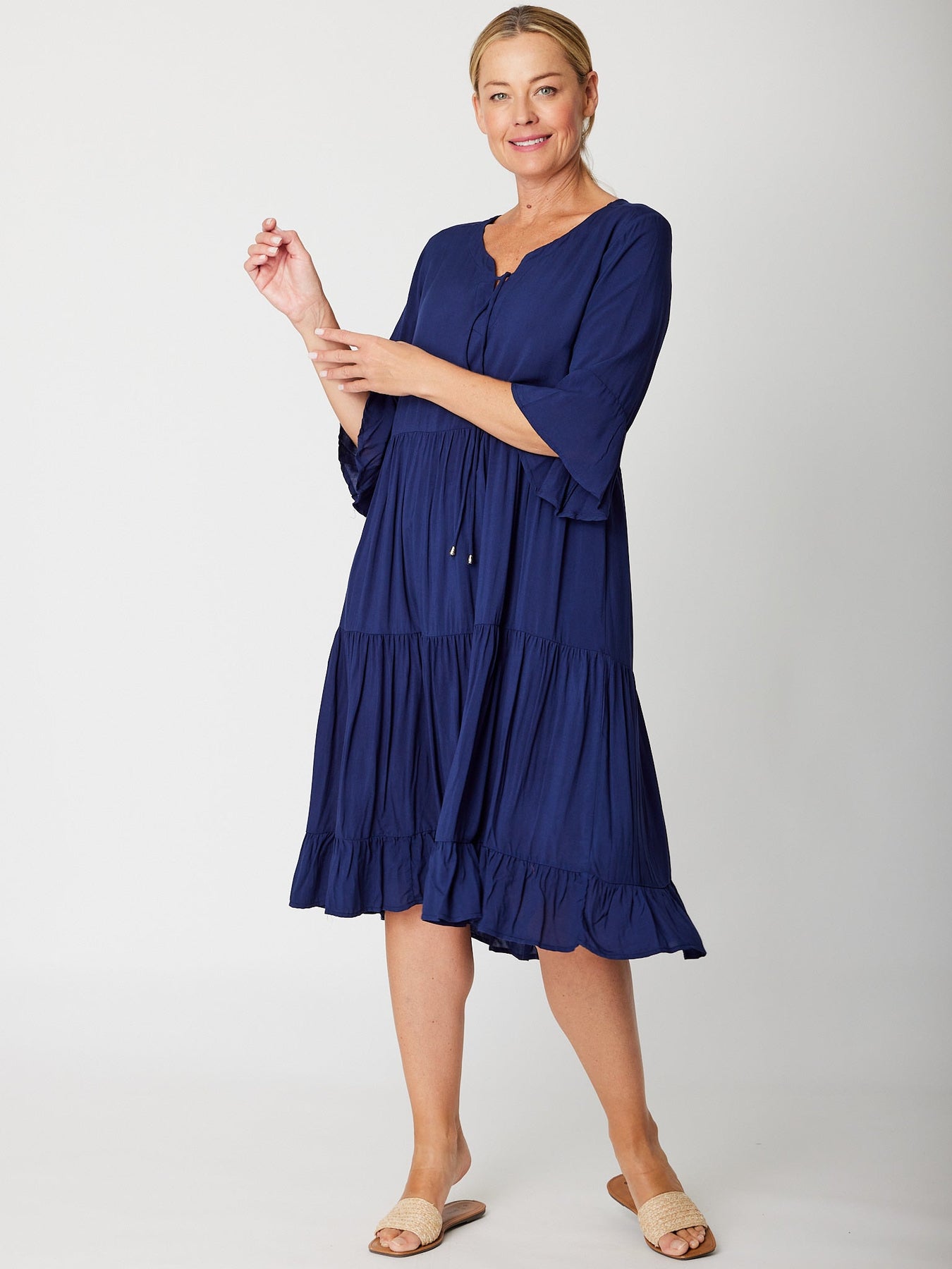 The Jessie 3/4 sleeve tiered dress is crafted from super fine rayon, offering a lightweight feel perfect for warm days. Its knee-length design combines comfort with effortless style, making it an ideal choice to stay cool while looking polished. Embrace easy elegance with this breathable, flattering dress.