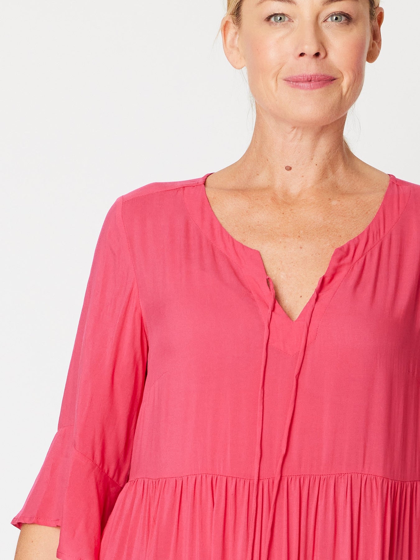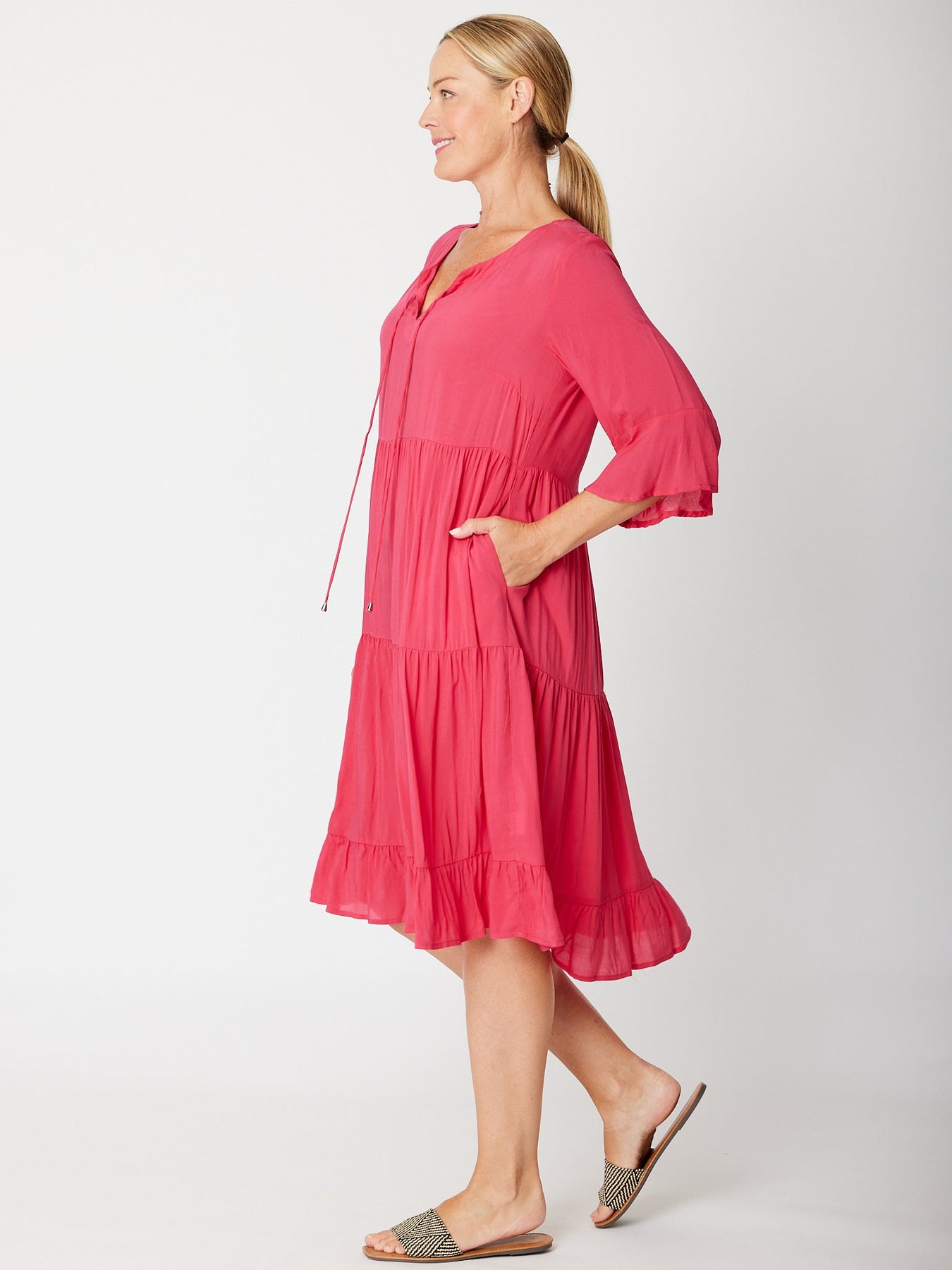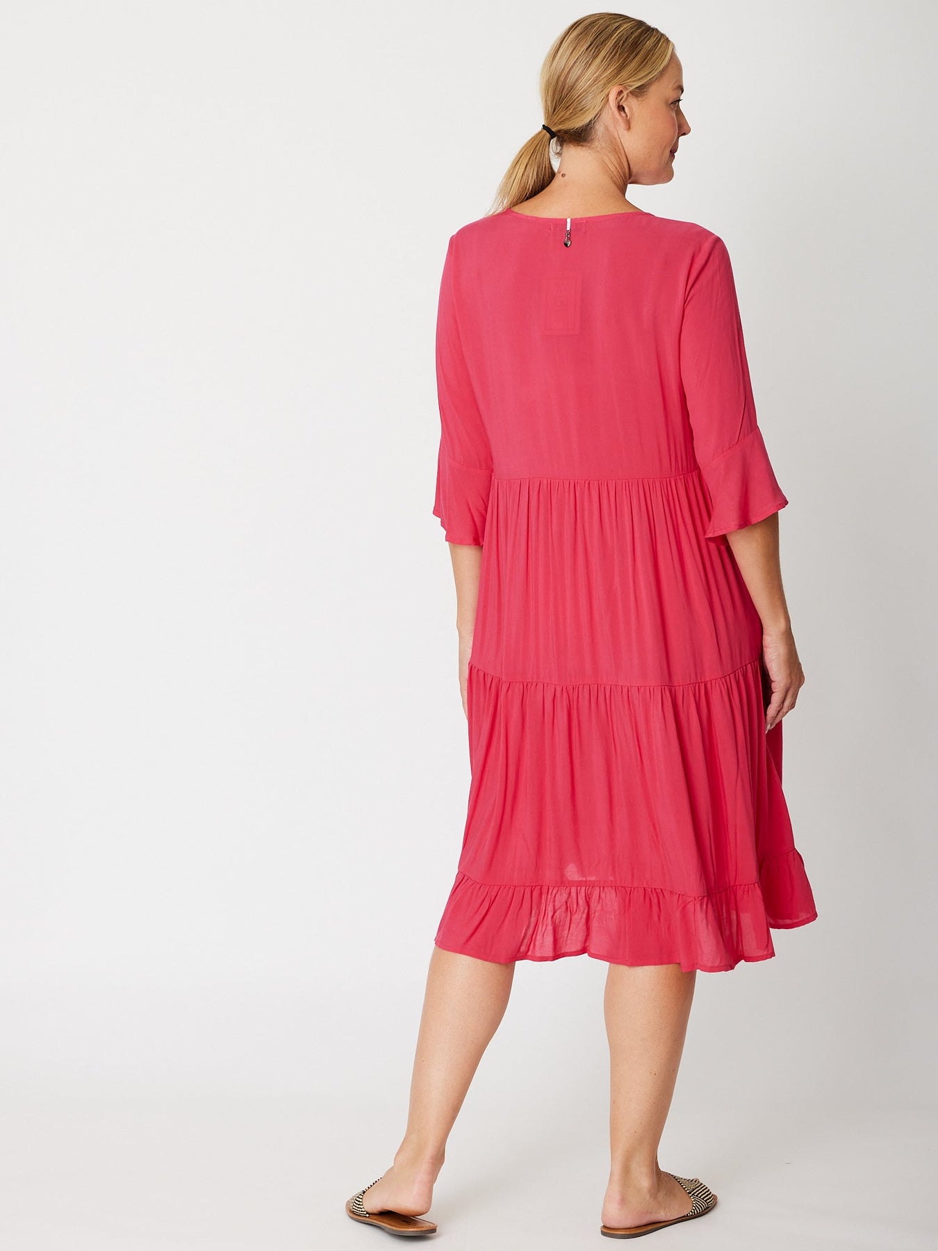 The Jessie 3/4 sleeve tiered dress is crafted from super fine rayon, offering a lightweight feel perfect for warm days. Its knee-length design combines comfort with effortless style, making it an ideal choice to stay cool while looking polished. Embrace easy elegance with this breathable, flattering dress.