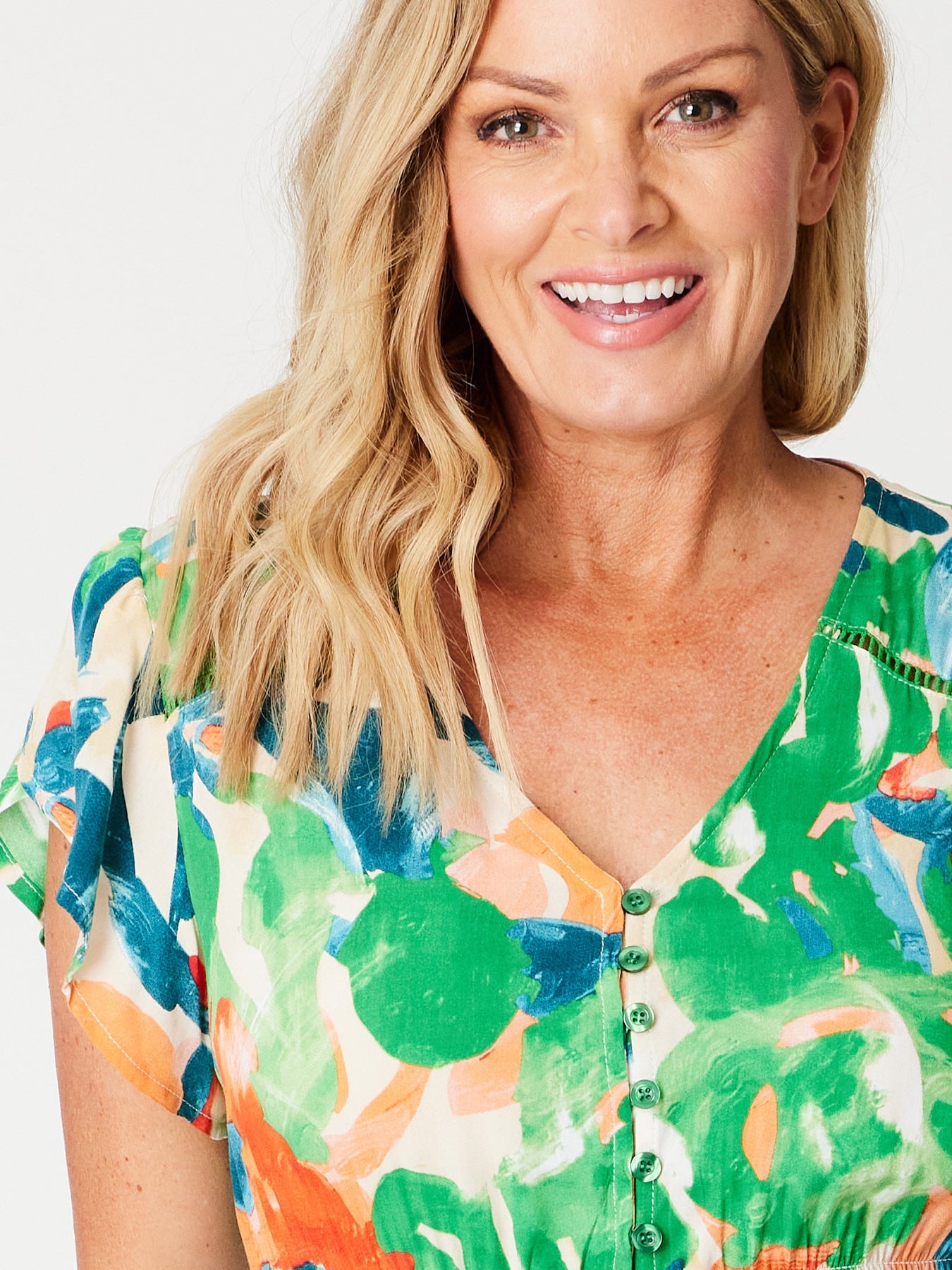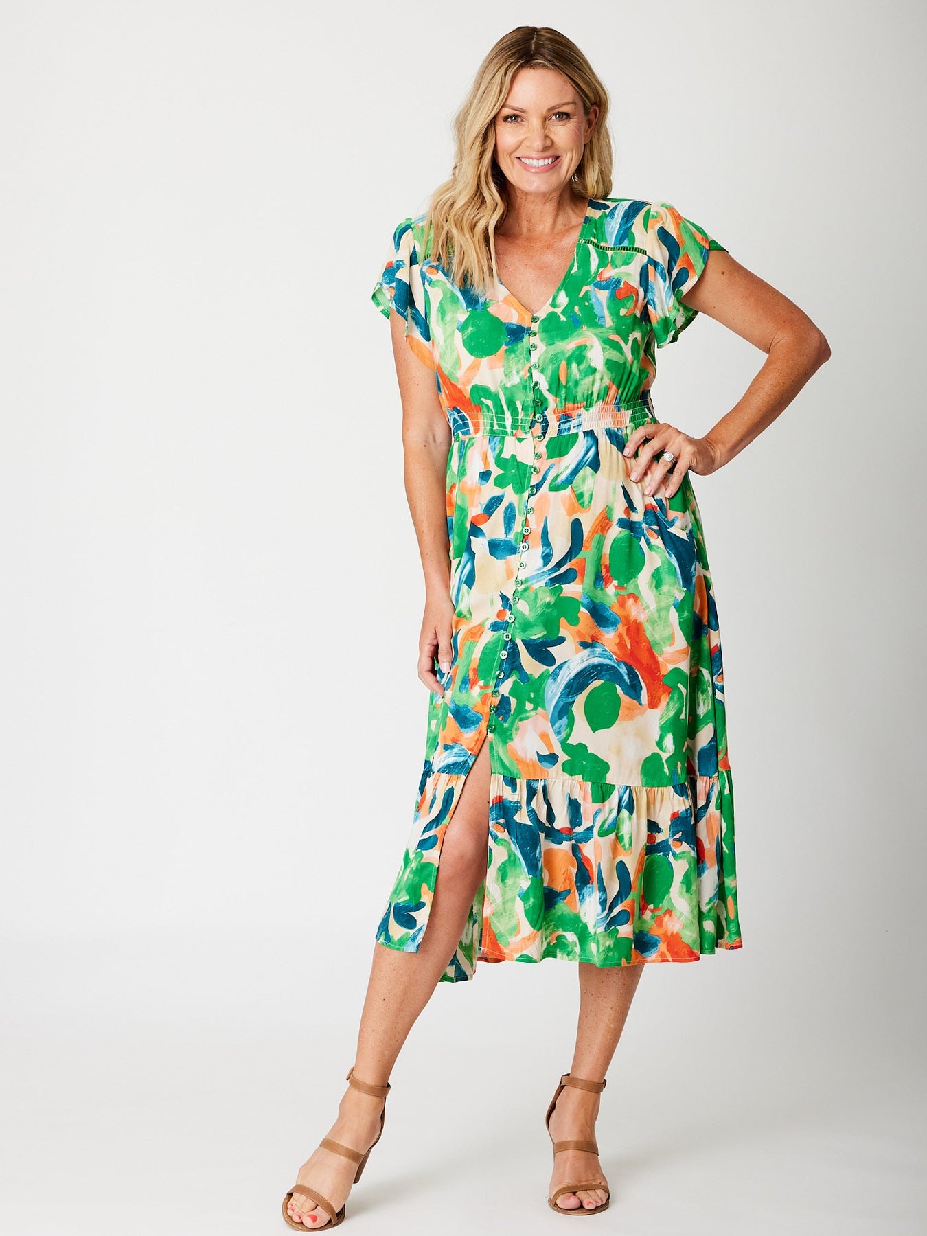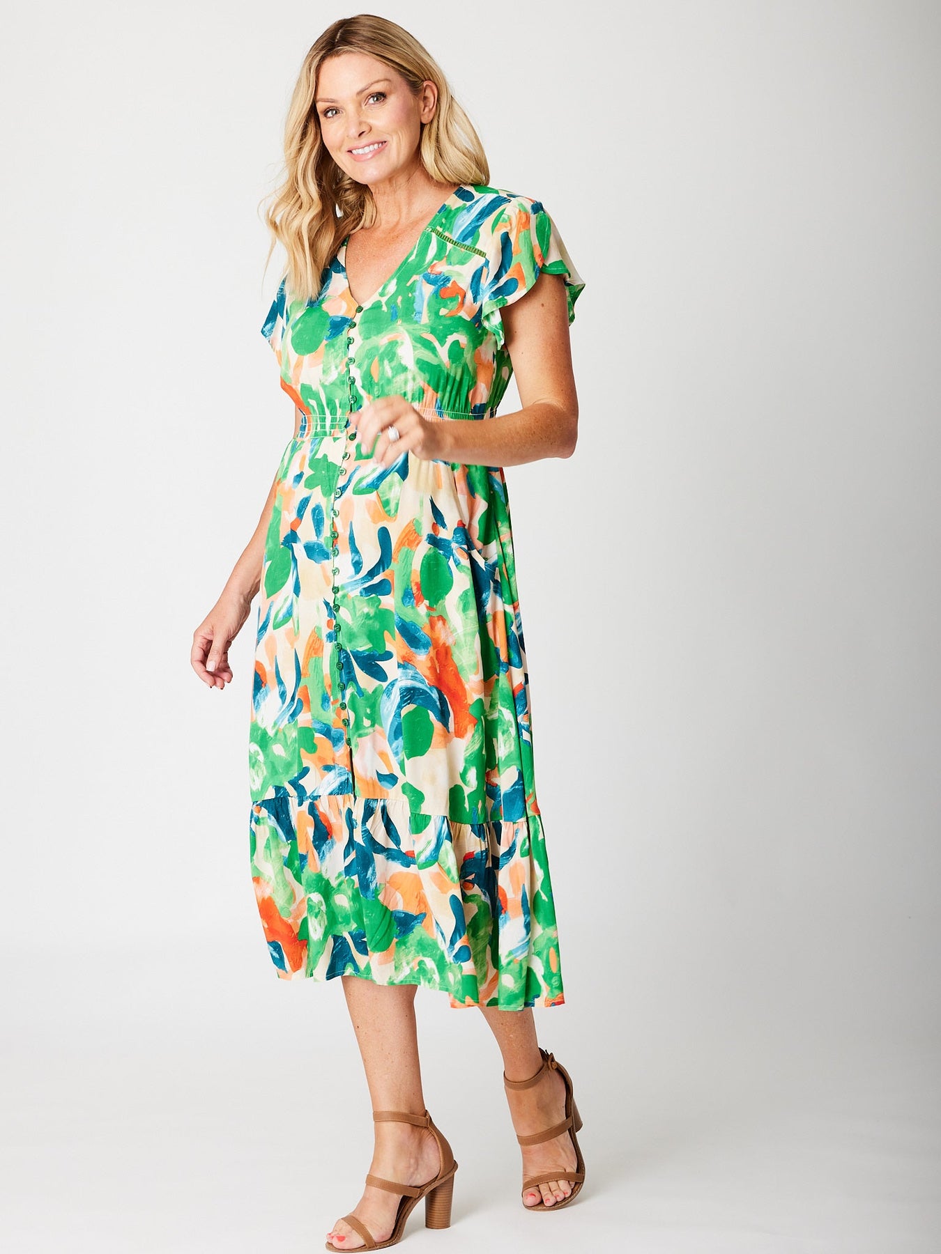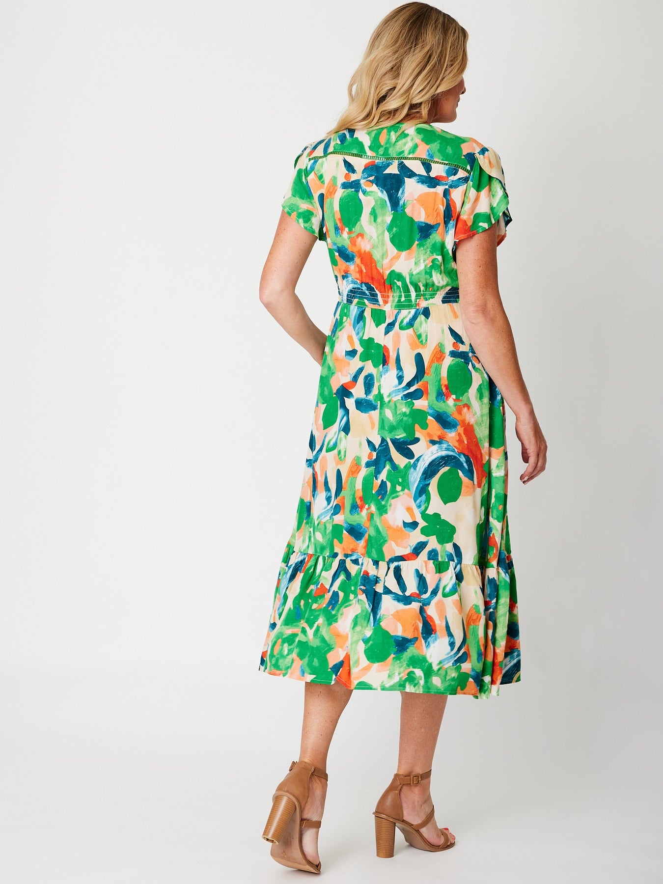 Elevate your wardrobe with the V Neck Green Jilly Dress—a charming piece that effortlessly combines style and comfort. This button-through design features a flattering shirred waist that defines your silhouette, while playful fluttered sleeves add a touch of feminine elegance. The decorative frill hemline creates movement and visual interest with every step. Perfect for casual outings or dressed-up occasions, this versatile green dress brings a fresh, vibrant energy to any look. A must-have staple that transitions beautifully from day to night.