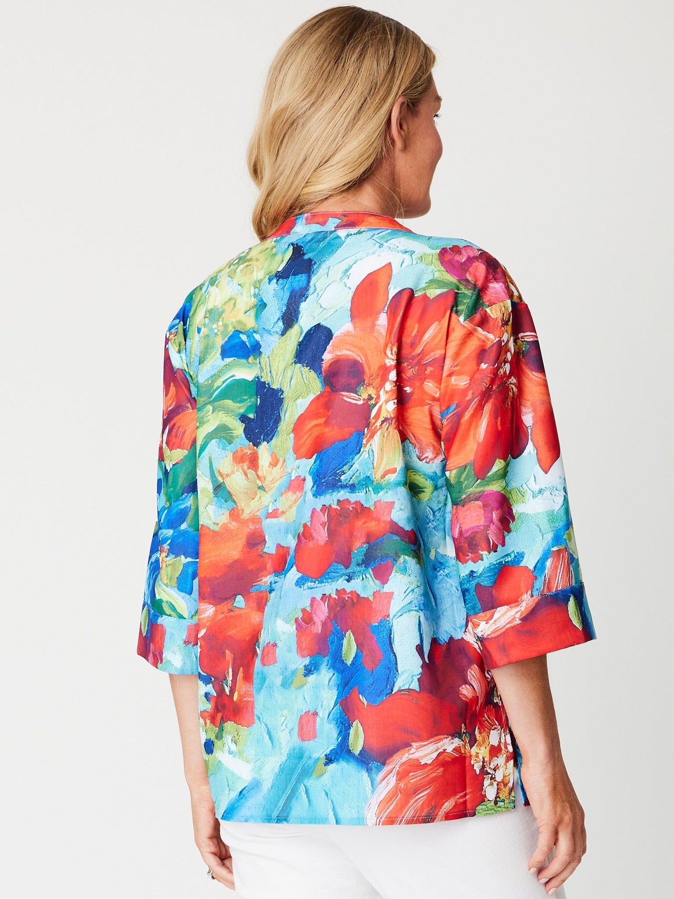 Elevate your wardrobe with this eye-catching kimono sleeve top featuring a stunning watercolour print in vibrant multi-tones. The relaxed nehru neckline and convenient half-opening create an effortlessly chic silhouette, while the generous three-quarter length sleeves add movement and style. Perfect for layering or wearing solo, this fun, longer-cut top transitions seamlessly from casual days to weekend adventures. A versatile piece that brings artistic flair to any outfit.
