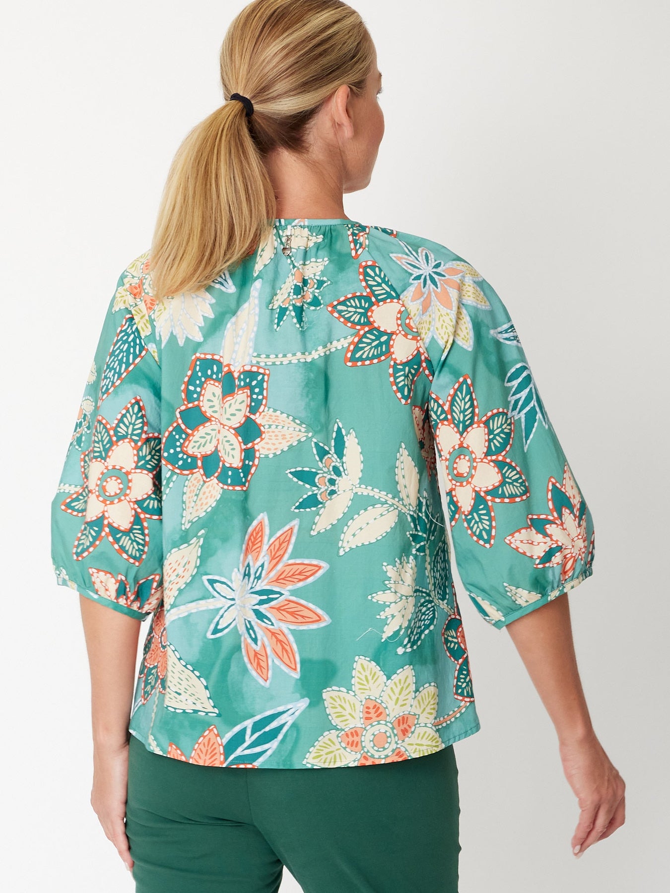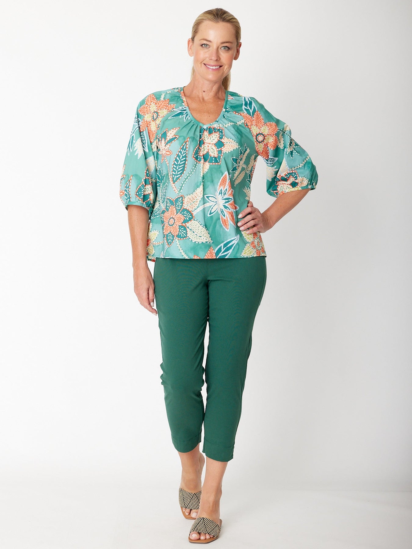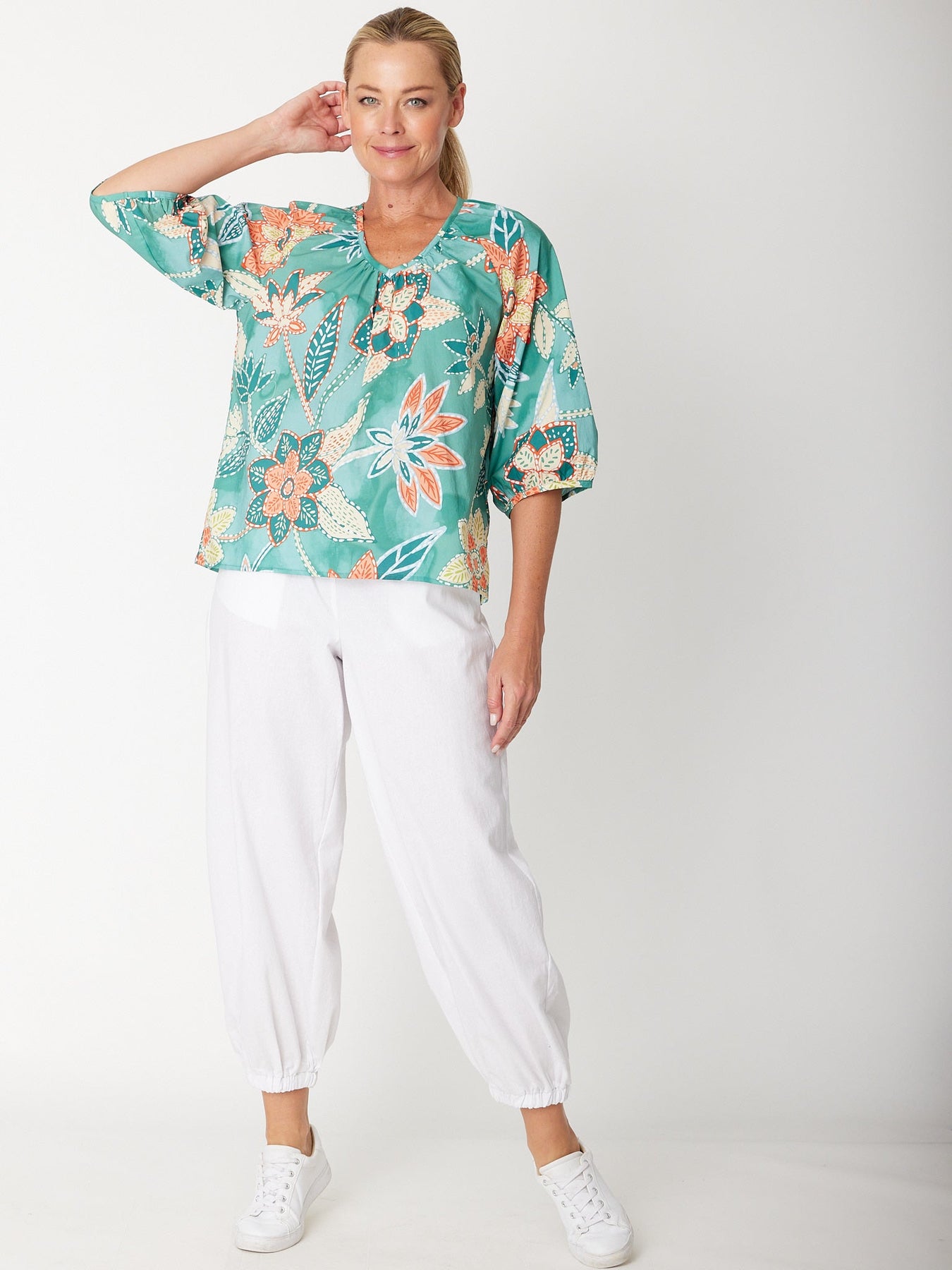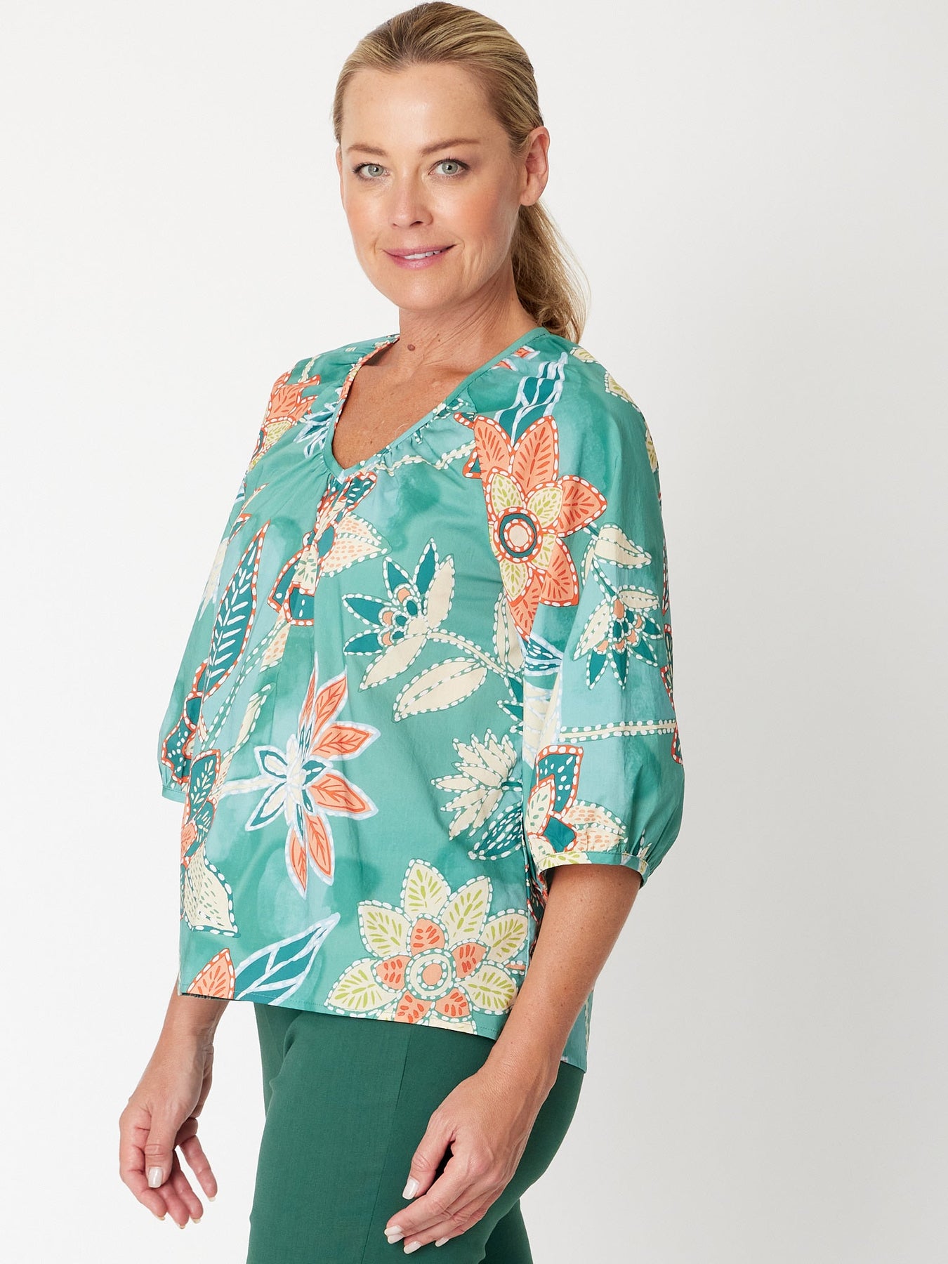 This Larisa Vee Print Top in refreshing mint features a flattering vee neckline and elbow-length balloon sleeves for a feminine touch. Crafted from soft cotton, it ensures comfort throughout the day. Simply choose your bust size for the perfect fit—ideal for effortless style with a gentle fit and elegant silhouette. Non stretch
