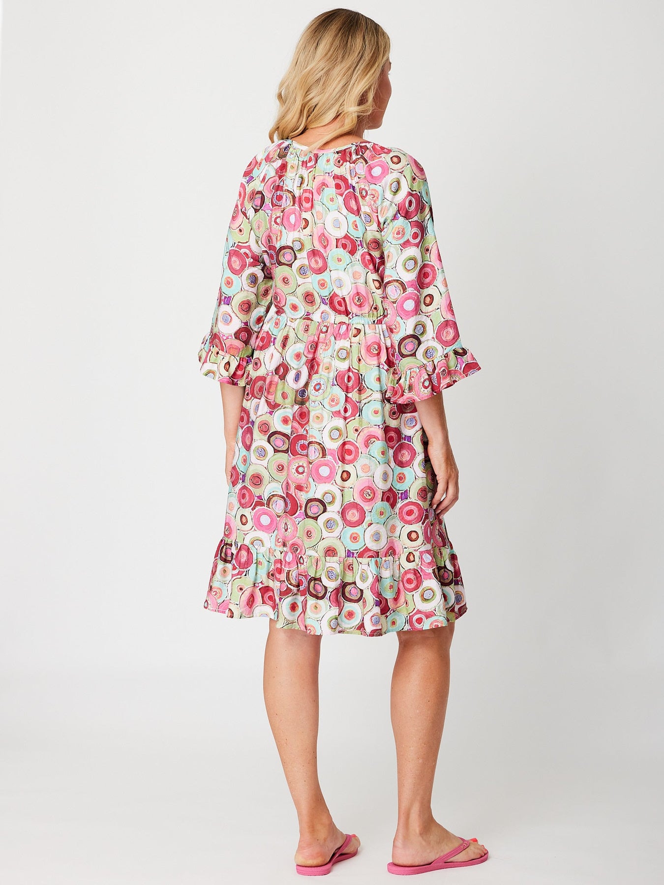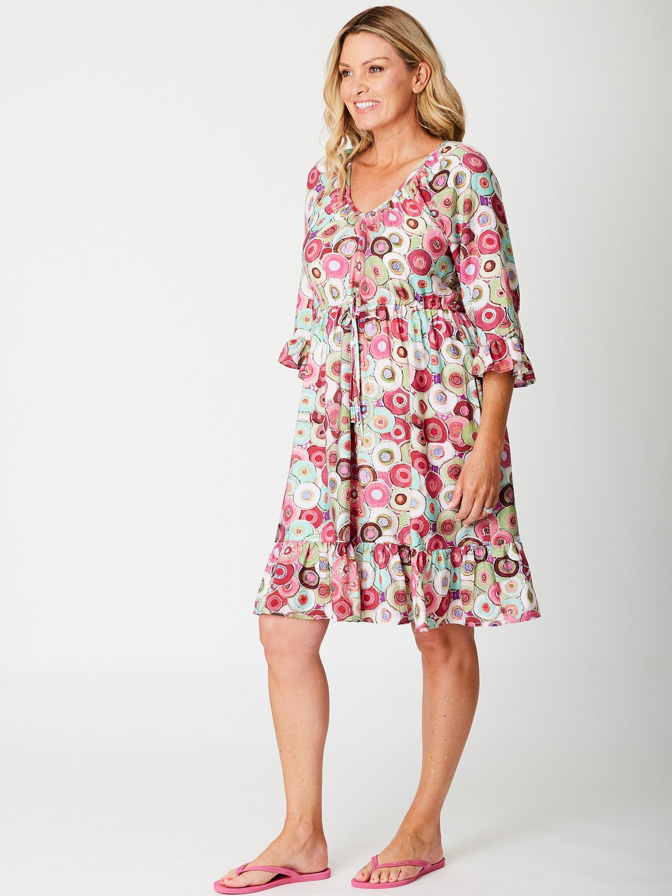Effortlessly chic and undeniably comfortable, this V-neck RASPBERRY dress combines relaxed elegance with playful details. The drawstring waist lets you customize your silhouette, while fluttered bell sleeves add movement and dimension. A charming frill hemline brings a touch of whimsy to the three-quarter length cut, making it perfect for casual outings or weekend gatherings. The relaxed fit ensures all-day comfort without compromising on style. Versatile enough to dress up or down, this piece is a wardrobe essential that delivers both comfort and contemporary flair.