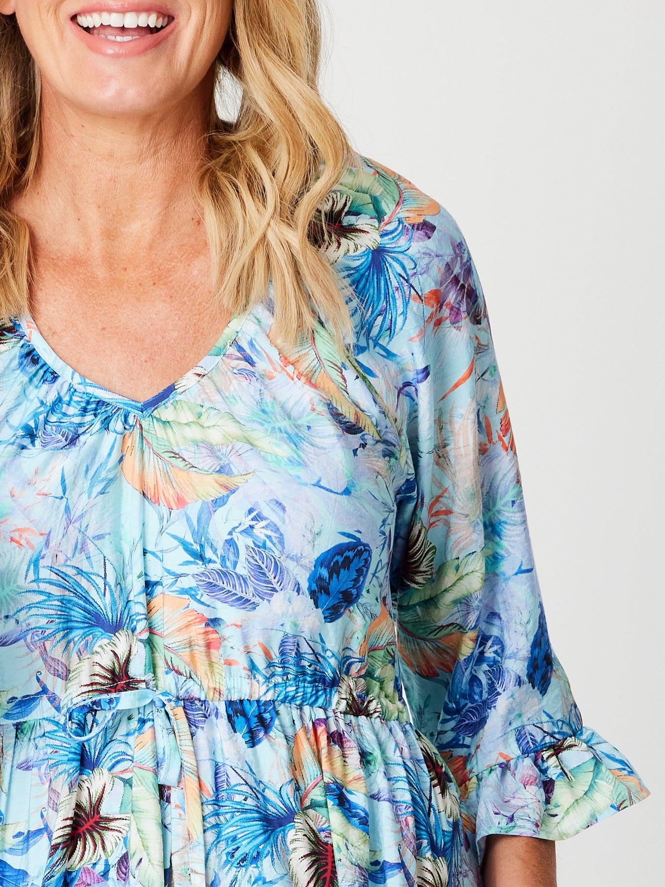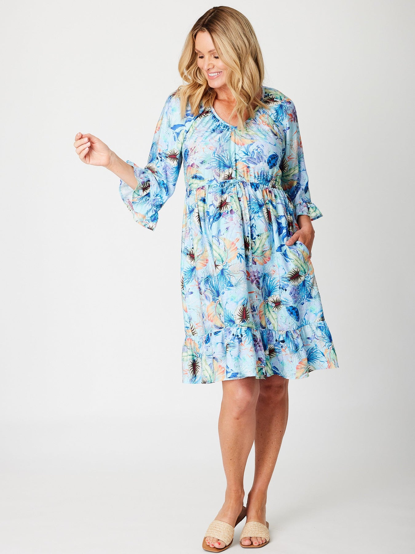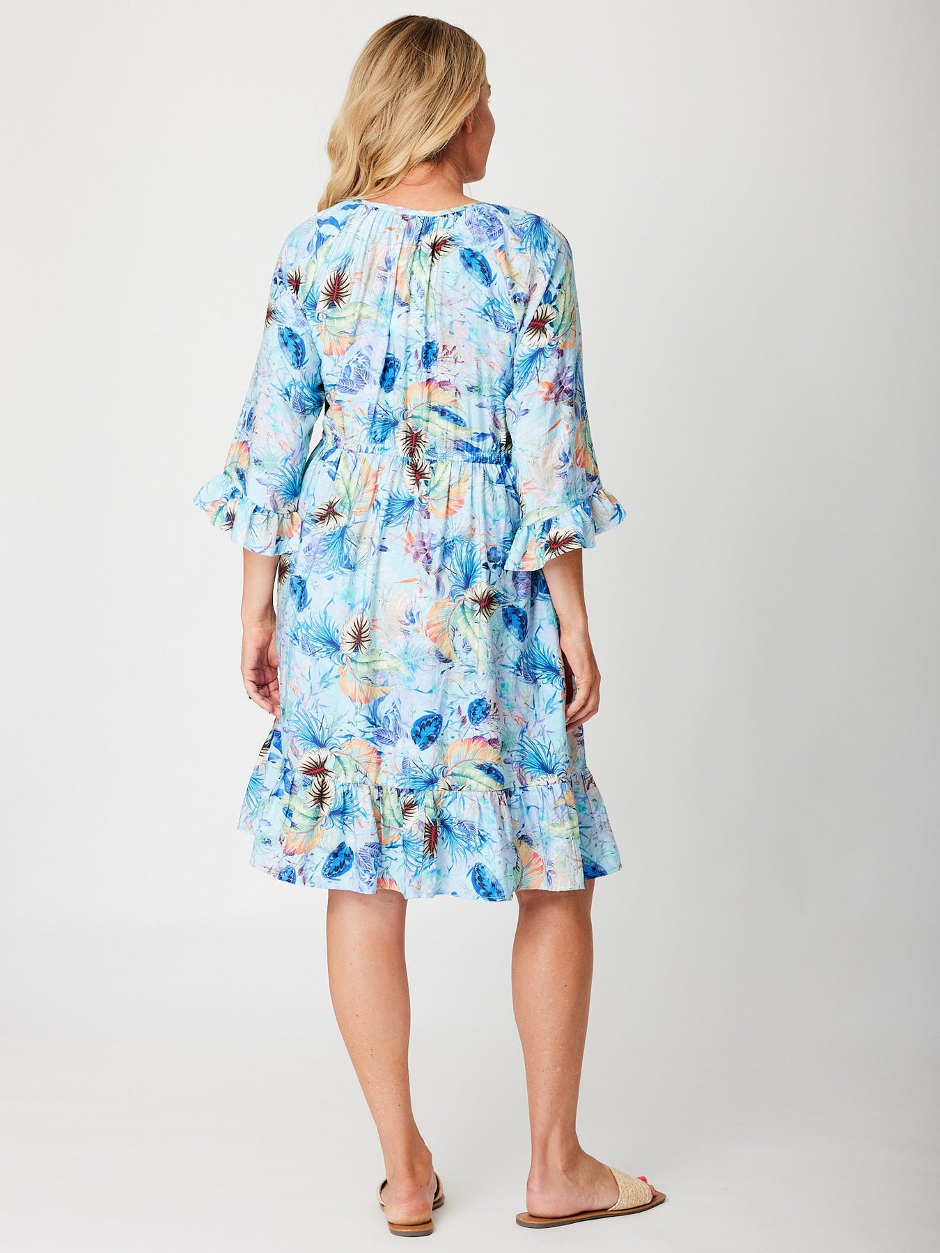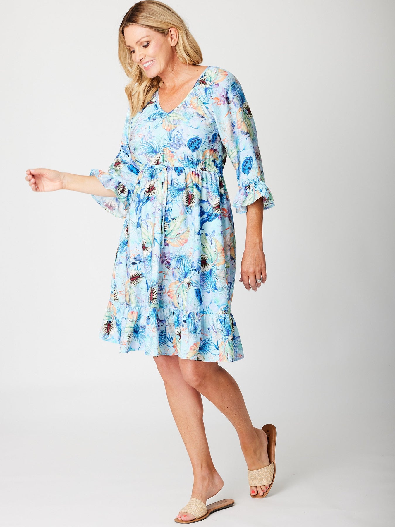Effortlessly chic and undeniably comfortable, this V-neck TURQ dress combines relaxed elegance with playful details. The drawstring waist lets you customize your silhouette, while fluttered bell sleeves add movement and dimension. A charming frill hemline brings a touch of whimsy to the three-quarter length cut, making it perfect for casual outings or weekend gatherings. The relaxed fit ensures all-day comfort without compromising on style. Versatile enough to dress up or down, this piece is a wardrobe essential that delivers both comfort and contemporary flair.