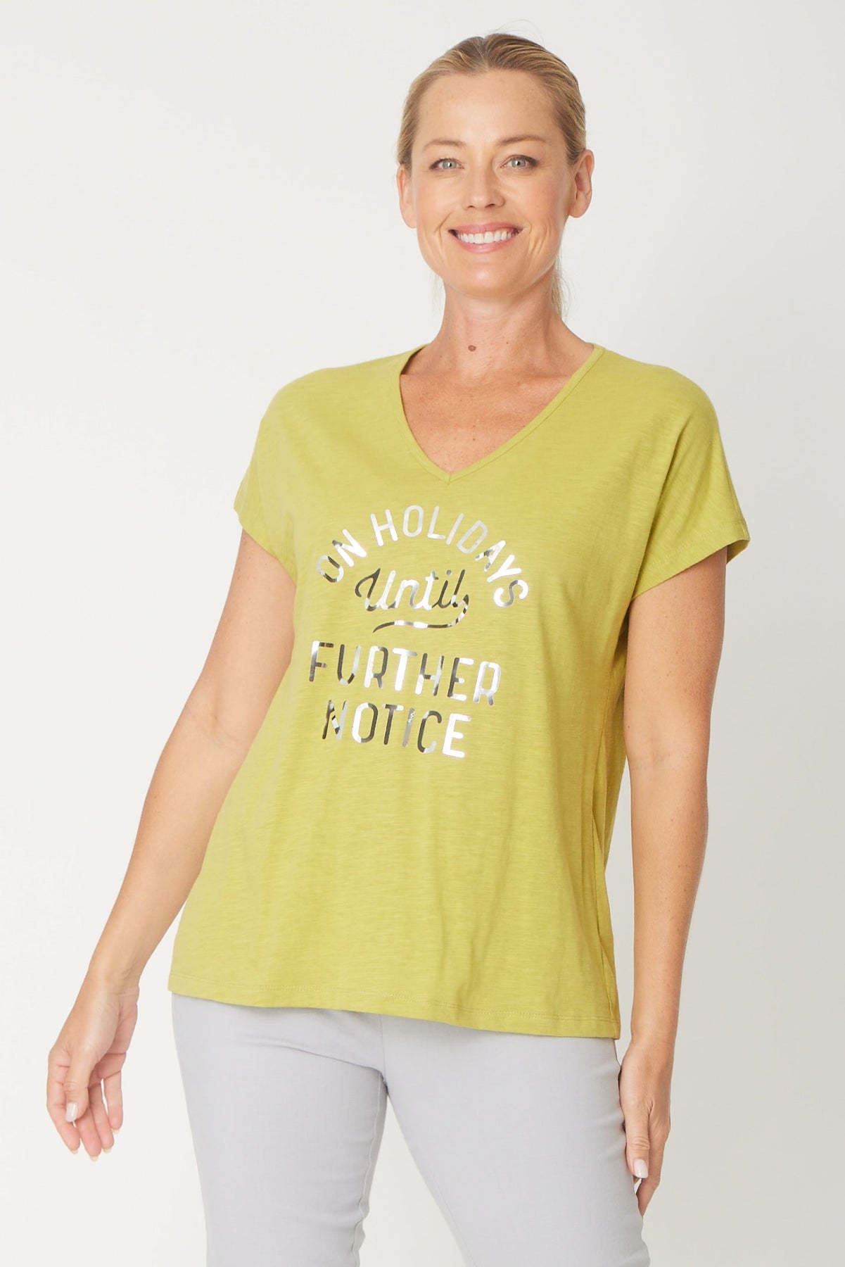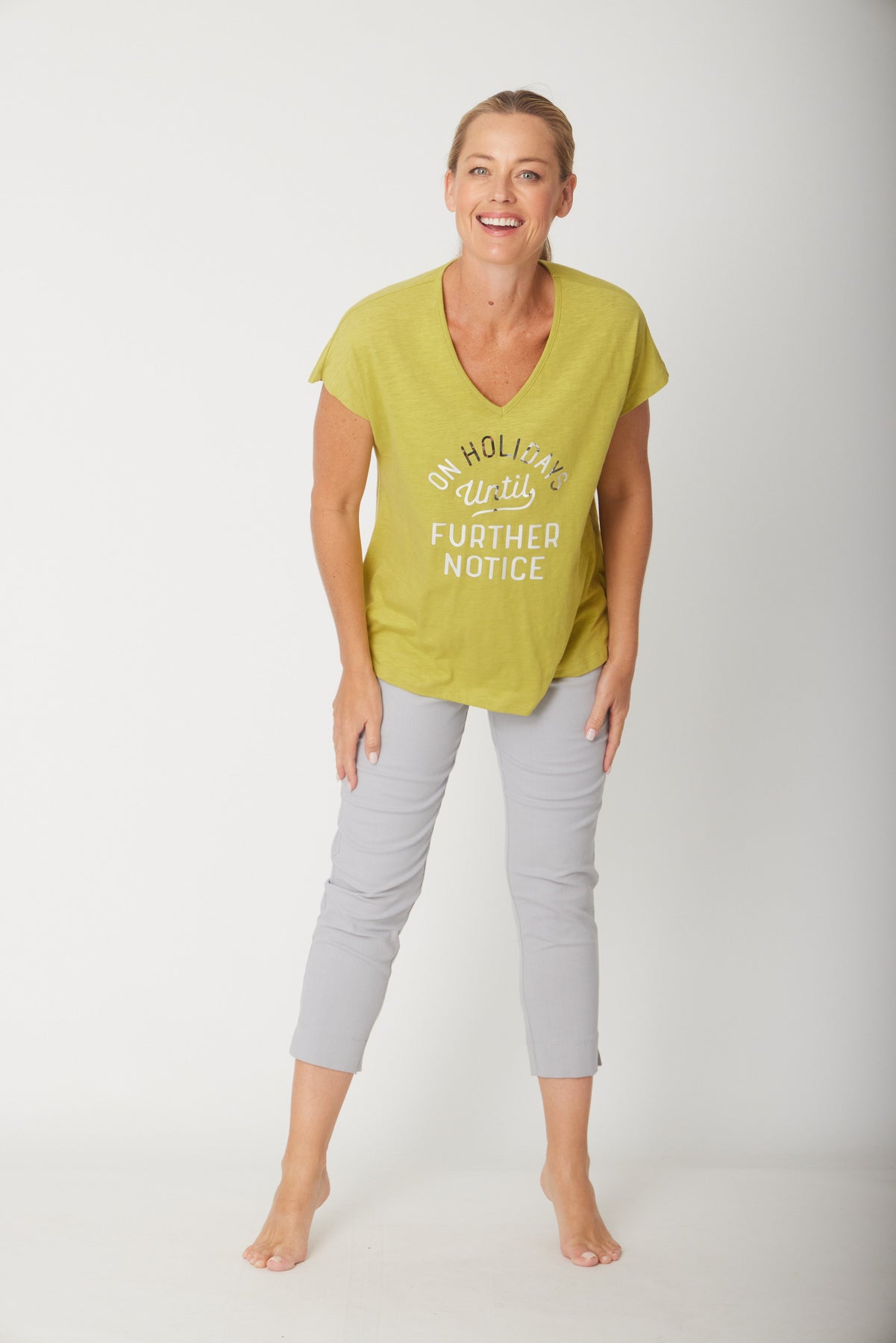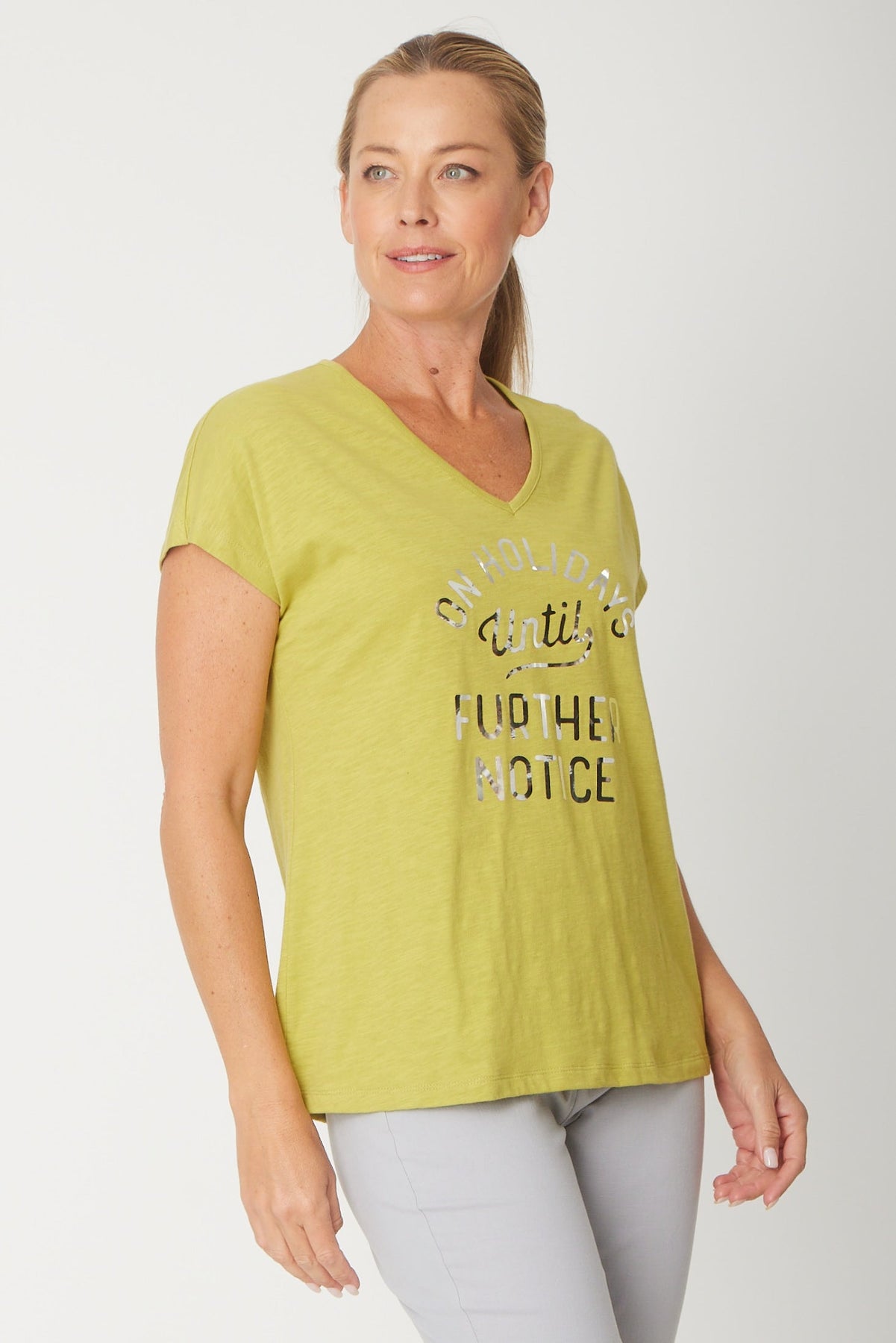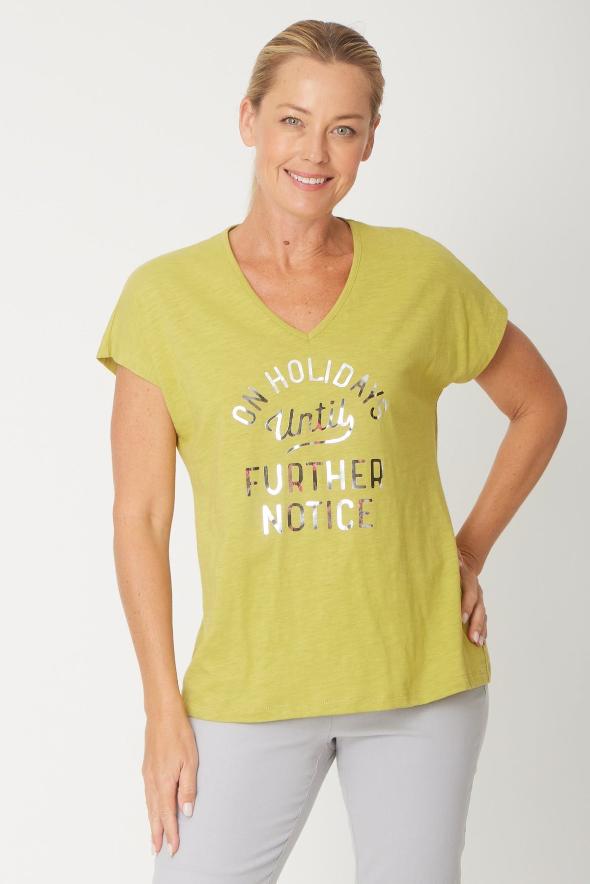 Escape the everyday in our On Holidays Tee, crafted from soft slub cotton jersey that feels as relaxed as your vacation mindset. The classic vee neckline flatters while short sleeves keep you cool and comfortable. A playful foil print declaring "on holidays" adds personality to your casual wardrobe—perfect for those who live for getaway season. Versatile enough for lounging or layering, this tee brings effortless style to your collection.