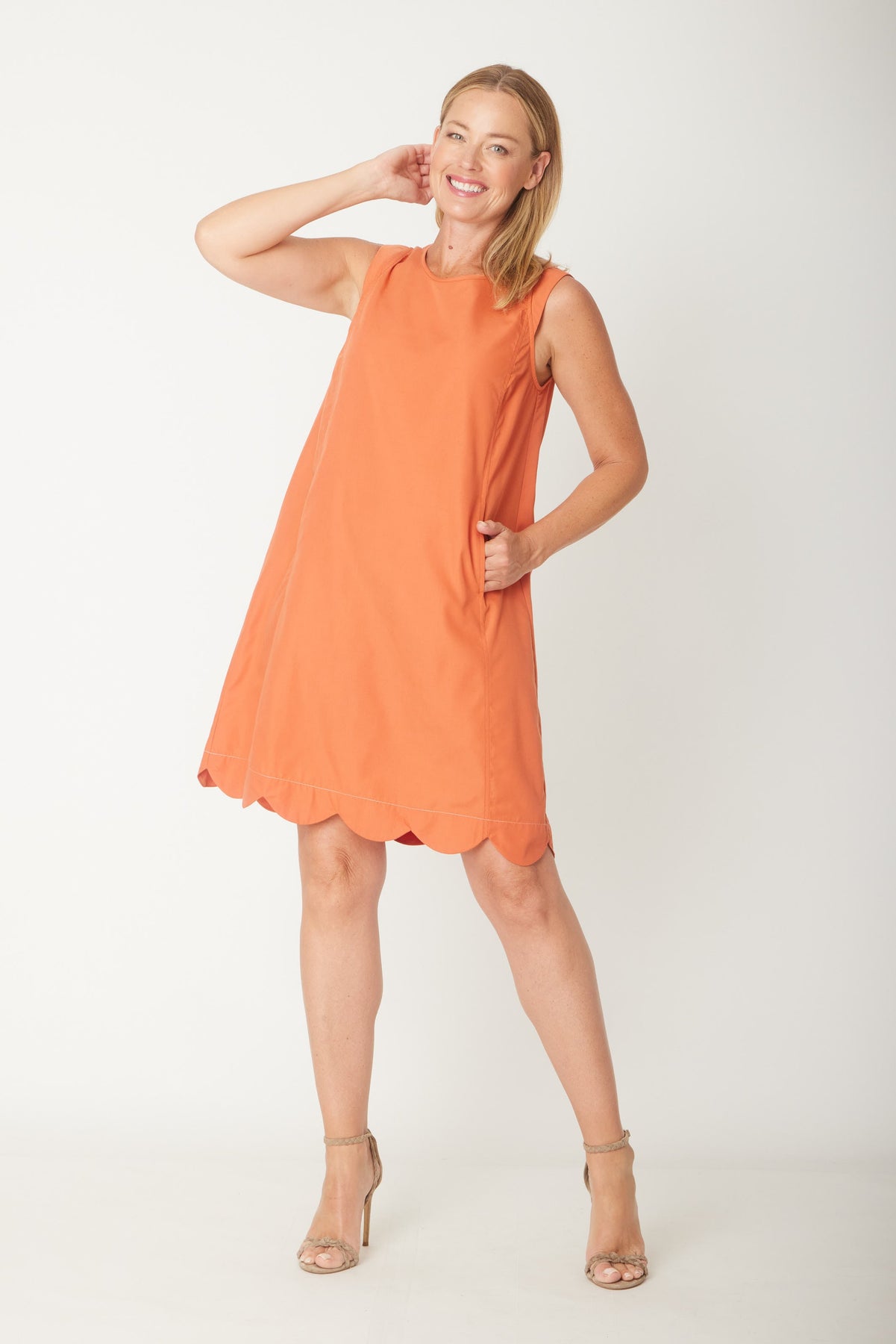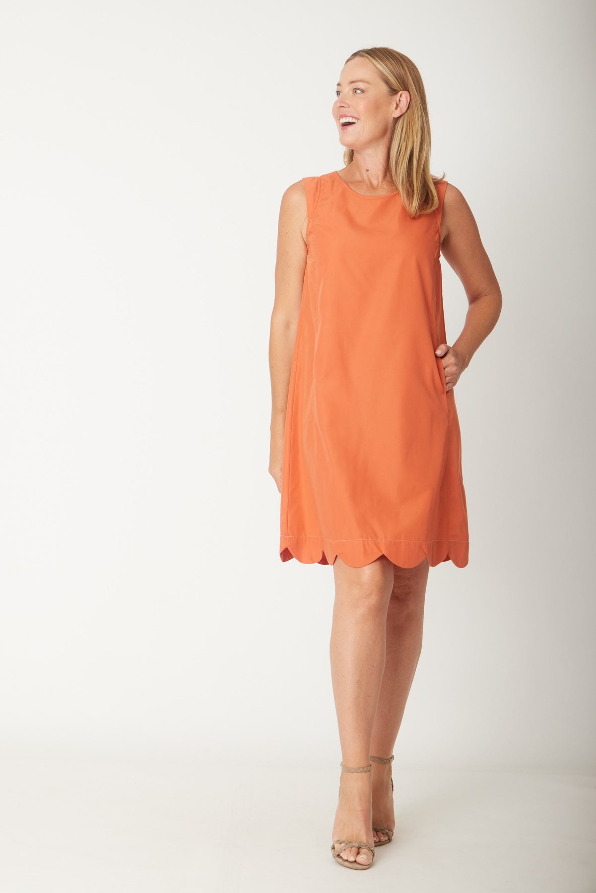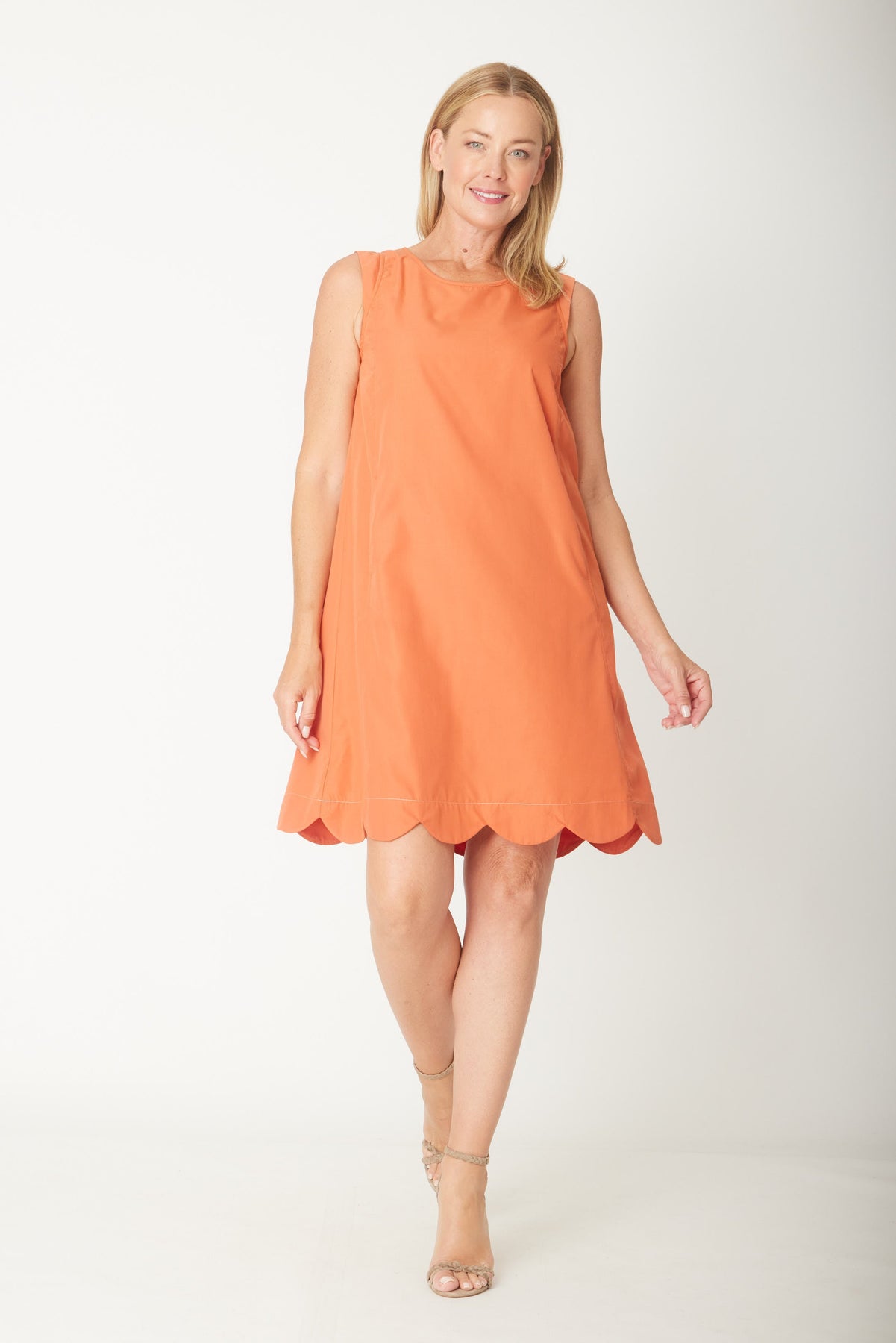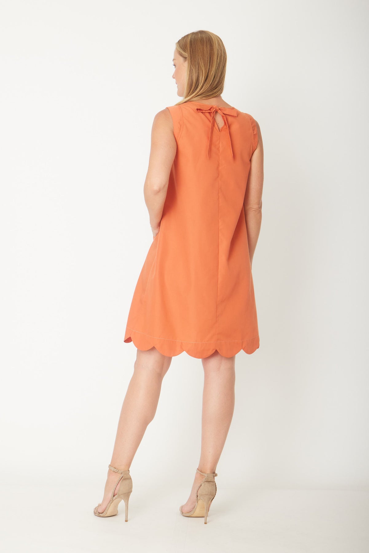 Effortless elegance meets everyday practicality in this versatile cotton dress. The classic A-line silhouette flatters all figures while the round neckline and sleeveless design offer breathable comfort for warm weather. Functional side pockets keep your essentials within reach, and the charming scalloped hem adds a delicate finishing touch. Perfect for casual outings, weekend gatherings, or layering with your favourite cardigan, this timeless piece deserves a permanent spot in your wardrobe.