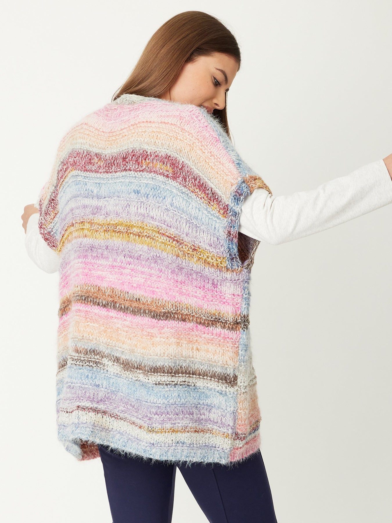 Transform your layering game with our Rainbow Vest, where vibrant multi-colour design meets everyday practicality. The relaxed, generous fit and hip-length silhouette create the perfect canvas for styling - simply throw it over your favourite skivvy for instant warmth and visual impact. This versatile piece bridges the gap between comfort and sophistication, effortlessly elevating casual outfits into curated looks. Whether you're seeking a statement layer or a reliable wardrobe staple, this exclusive vest delivers both style and substance. Make it yours and experience the difference quality craftsmanship brings to your collection.