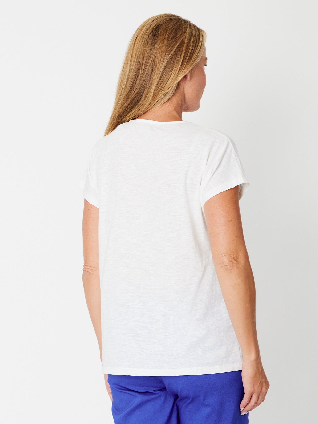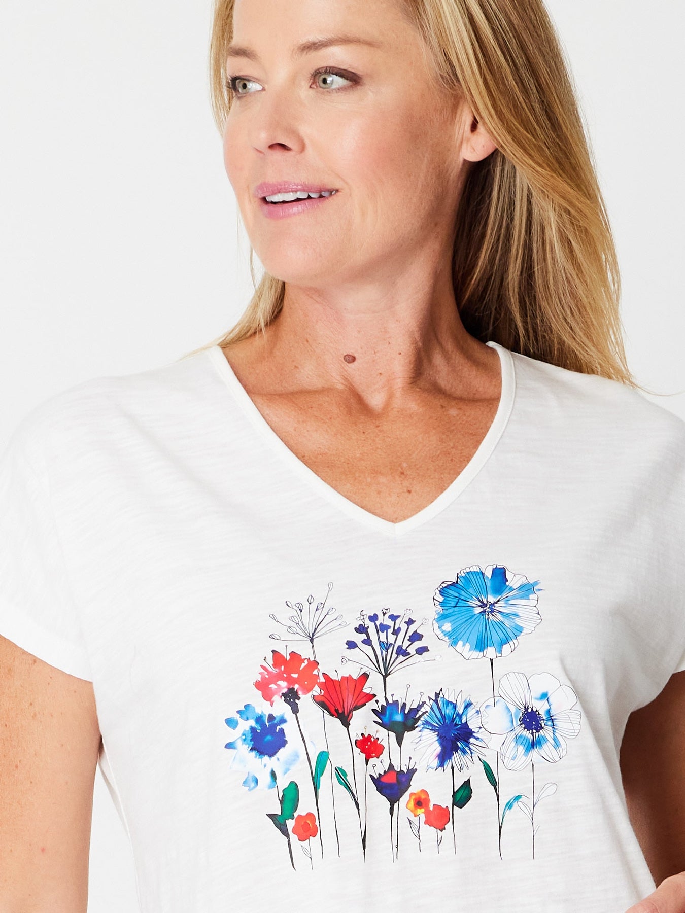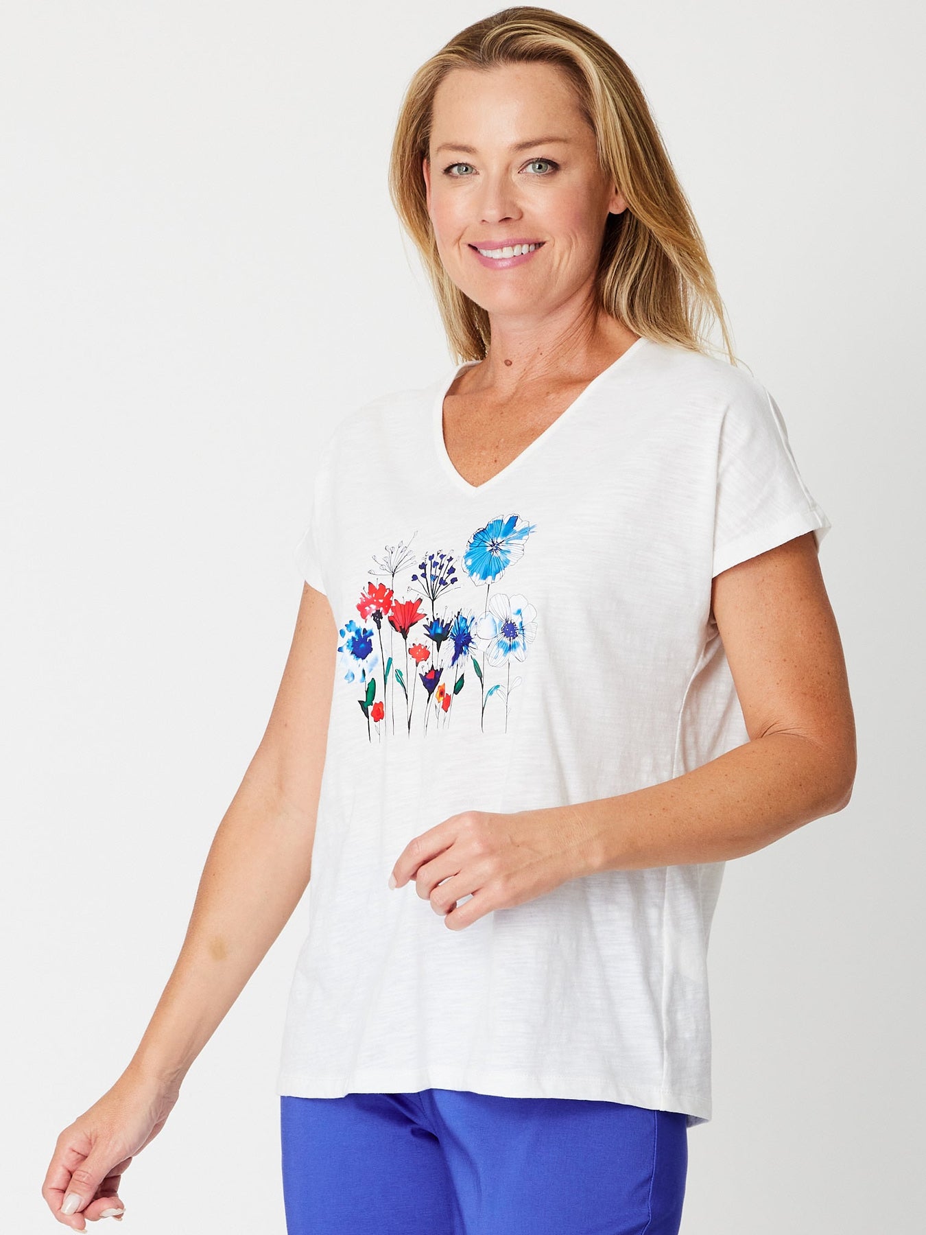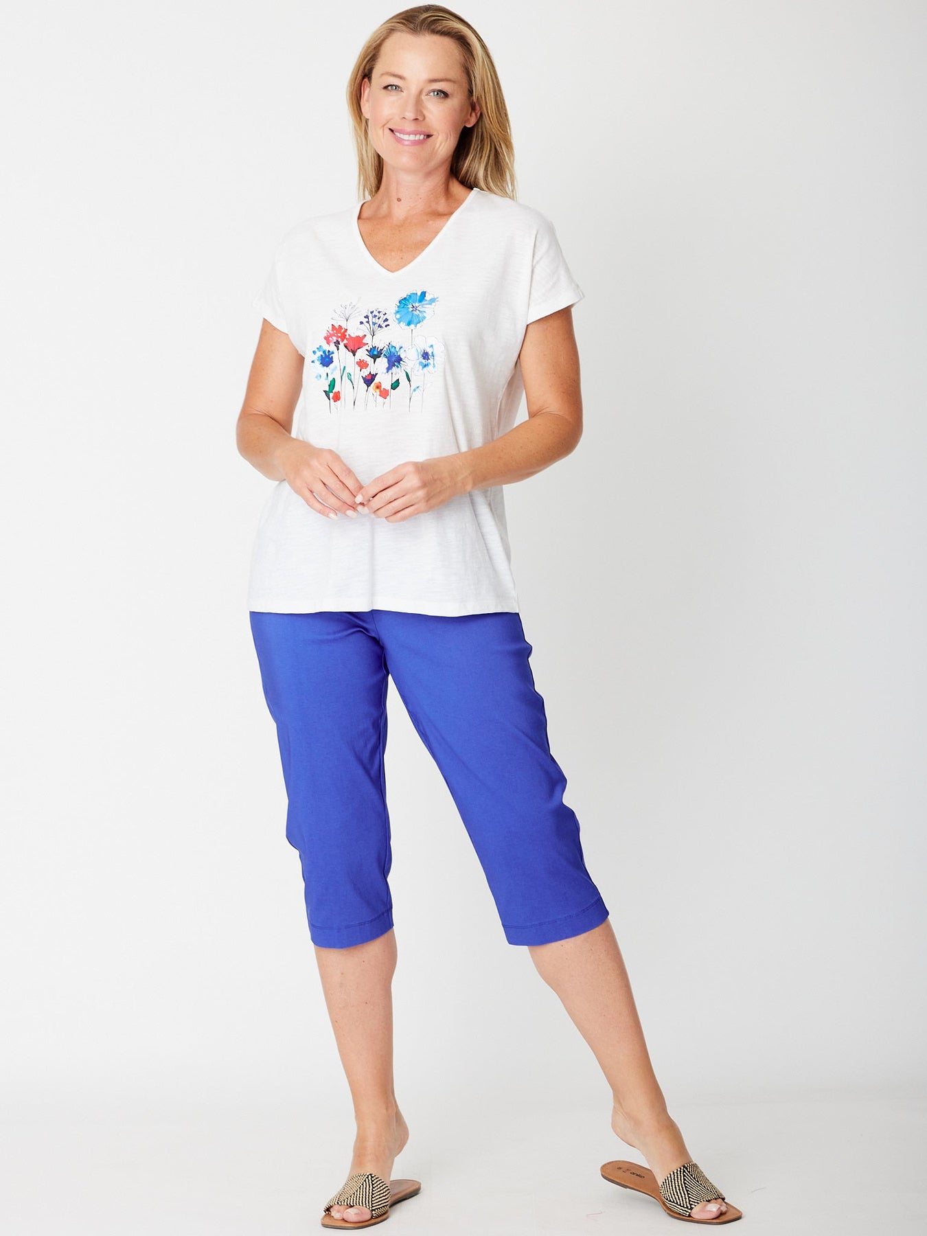 Embrace summer in style with the Royal Flowers White V-neck t-shirt, crafted from soft cotton jersey for breathable comfort. Its vibrant floral print adds a fresh, eye-catching touch perfect for warm days. Pair it effortlessly with our crop bengaline pants for a chic, coordinated look that combines comfort and colour with ease. Ideal for brightening your seasonal wardrobe.