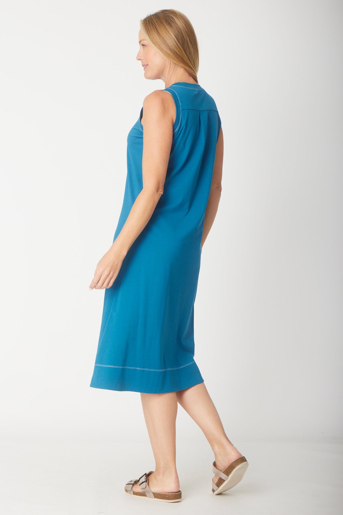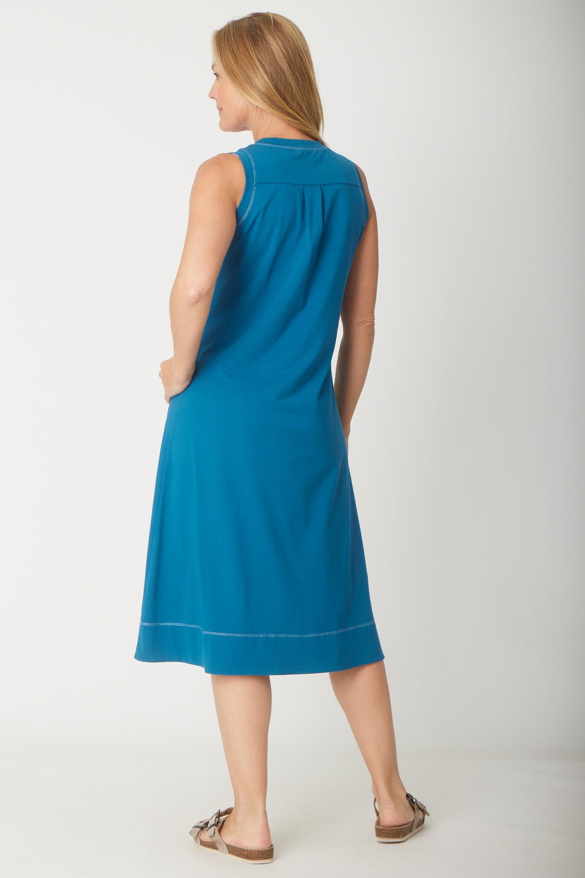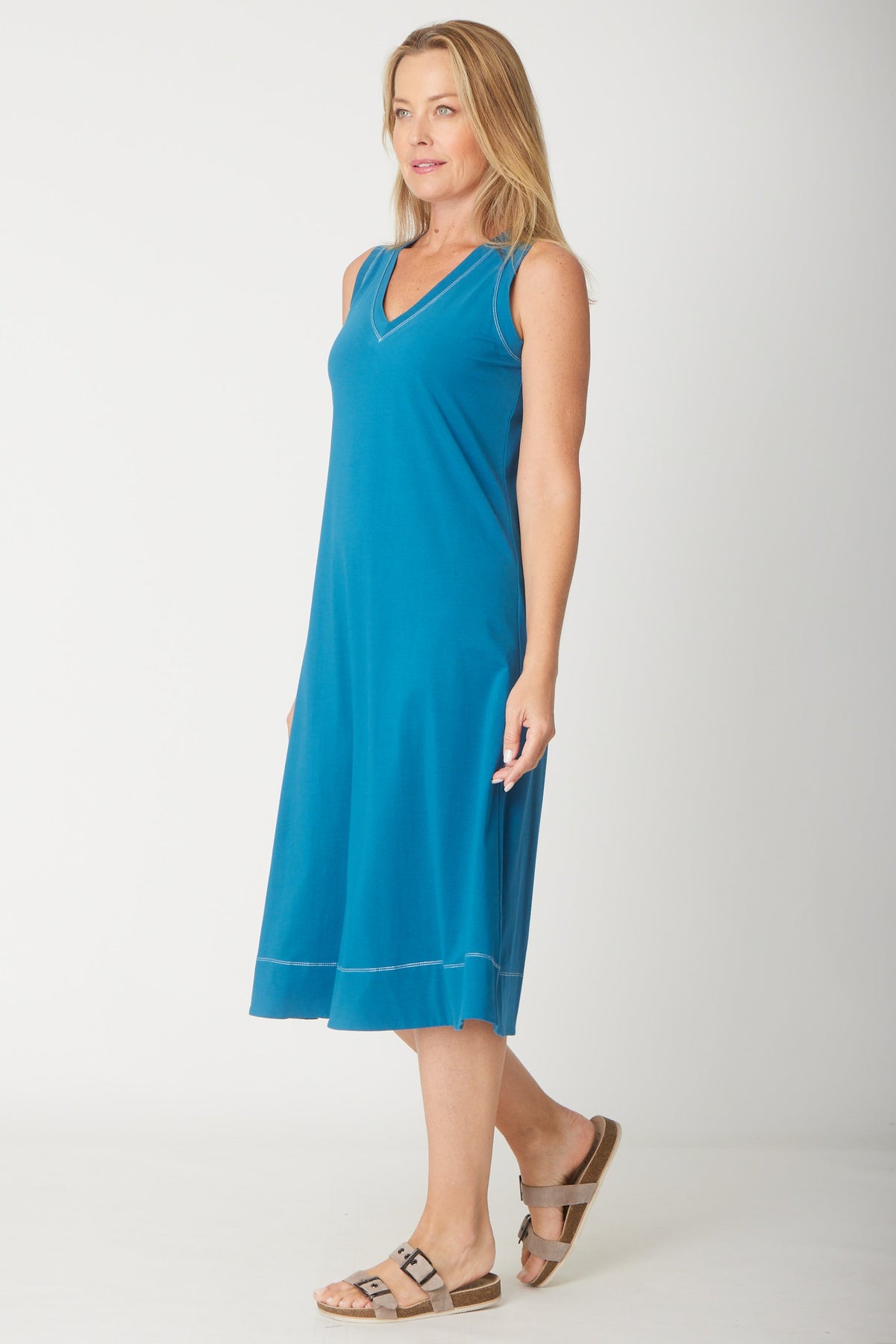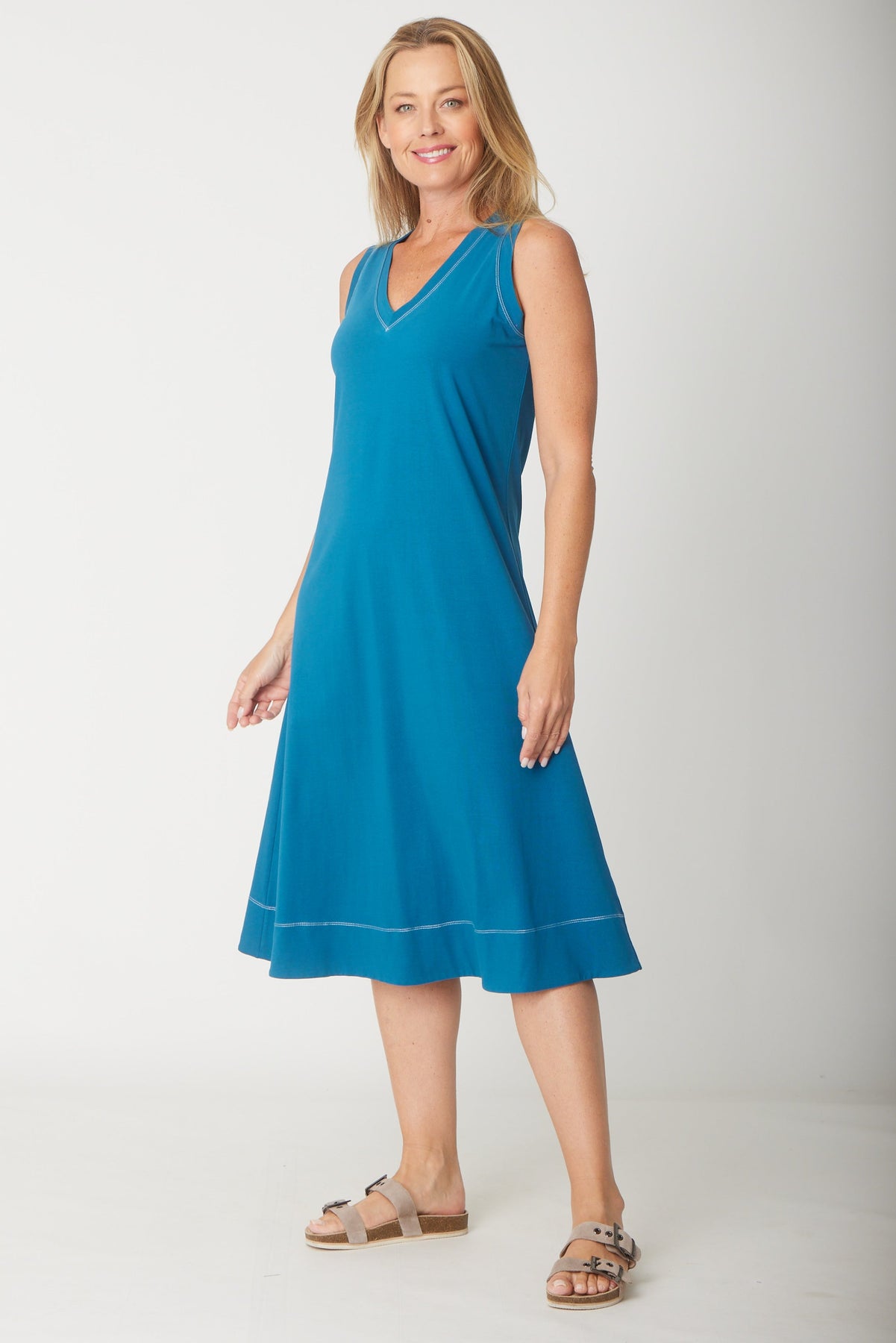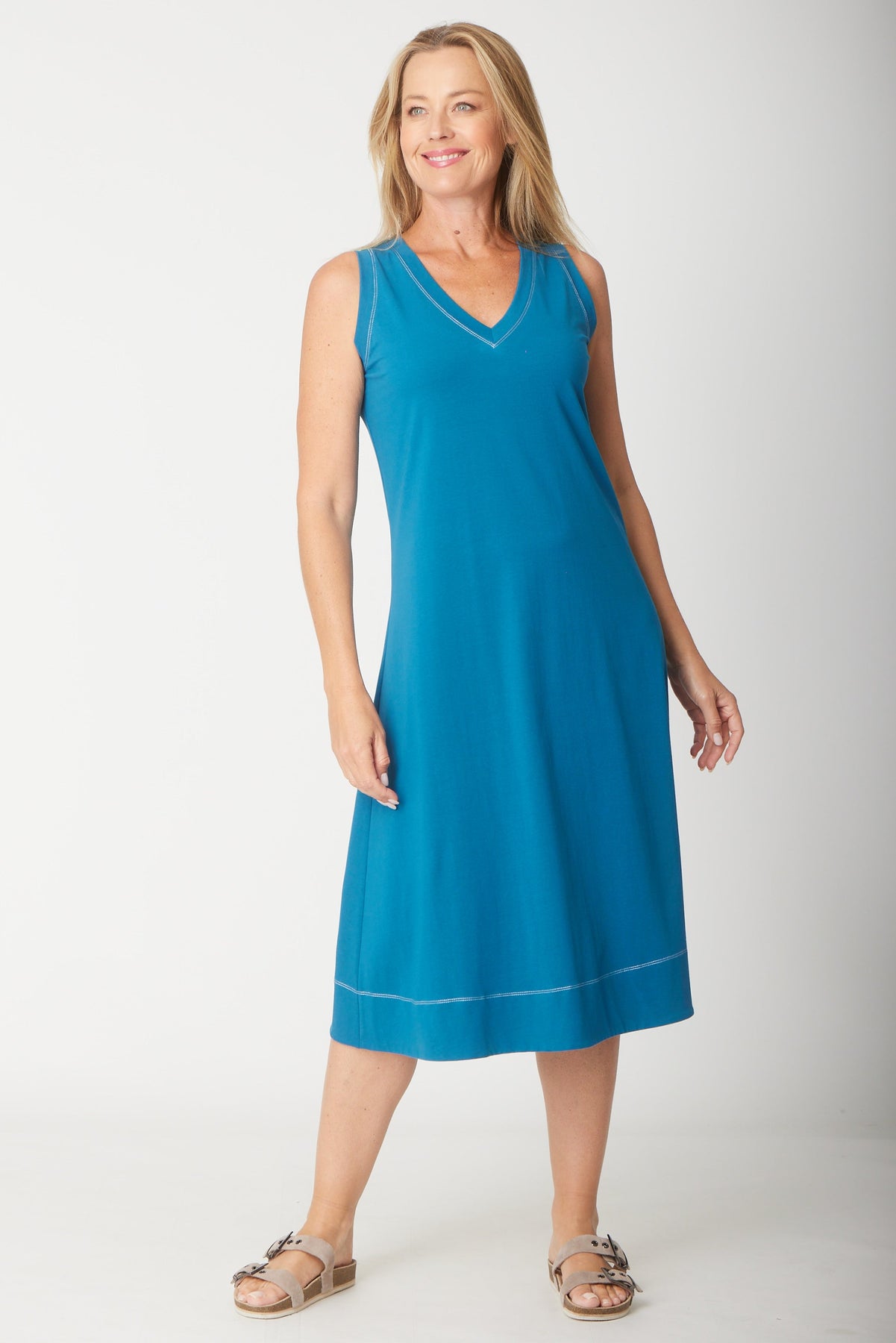 Effortless elegance meets everyday comfort in this sleeveless contrast dress. The flattering V-neckline and fit-and-flair silhouette create a polished look that transitions seamlessly from office to evening. Crafted from stretch cotton jersey fabric, this midi-length piece moves with you while contrast stitching adds visual interest. The built-in stretch ensures all-day comfort without compromising on style. Perfect for those seeking a versatile wardrobe staple that looks as good as it feels.