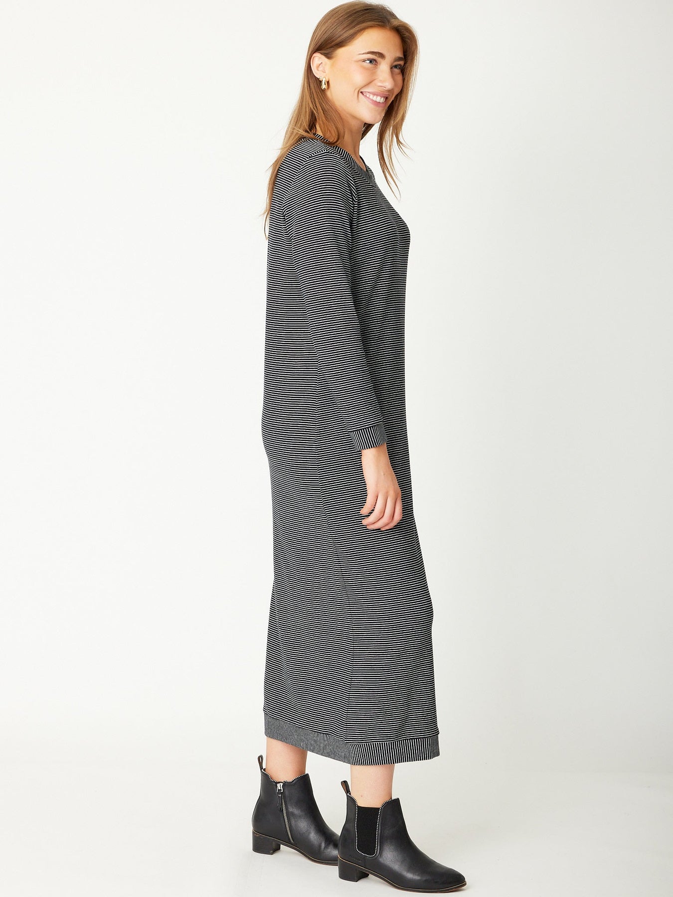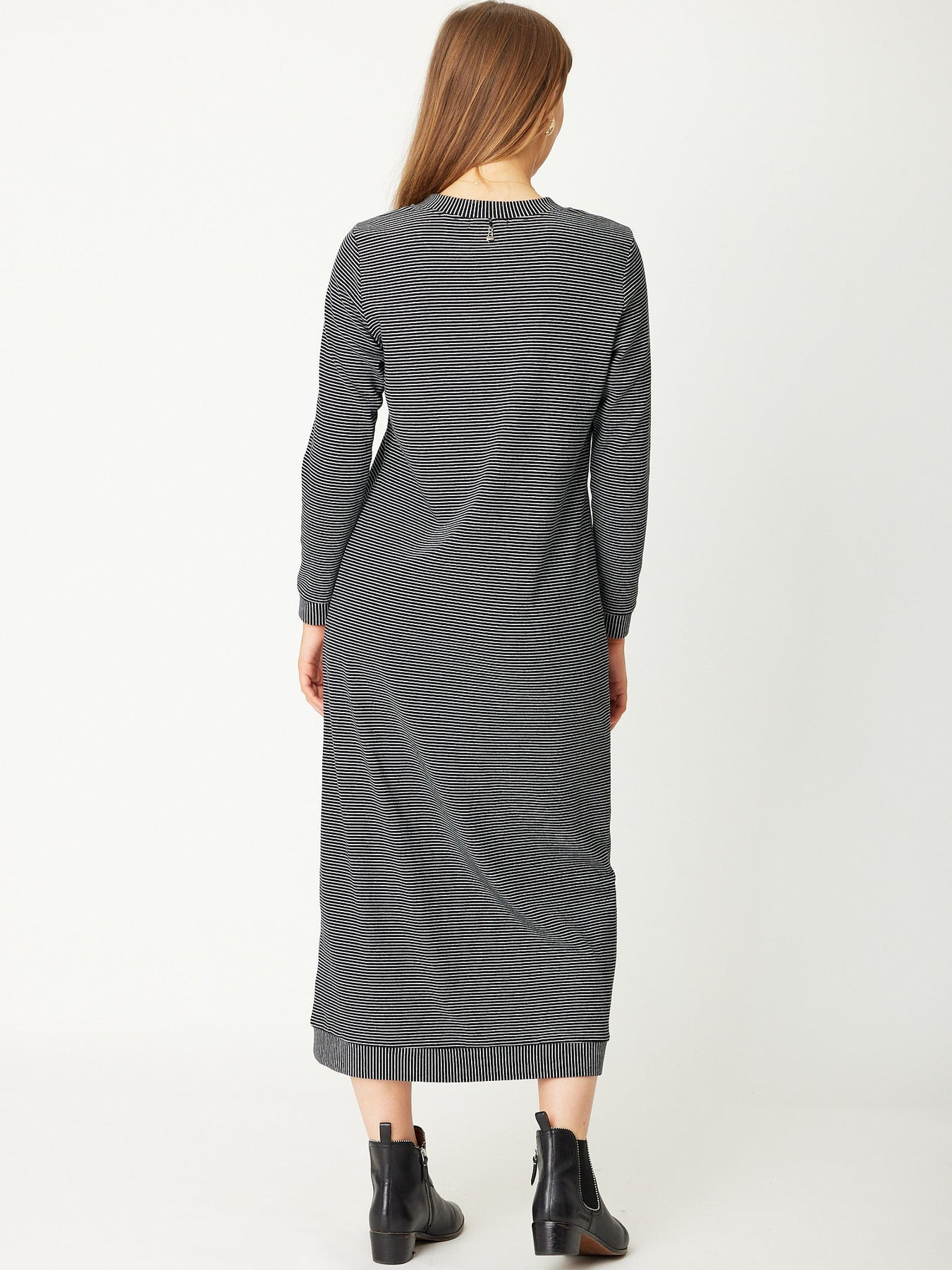 Elevate your everyday wardrobe with this sophisticated stripe BLACK / WHITE cotton stretch dress. Crafted from breathable cotton blend fabric with built-in stretch, it moves with you for all-day comfort and confidence. The timeless long sleeves and flowing maxi length create an effortlessly elegant silhouette perfect for any occasion—from casual outings to semi-formal events. The classic stripe pattern adds visual interest while remaining versatile enough to pair with your favourite accessories. Designed for the modern woman who values both style and comfort, this dress is a wardrobe essential that works harder than it looks.