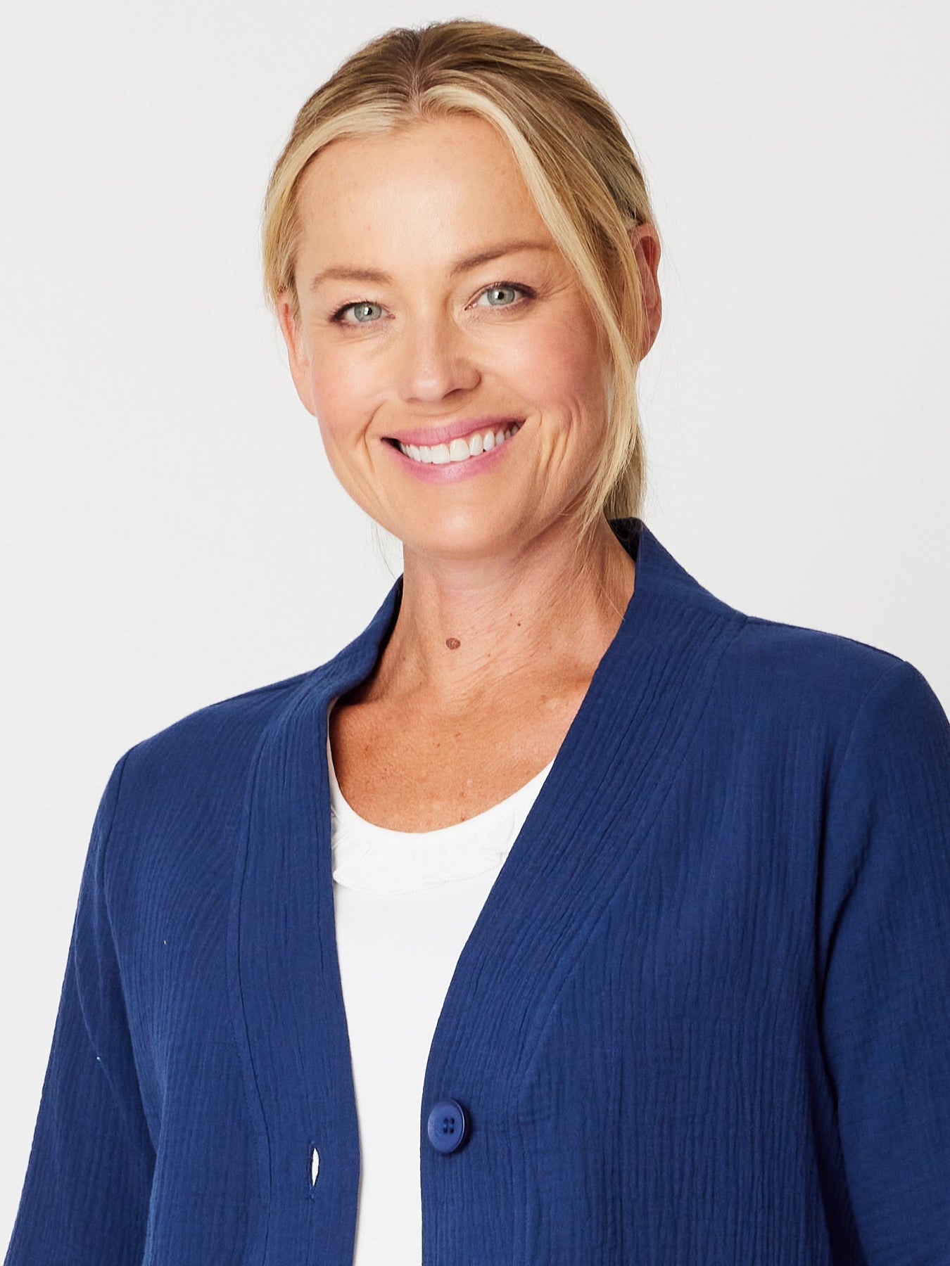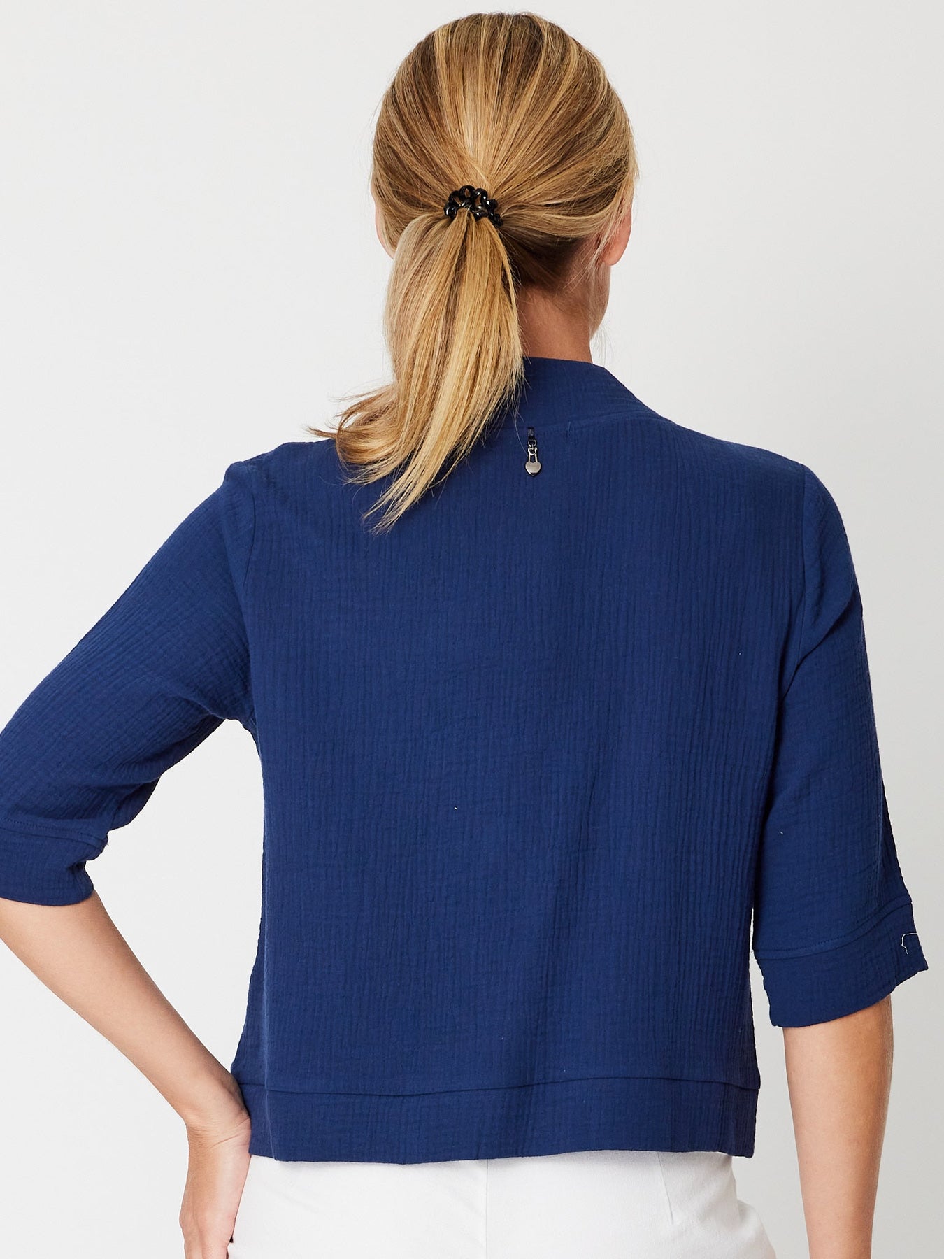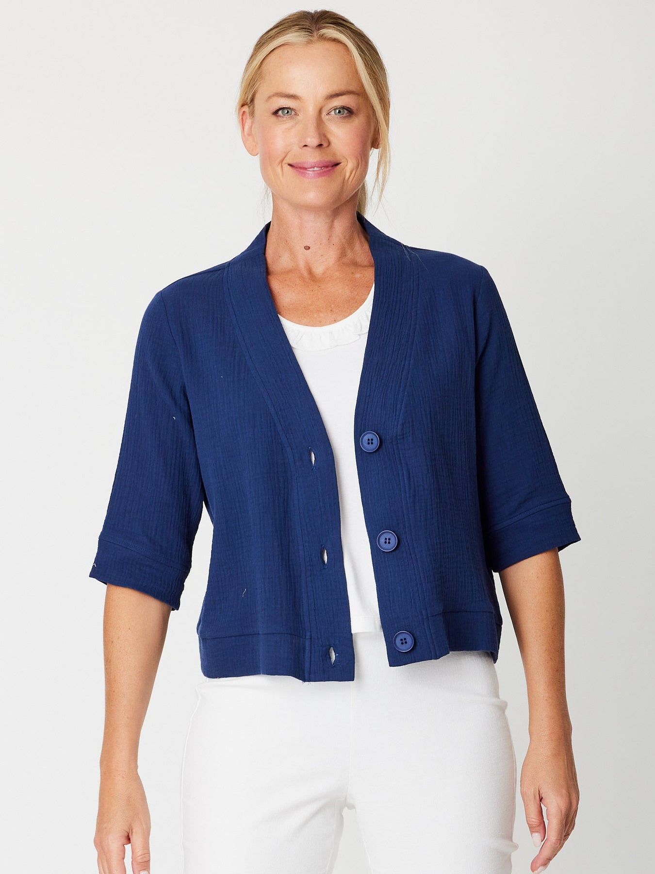 Effortless layering meets timeless style with this cotton NAVY button-through jacket. Crafted from breathable cotton, it features generous self-coloured buttons and flattering 3/4 sleeves that work beautifully with any wardrobe. Perfect for transitional seasons, this versatile piece adds polish to casual outfits while remaining comfortable enough for all-day wear. A wardrobe essential that delivers both sophistication and practicality.