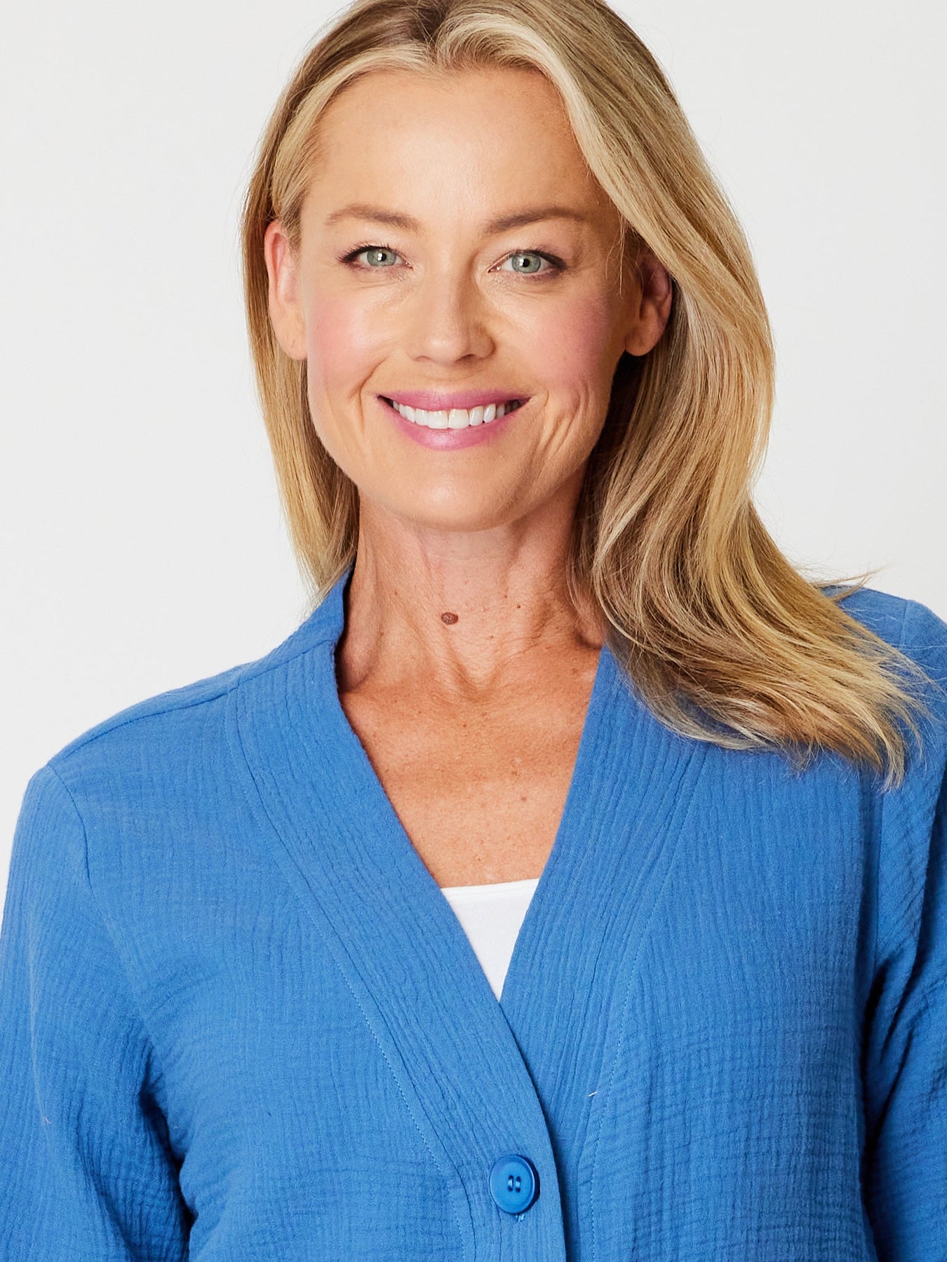 Effortless layering meets timeless style with this cotton BLUE button-through jacket. Crafted from breathable cotton, it features generous self-coloured buttons and flattering 3/4 sleeves that work beautifully with any wardrobe. Perfect for transitional seasons, this versatile piece adds polish to casual outfits while remaining comfortable enough for all-day wear. A wardrobe essential that delivers both sophistication and practicality.