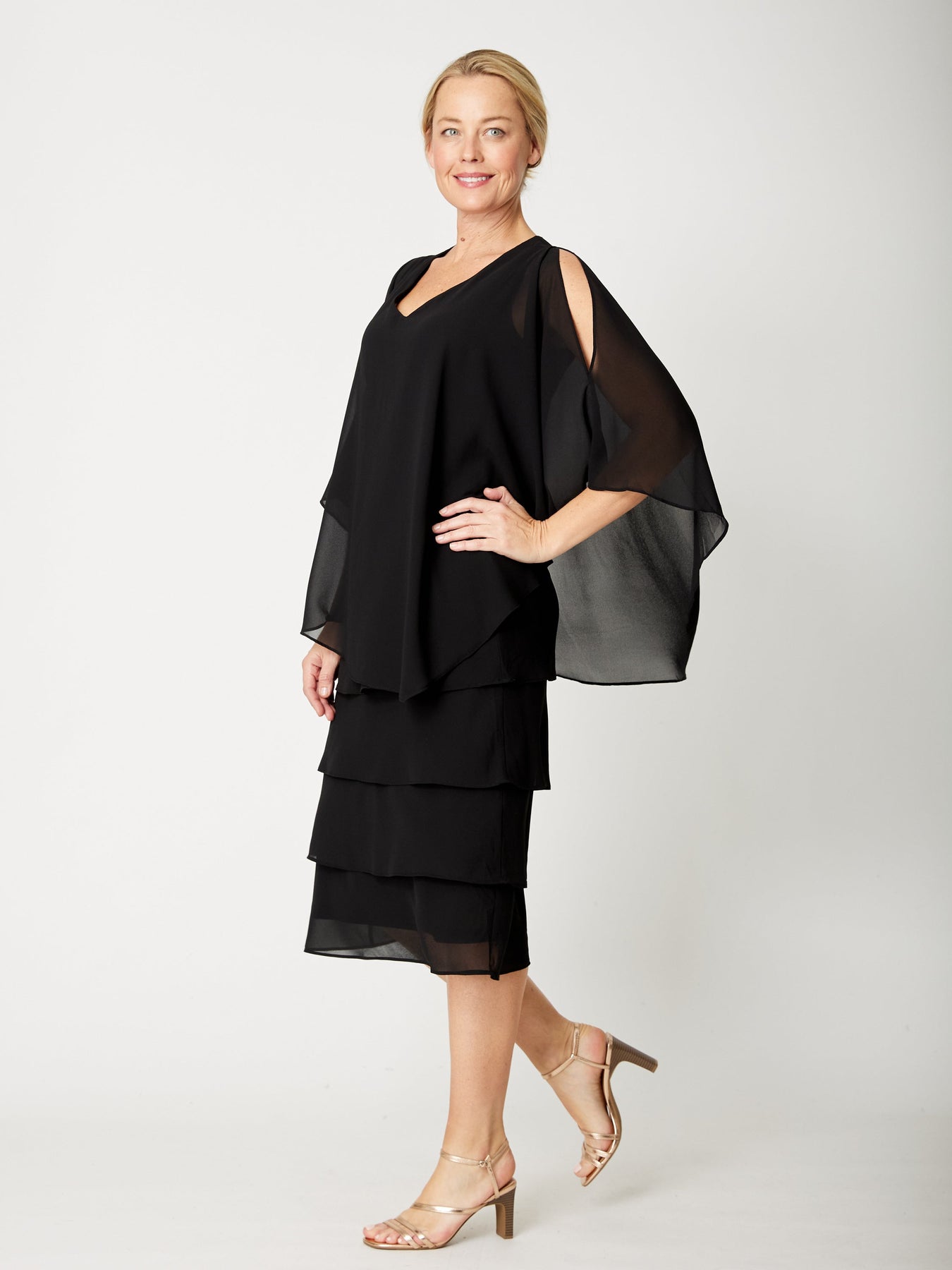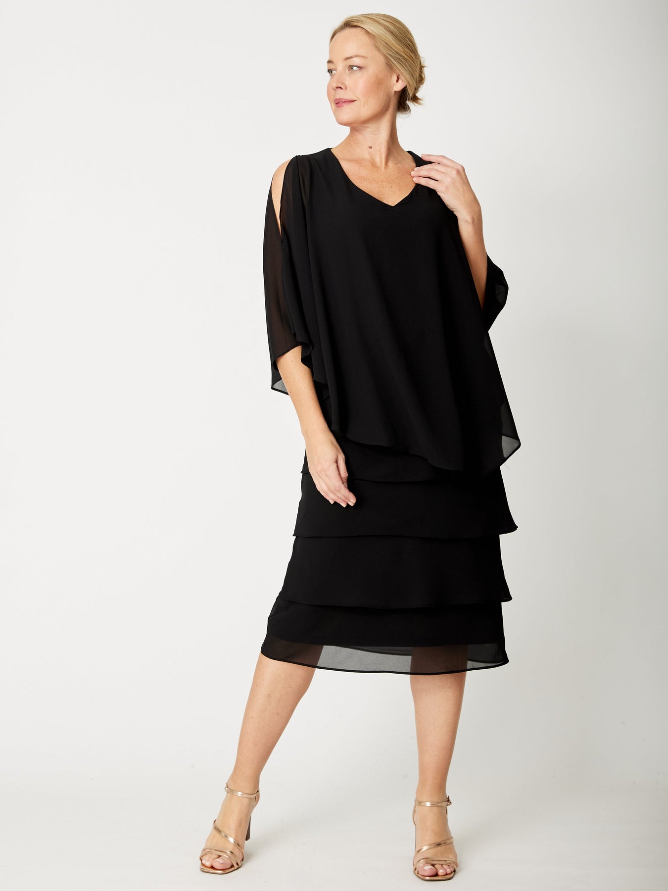 Looking for that special occasion outfit? This stunning tiered chiffon dress features beautifully flattering layered tiers and elegant cape-like sleeves that create a graceful silhouette. The stretch knit lining ensures comfort and ease of movement, making it perfect for weddings, christenings, and special events.