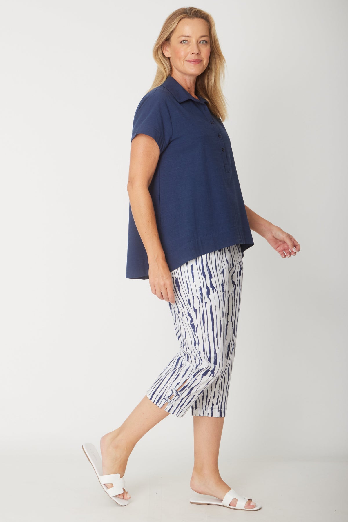 For collar enthusiasts, this 1/4 button shirt delivers timeless style with modern comfort. The short sleeves keep you cool and breezy, while the flattering high-low hemline adds contemporary flair to your everyday wardrobe. Perfect for layering or wearing solo, this versatile piece transitions effortlessly from casual outings to relaxed work settings. A wardrobe essential that combines classic design with contemporary edge.